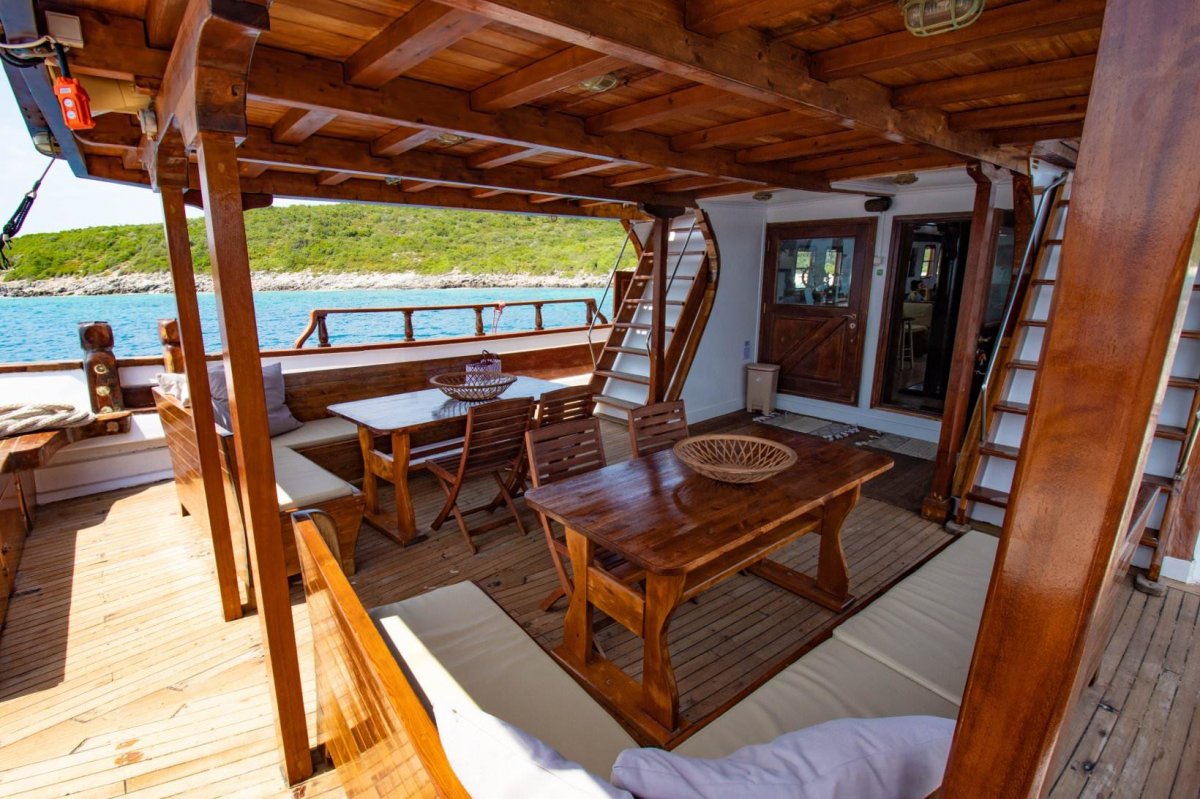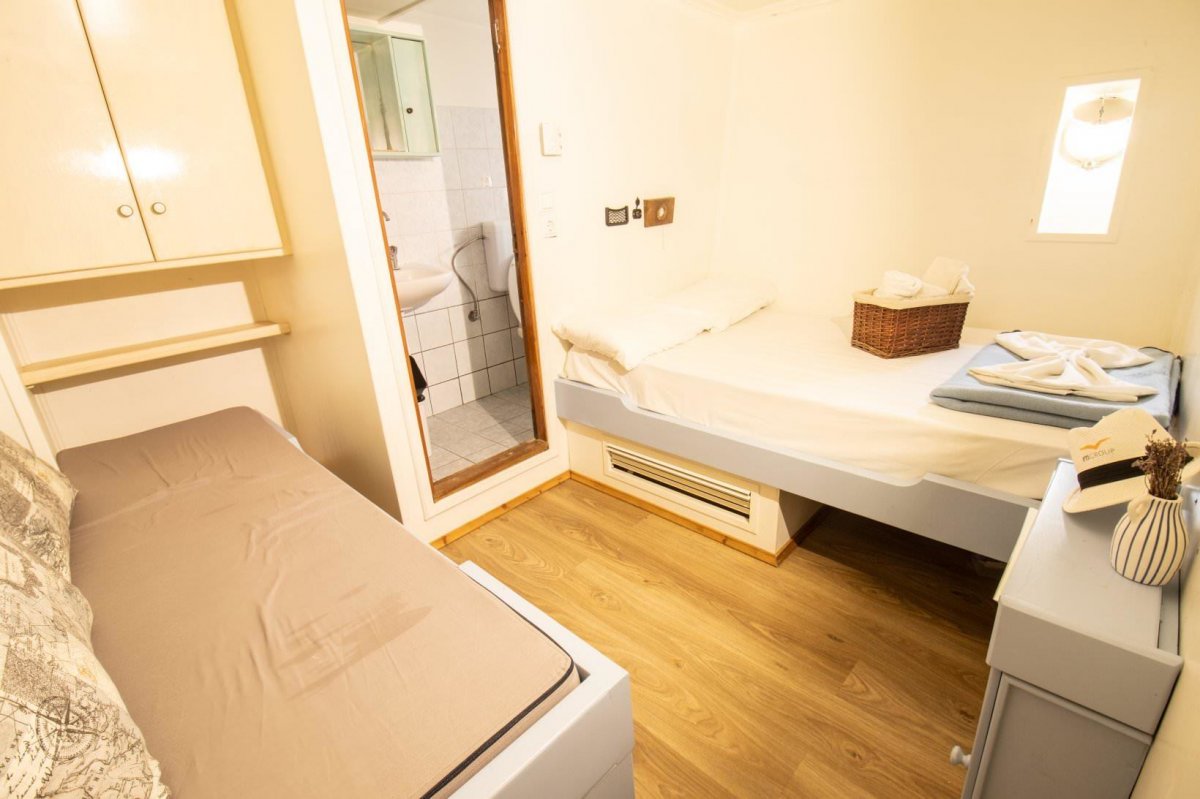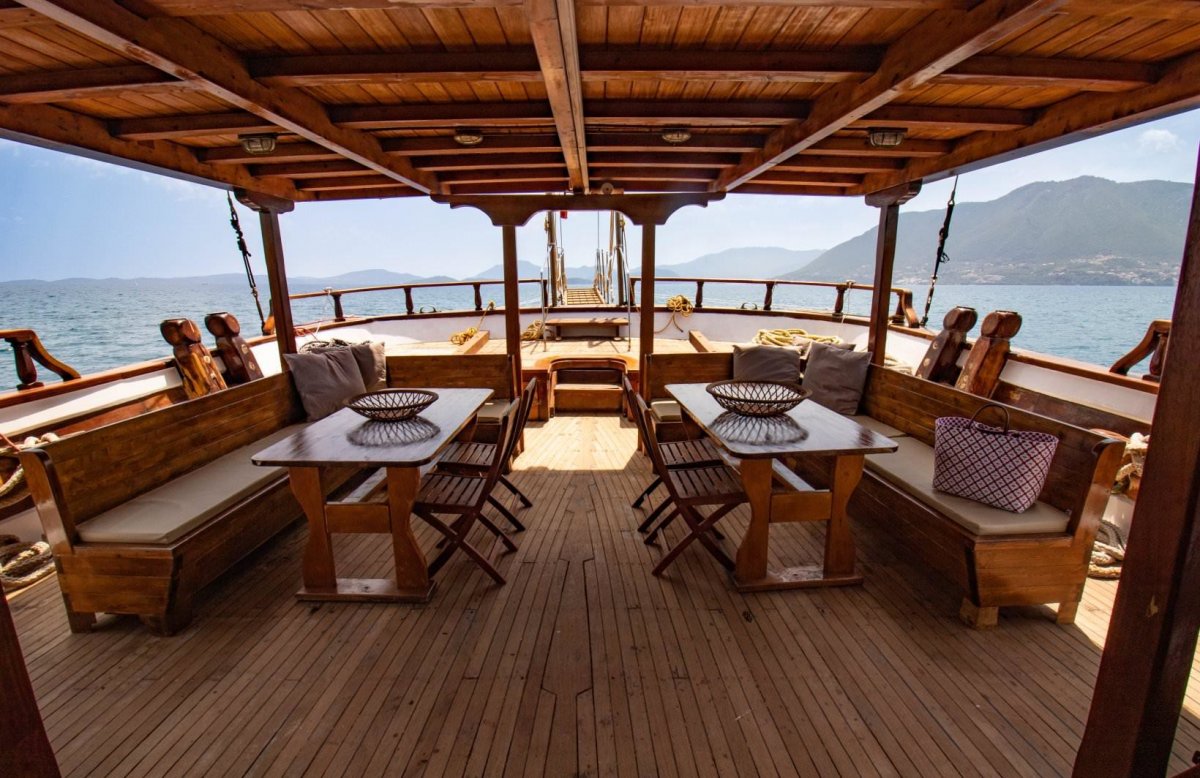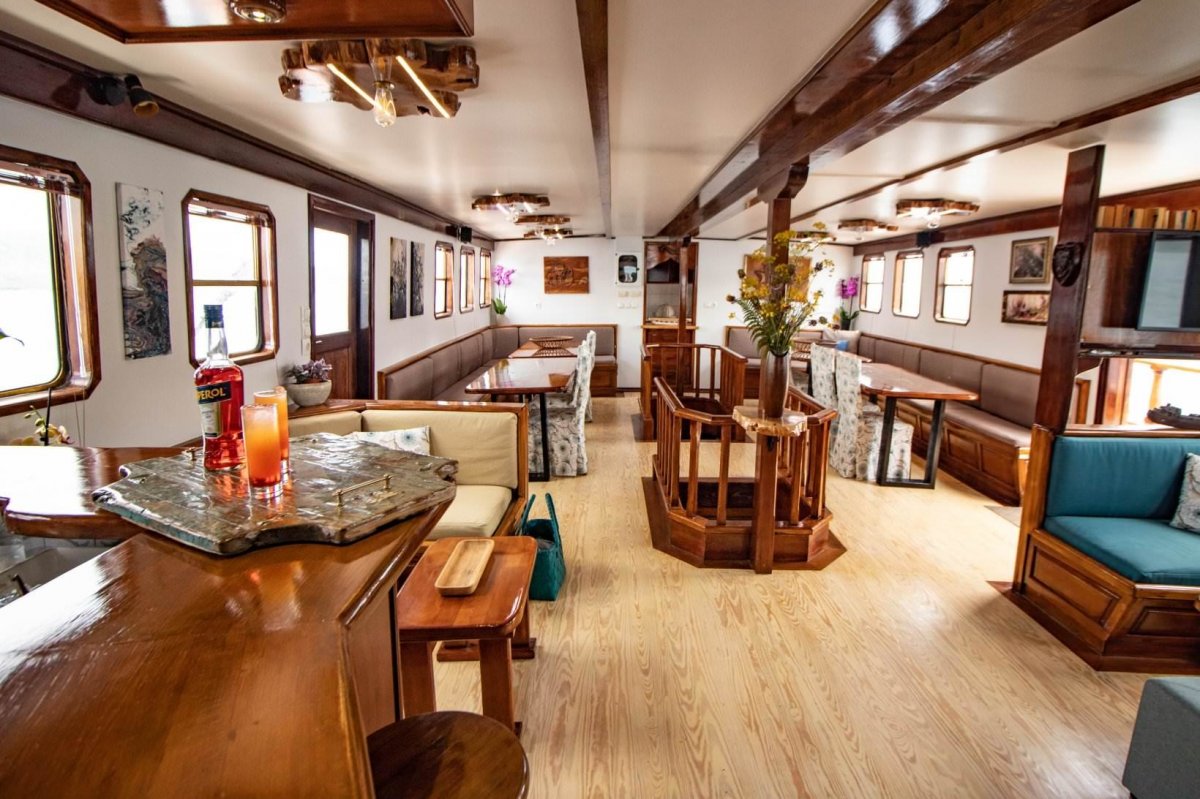 Die MS Aegeotissa II verfügt über eine Lounge im Innenbereich mit angrenzender Bar sowie über einen großzügigen Essbereich im Freien, in der Sie Ihre Mahlzeiten genießen oder sich einfach nur zurücklehnen und entspannen können! Auch das große Sonnendeck lädt mit einer gemütlichen Lounge und Liegekissen ein, es sich bequem zu machen, zu entspannen und zu genießen. Für Abwechslung auf dem Wasser sorgen ein Stand-up-Paddel und ein Kajak.
