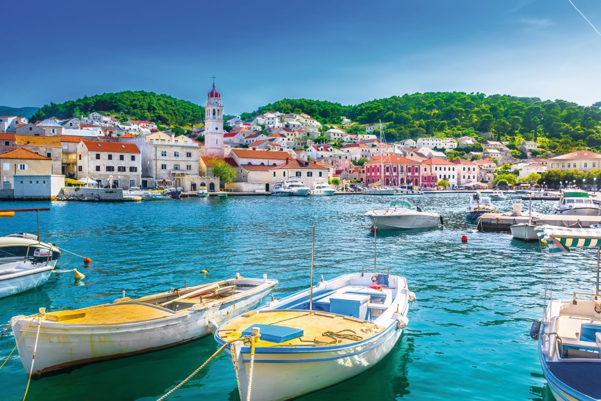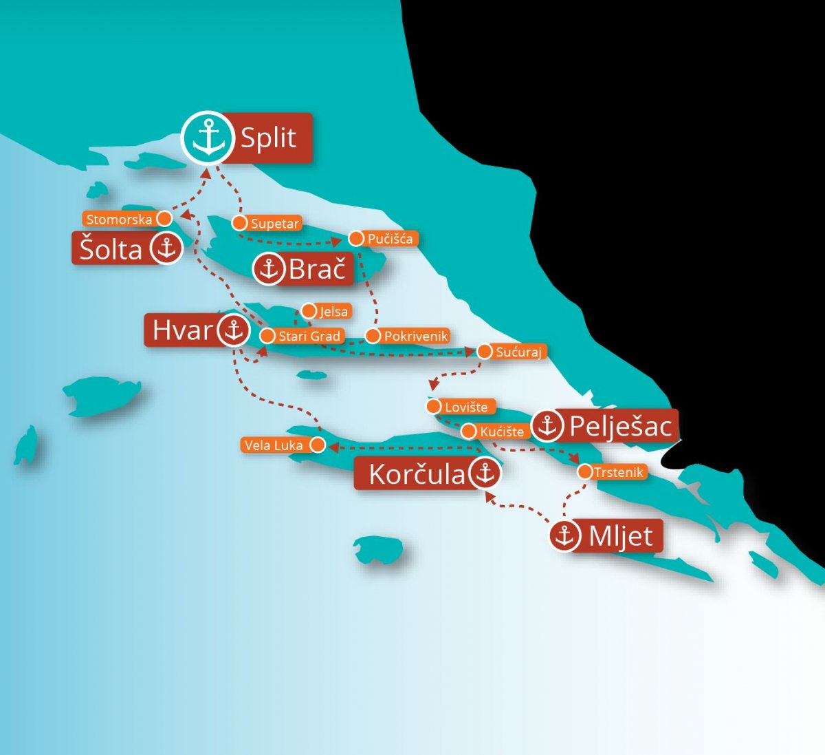 Dobrodošli u Hrvatsku! Gegen Mittag werden wir von Kapitän Luka und seiner Crew herzlich an Bord der MS Meridijan – unserem zu Hause für die kommenden Tage – begrüßt. Während des Mittagessens nehmen wir Kurs auf die Insel Brač und erreichen Supetar, wo wir zu unserer ersten Radtour starten. Über die Küstenstraße geht es in den nördlichen Teil der Insel, vorbei an den Fischerdörfern Splitska und Postira, bis nach Pučišća, die "Stadt des Marmors". Pučišća ist ein wahres Freilichtmuseum, das auf eine lange Steinmetztradition zurück blickt, wovon zahlreiche historische Gebäude, Kirchen und kleine Plätze zeugen. Der Rest des Tages steht zur freien Verfügung. Viele Restaurants und Cafés sorgen für Leben im Zentrum und urige Gassen laden zum Erkunden ein. Übernachtung im Hafen von Pučišća.