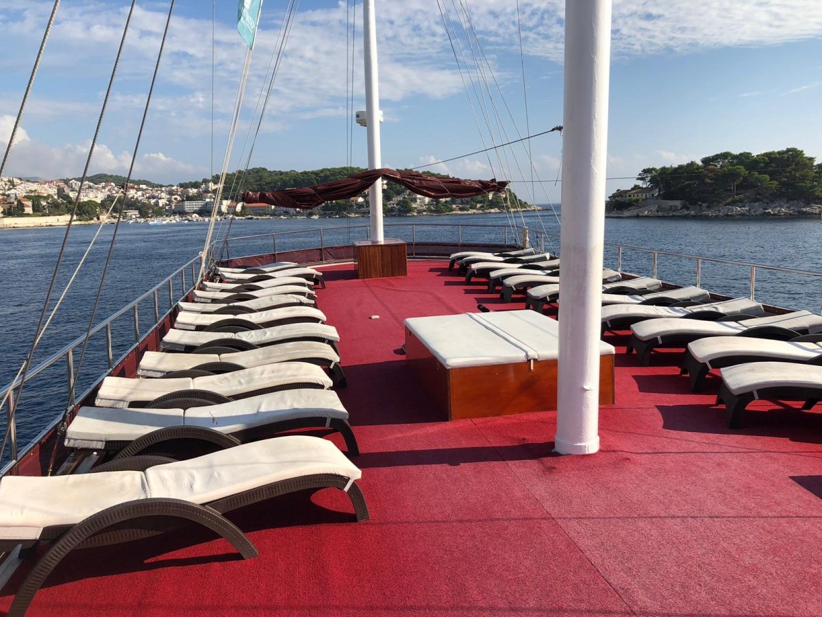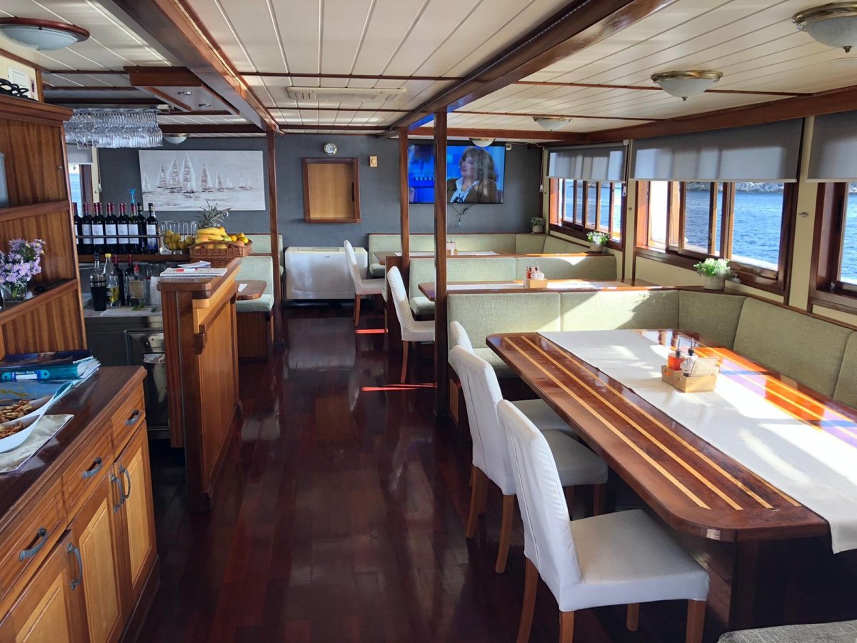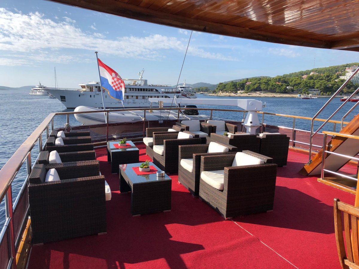 Der Salon bietet ausreichend Platz für alle Gäste zu den Mahlzeiten und verfügt über eine gute bestückte Bar. Im Außenbereich auf dem Hauptdeck und im Lounge-Bereich auf dem Oberdeck genießt man erfrischende Drinks in gemütlicher Atmosphäre. Auf dem 100 m² großen Sonnendeck mit bequemen Sonnenliegen und Sonnensegel findet garantiert jeder seinen Lieblingsplatz und die Badeplattform sorgt für einen komfortablen Ausstieg aus dem Meer.