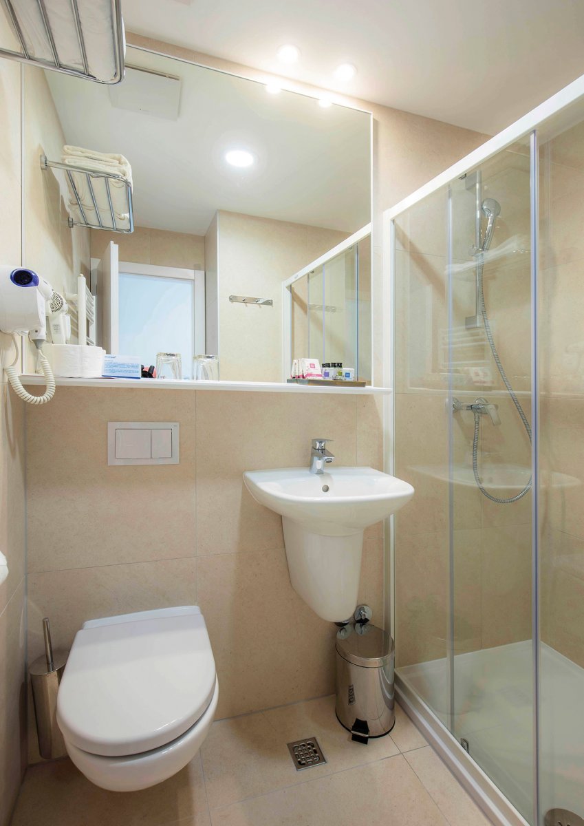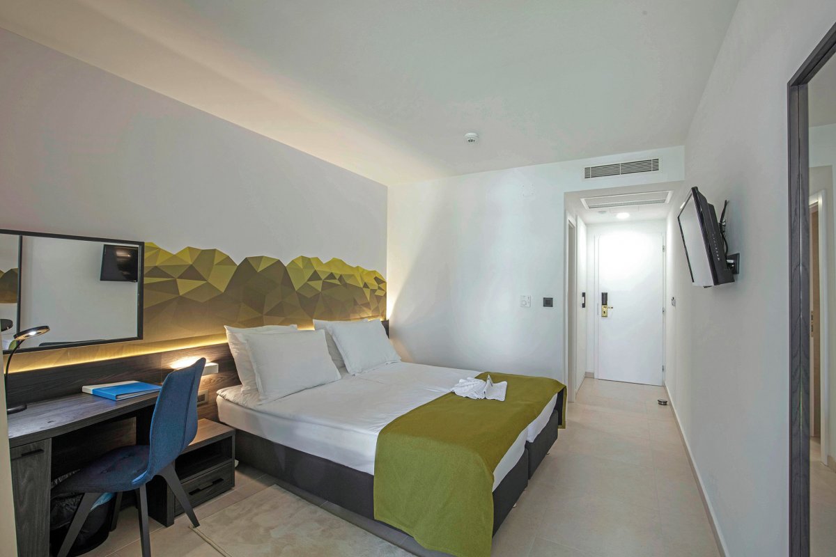 Das Haus ist nur durch die verkehrsfreie Uferpromenade vom ca. 30 m entfernten Strand getrennt. Die modern eingerichteten Zimmer verfügen über ein Bad mit Dusche, WC und Fön, eine individuell regulierbare Klimaanlage, Safe, Schreibtisch und Minibar.