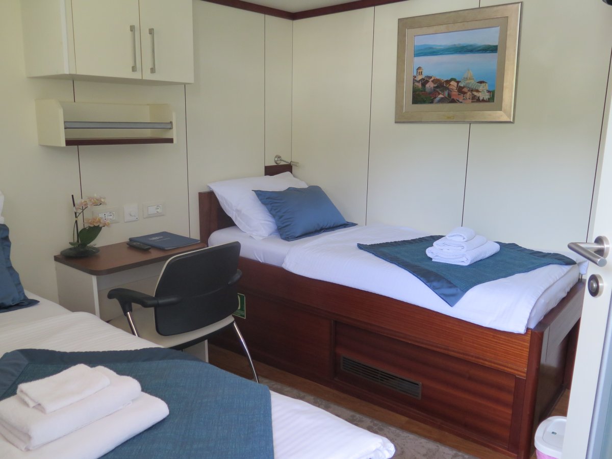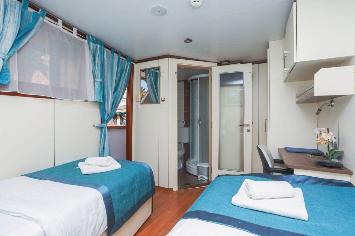 Herzlich Willkommen an Bord der MS Olmissum! Das Schiff der Premium-Superior-Kategorie wurde 2012 erbaut, ist knapp 35 m lang und 7,8 m breit. Insgesamt finden auf dem Schiff 34 Gäste in 17 Kabinen auf drei Decks Platz für einen erlebnisreichen Urlaub. Alle modern ausgestatteten Kabinen verfügen über zwei getrennte Betten oder ein Doppelbett, einen Kleiderschrank, Ablagefläche, Schreibtisch, TV, Klimaanlage, Safe und ein Bad mit Dusche, WC und Fön. Der helle und großzügige Salon bietet ausreichend Platz für alle Gäste zu den Mahlzeiten und verfügt über eine gute bestückte Bar. Im Außenbereich auf dem Hauptdeck und im Lounge-Bereich auf dem Oberdeck genießt man erfrischende Drinks in gemütlicher Atmosphäre. Auf dem 150 m² großen Sonnendeck mit bequemen Liegen und Sitzgruppen finden sowohl Sonnenhungrige als auch Schattensuchende garantiert ihren Lieblingsplatz und die Badeplattform sorgt für einen komfortablen Ausstieg aus dem Meer.