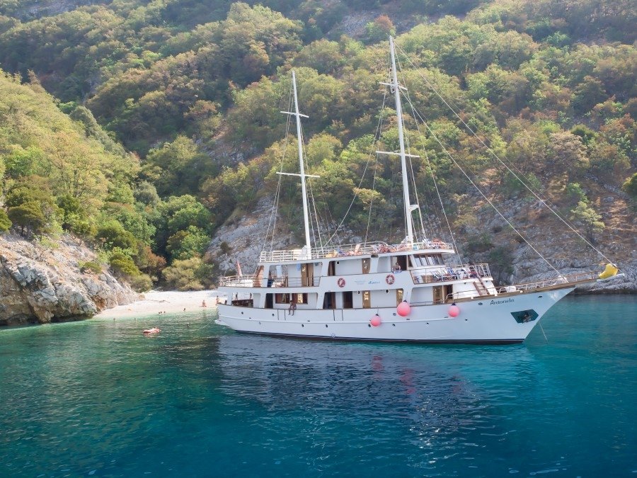 Herzlich Willkommen an Bord der MS Antonela! Das Schiff der Superior-Kategorie wurde 2007 erbaut, ist knapp 33 m lang und 7,5 m breit. Insgesamt finden auf dem Schiff 34 Gäste in 17 Außenkabinen auf drei Decks Platz für einen erlebnisreichen Urlaub.