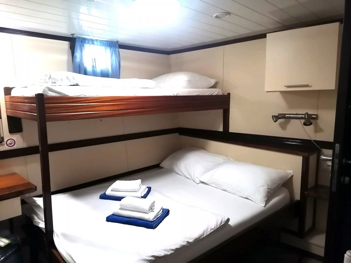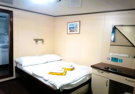 Alle Kabinen verfügen über zwei getrennte Betten oder ein Doppelbett (Doppelbett-Kabinen auch als 3er Belegung möglich), einen Kleiderschrank, Ablagefläche, Klimaanlage, Safe und ein Bad mit Dusche, WC und Fön.