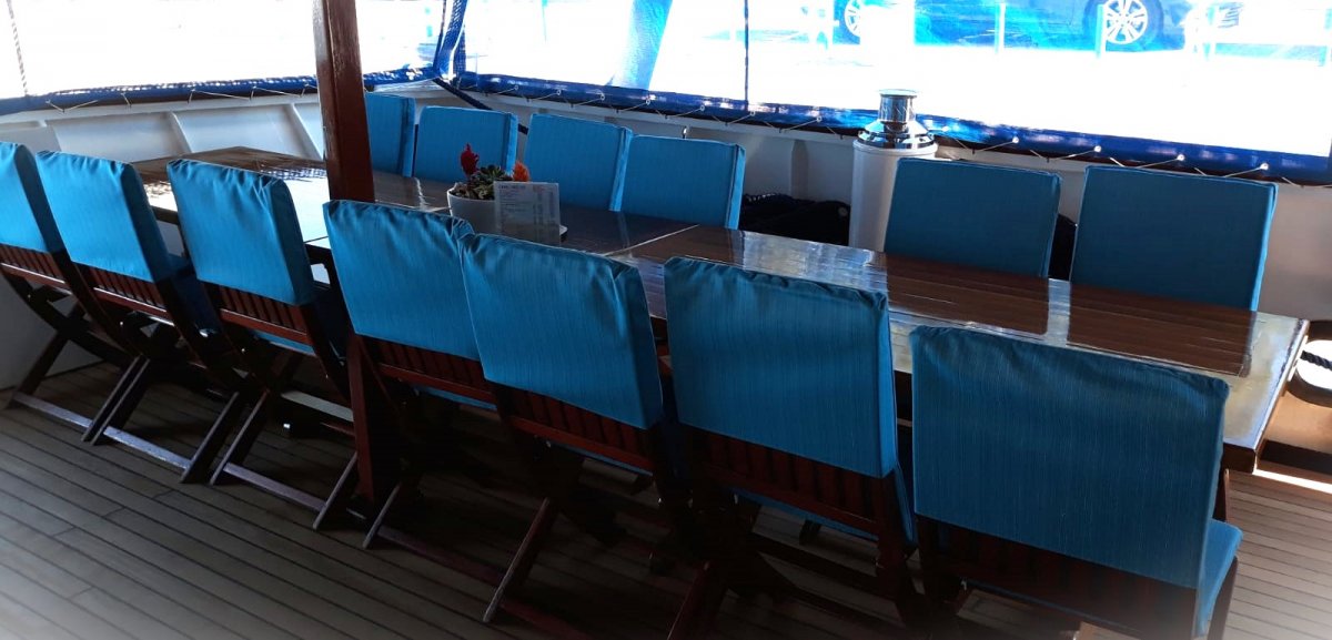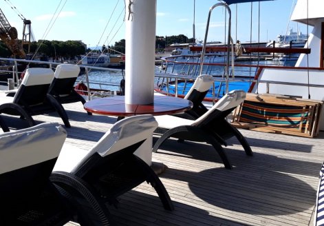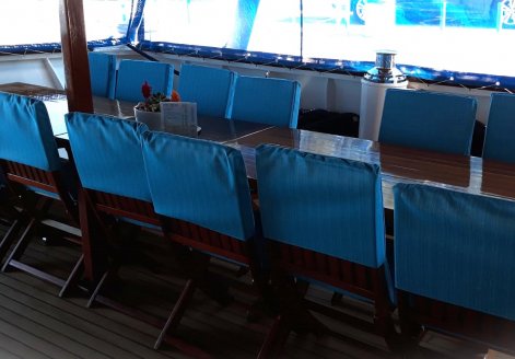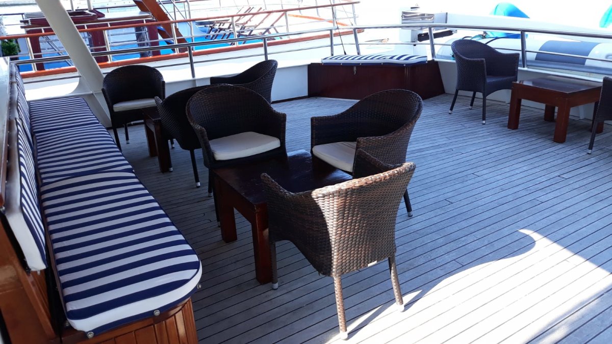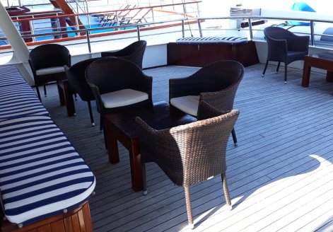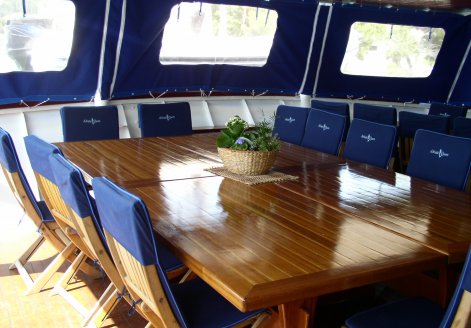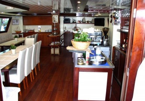 Der Salon bietet ausreichend Platz für alle Gäste zu den Mahlzeiten und verfügt über eine gute bestückte Bar. Im Außenbereich auf dem Hauptdeck und im Lounge-Bereich auf dem Oberdeck genießt man erfrischende Drinks in gemütlicher Atmosphäre. Auf dem 75 m² großen Sonnendeck mit bequemen Sonnenliegen und Sonnensegel findet garantiert jeder seinen Lieblingsplatz und die Badeplattform sorgt für einen komfortablen Ausstieg aus dem Meer.