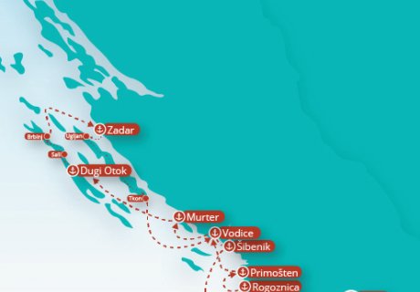 Kurze Schifffahrt zur Insel Ugljan. In Preko geht’s los mit dem Rad über die Inseln Ugljan und Pašman. Herrliche Natur, urige Steinhäuser und idyllische Badebuchten begleiten uns nach Tkon, wo die Jadranska Kralijca auf uns wartet. Nachmittags Schiffspassage durch den Nationalpark Kornati. Die Nacht verbringen wir in Vodice. Romantische Gassen, eine lebhafte Flaniermeile und eine Vielzahl gastromischer Angebote sorgen für einen tollen Tagesausklang.