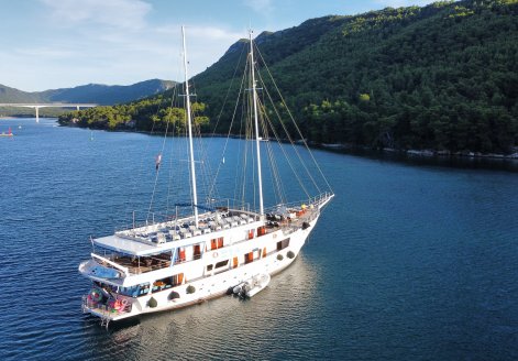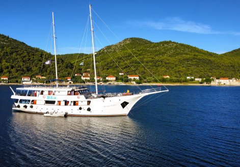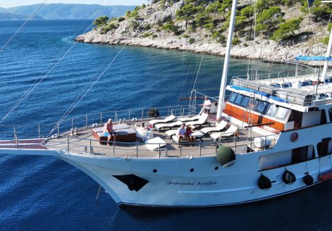 Herzlich Willkommen an Bord der MS Jadranska Kralijca! Das Schiff der Premium-Kategorie wurde 2006 erbaut, ist 40 m lang und 8,30 m breit. Insgesamt finden auf dem Schiff 30 Gäste in 15 Kabinen auf drei Decks Platz für einen erlebnisreichen Urlaub.