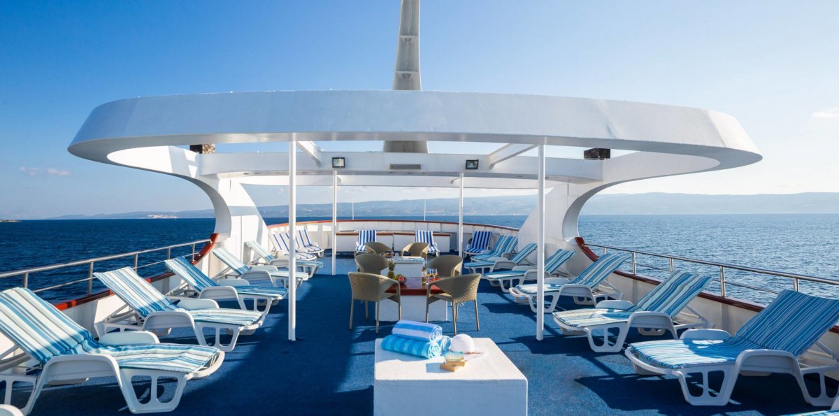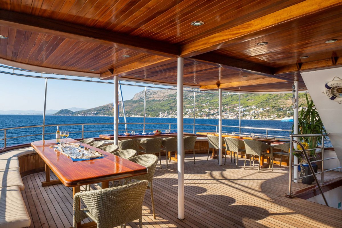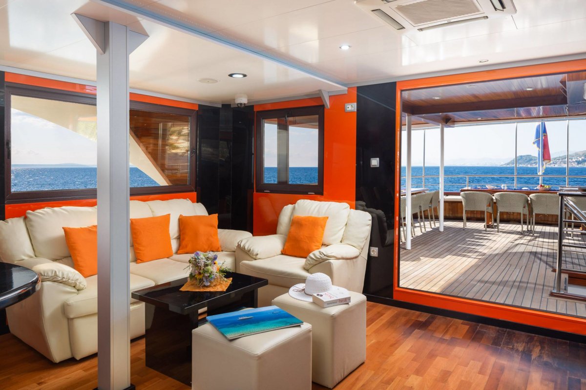 Der großzügig gestaltete Salon bietet neben einem kleinen Lounge-Bereich Platz für alle Gäste zu den Mahlzeiten. Auf dem Oberdeck laden Tische und Sitzgelegenheiten zu einem kühlen Drink und das weitläufige Sonnendeck mit schattenspendender Teilüberdachung verfügt neben bequemen Liegen über einen Jacuzzi, in dem Sie herrlich entspannen können.