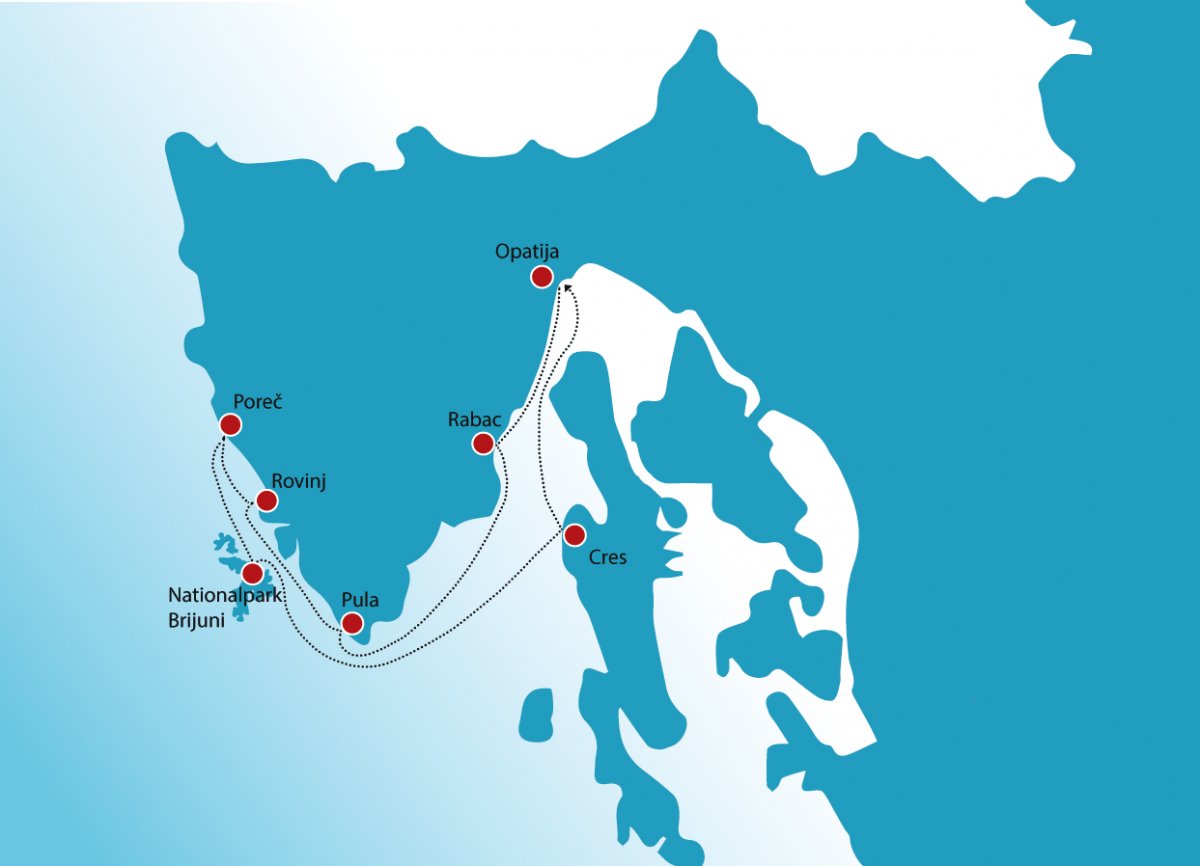 Ein letzter Badestopp in einer der tollen Buchten, bevor wir Kurs auf Opatija nehmen. Geführter Spaziergang durch das hübsche Seebad mit den tollen Villen, dem Park Angiolina und dem Lungomare, der vom Mädchen mit der Möwe bewacht wird. Zeit zur Einkehr in eines der tollen Lokale, bevor am Schiff nochmals die Gläser erklingen auf eine wundervolle und lustige Reise.