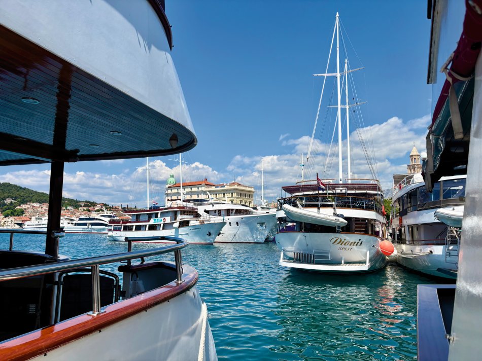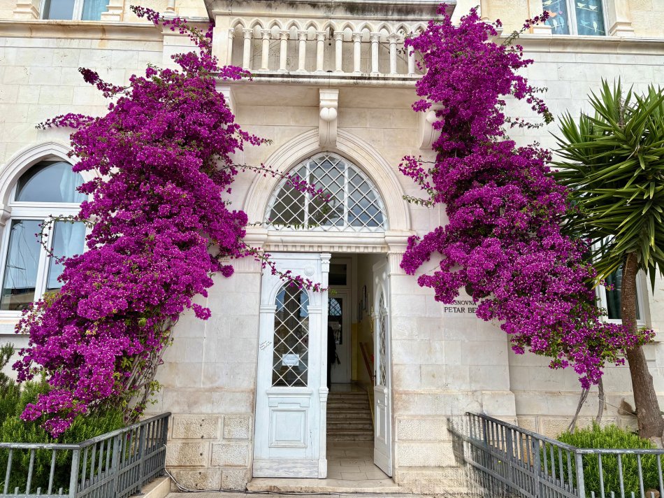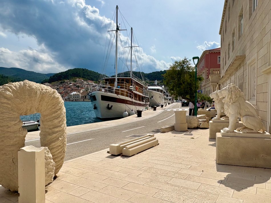 Nach einem gemütlichen Abend in Kućište haben wir die Halbinsel Pelješac bereits um 06:00 Uhr verlassen und uns abermals auf den Weg zur Insel Hvar begeben. Unser Ziel war der kleine Hafen von Sućuraj, in dem unsere Fahrräder abgeladen wurden und unsere Radtour über den westlichen Teil der Insel begann. Durch herrlich grüne und blühende Landschaften sind wir gemütlich bis ins kleine Dörfchen Bogomolje gefahren, wo wir in einem herrlich angelegten Blumengarten ein Päuschen einlegten und mit selbst gemachter Limonade, frisch aufgebrühtem Kaffee und erfrischendem Radler verköstigt wurden. Weiter ging es nochmals mit herrlichen Aussichten auf die glitzernde Adria bis in den kleinen Hafen Pokrivenik, wo die Räder wieder aufgeladen wurden. Unsere Meridijan hat dann gemächlich während des Mittagessens Kurs auf die Insel Brač genommen und im hübschen Städtchen Pučišća fest gemacht. Die Stadt des Marmors leuchtet in hellen Farben und lädt mit einer schönen Promenade zum Spazieren ein. Kurzer Besuch in der Steinmetzschule, wo man den geschickten Händen der Arbeiter zuschauen kann, wie sie den groben Stein in herrliche Kunstwerke verwandeln. Um 16:00 Uhr haben wir dann Kurs auf Supetar genommen. Da für die Nacht starker Wind aufziehen sollte, haben wir unsere Reise spontan nach Split fortgesetzt, um eine sehr raue Überfahrt am Morgen zu vermeiden. So hatten wir am Abend noch Zeit durch die trubelige Altstadt zu spazieren und nett in einem der zahlreichen Restaurants, Bars und Cafés einzukehren.