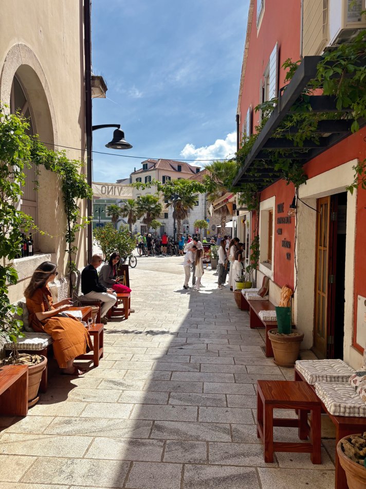 Unsere Bike & Cruise Tour durch Süddalmatien ist gestern gestartet. Einem Transfer zum Flughafen Berlin folgte um 05:30 Uhr das Treffen am Infopoint mit einem weiteren Reisegast. Kurzer Flug nach Split, wo wir von herrlichem Sonnenschein und 20 Grad empfangen wurden. Nach 30 Minuten Fahrzeit erreichten wir den Hafen von Split, in dem Samstag immer reges Treiben herrscht. Da wir erst um 12:00 Uhr auf unsere MS Meridijan einchecken konnten, haben wir uns in einem Café an der Hafenpromenade erst mal eine Erfrischung gegönnt. Nach und nach sind die Gäste, die individuell angereist sind, zu uns gestoßen – ein großes Hallo und ein herzliches Kennenlernen, bevor wir uns kurz vor 12:00 Uhr auf den Weg zu unserem Schiff begeben haben. Auch hier wurden wir herzlich von Kapitän Luka und seiner Crew und unseren beiden Radguides empfangen. Die Kabinen wurden bezogen und als um 13:30 Uhr auch die letzten Gäste an Bord waren, folgte dem Welcome-Drink sogleich ein hervorragendes Mittagessen an Bord. Zeitgleich haben wir den Hafen von Split verlassen und Kurs auf die Insel Šolta genommen. Frisch gestärkt wurden in Rogač die Fahrräder abgeladen und verteilt. Nach einer kurzes Einweisung begann unsere erste kleine Radtour über die Insel. Jeder folgte seinem eigenen Tempo während wir vorbei an Donje Selo bis nach Maslinica radelten. Herrlich blühende Natur und tolle Ausblicke auf die tiefblaue Adria waren unsere Begleiter. In Maslinica angekommen, blieb Zeit für eine Erfrischung oder einen Kaffee, bevor wir den Rückweg antraten. Mit 18 km Länge war die Tour perfekt geeignet, um sich mit den Rädern vertraut zu machen und zu schauen, wie die Gruppe zusammen harmoniert. Zurück in Rogač wurden die Fahrräder wieder aufgeladen und die Meridijan nahm Kurs auf die Insel Brac. Bei einem Getränk und netten Gesprächen kam gegen 19:00 Uhr unser Übernachtungshafen Milna in Sicht. Zeit für ein individuelles Abendessen, einen Spaziergang entlang der Promenade und einen schönen Tagesausklang.