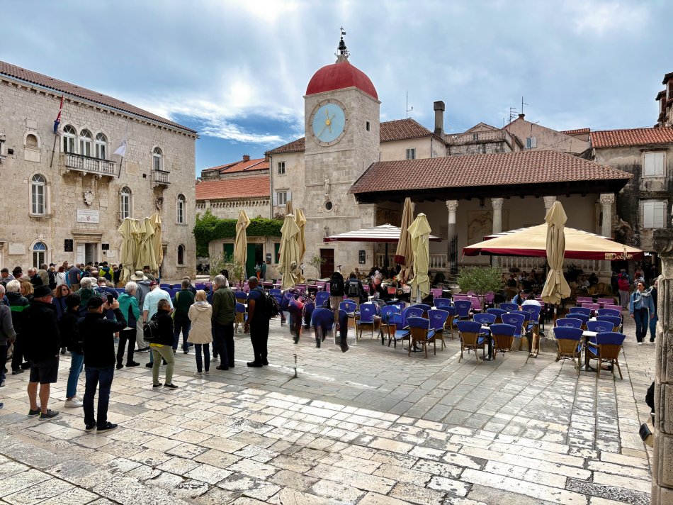 Da wir durch den aufziehenden Wind vorgestern Abend bereits in Split angekommen sind, hatten wir gestern den ganzen Tag Zeit um die tolle Altstadt mit dem Diokletianpalast zu erkunden. Für Gäste, die noch ein bisschen mehr von Kroatien sehen wollten, haben wir einen Busausflug nach Trogir organisiert. Nach dem Frühstück haben wir uns an der Pier getroffen und uns um 09:15 Uhr auf den Weg in die dalmatinische Perle begeben. Nach Ankunft in Trogir empfing uns Reiseleiterin Jesna zum Stadtrundgang. Anschließend blieb Zeit, um durch die engen Altstadtgässchen zu schlendern, die gespickt sind mit zahlreichen Geschäften, Cafés und Restaurants. Auch ein Bummel entlang der von Plamen gesäumten Promenade ist sehr zu empfehlen. Nach einer kleinen Erfrischungspause ging es um 12:30 Uhr mit dem Bus zurück nach Split, wo wir bereits am Schiff zu einem letzten gemeinsamen Mittagessen erwartet wurden. Der Rest des Tages stand zur freien Verfügung und der letzte Abend an Bord klang nochmals gesellig aus.