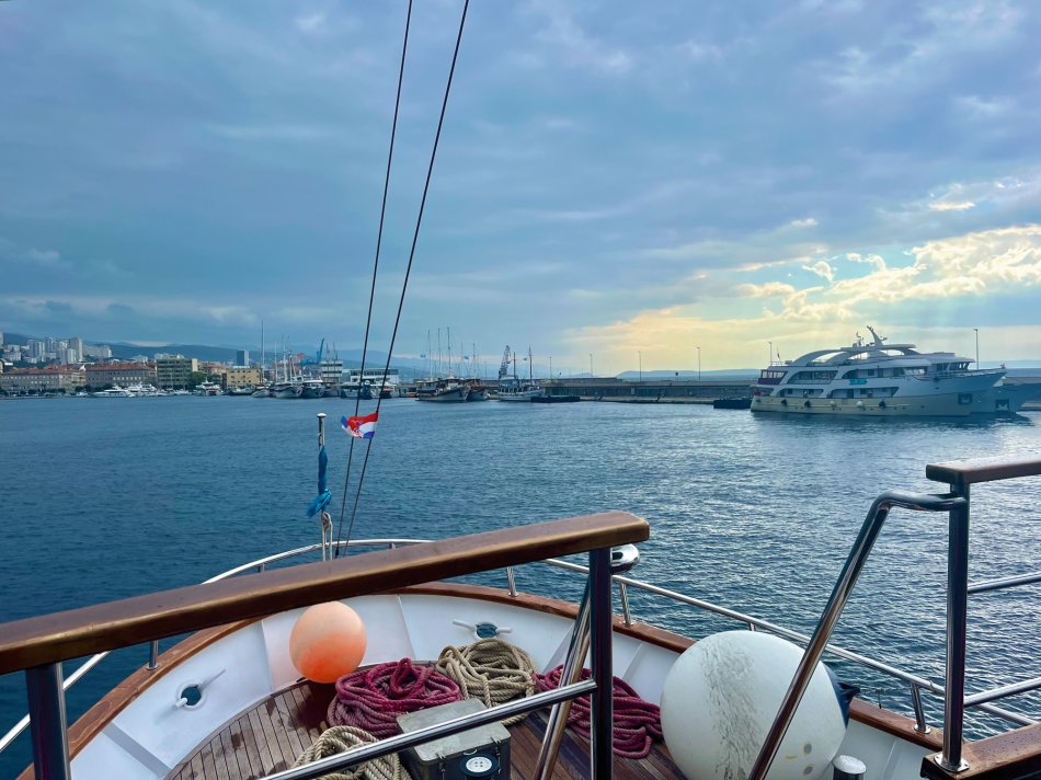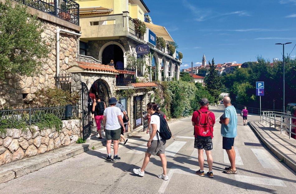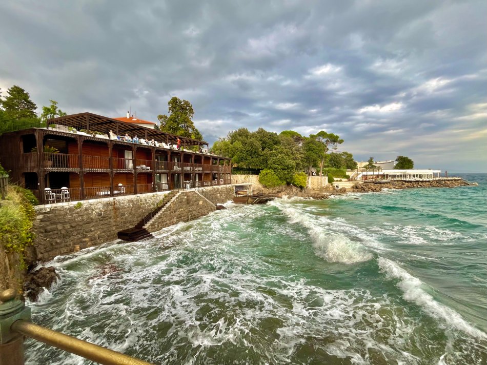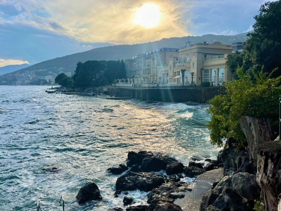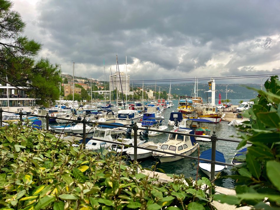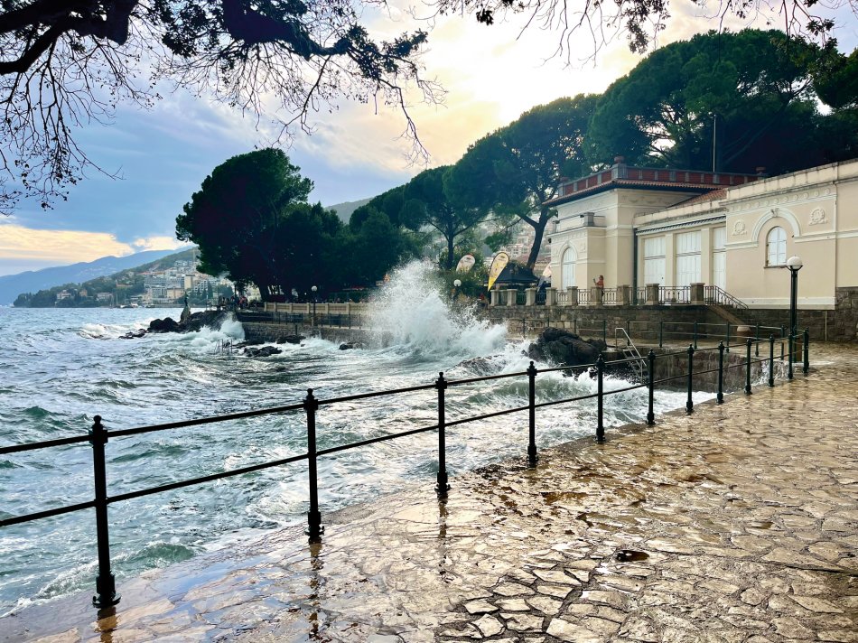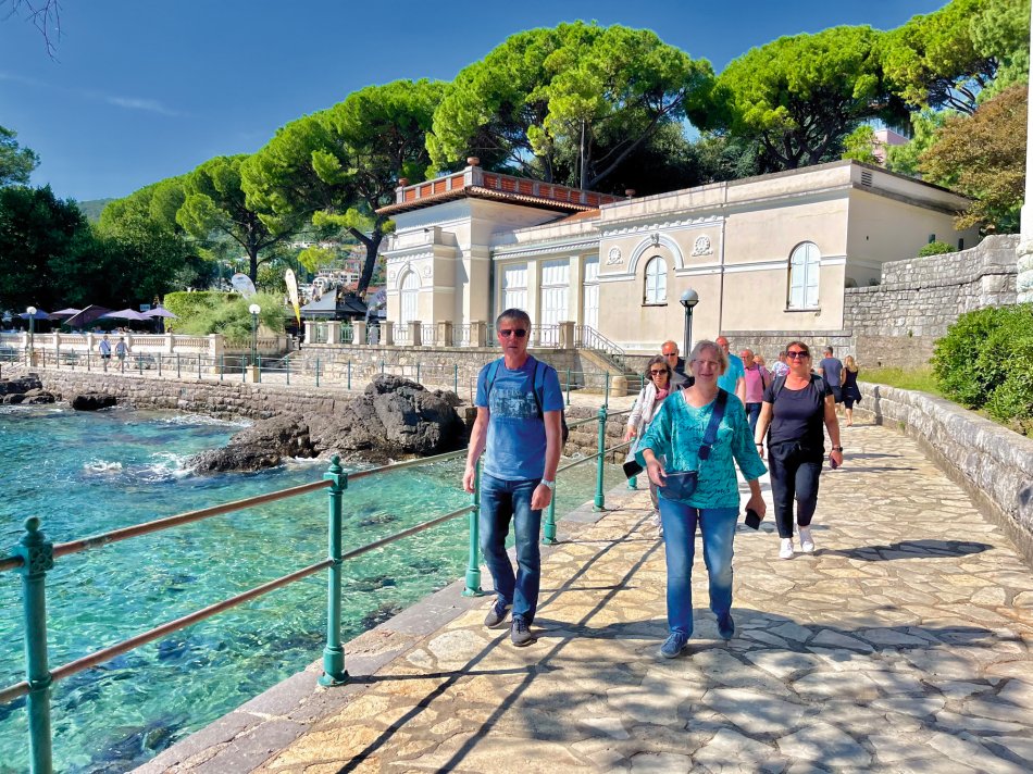 Wind Jugo hat uns gestern einen tüchtigen Strich durch die Rechnung gemacht, aber da wir ja Profis sind, haben wir schnell umdisponiert und immer einen Plan B parat. In der Nacht von Donnerstag auf Freitag hat Jugo wirklich gezeigt, was er kann. Demzufolge sind haben wir während des Frühstücks langsam das beschauliche Cres verlassen und uns anstatt nach Opatija, nach Rijeka begeben, da die Schiffe in Opatijas Hafen einfach nicht gut geschützt liegen. Die 3,5-stündige Überfahrt war ganz schön rauh und schauklig, aber um 12:00 Uhr haben wir den Hafen von Rijeka erreicht. Mittagessen an Bord und während des Desserts haben wir uns schon mal ganz herzlich bei unserer fantastischen Crew und unseren beiden Radreiseleitern Fredi und Valter verabschiedet. Um 15:00 Uhr sind wir zu Fuß bis zur Bushaltestelle von Rijeka gelaufen und haben um 15:20 Uhr den Bus nach Opatija genommen, der uns um 15:45 Uhr in dem hübschen Hafenstädtchen abgesetzt hat. Kleine Tipps zur Besichtigung und zur Einkehr erleichterte unseren Gästen den Aufenthalt im Kurort des 19. Jahrhunderts. Einem Spaziergang durch den üppig grünen Park Angolina folgte ein Bummel entlang des Lungomares und die Einkehr zum Abendessen. Jeder ist individuell mit Bus zurück nach Rijeka gefahren und wir haben uns noch auf einen Absacker am Schiff getroffen. Auch in der Nacht stürmte und gewitterte es heftig, aber in unseren Kabinen hat uns das gar nicht gestört.