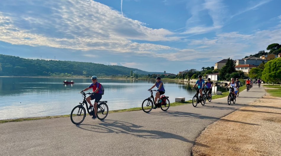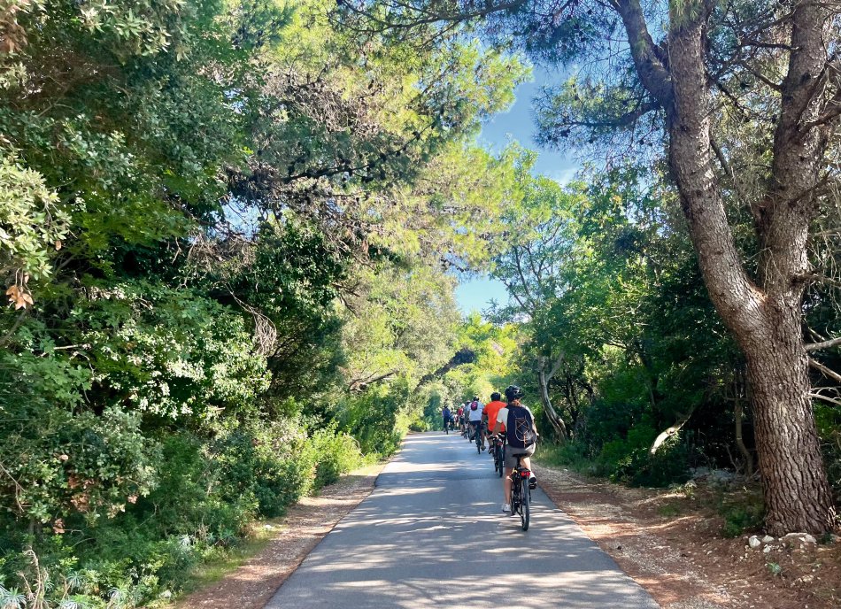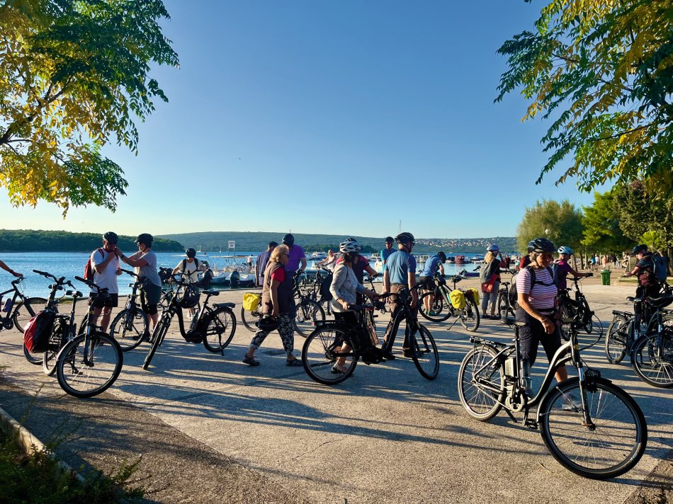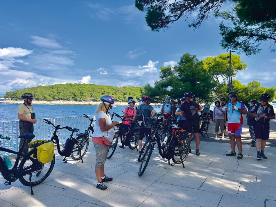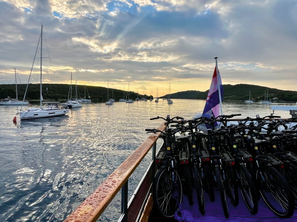 Um 08:00 Uhr haben wir mit unserer Meridijan Kurs auf die Insel Rab genommen. Pünktlich nach dem Frühstück sind wir in Lopar angekommen, die Fahrräder wurden abgeladen und wir starteten Kurs nach 09:00 Uhr zu unserer ersten Radtour. Zunächst ging es an den Paradiesstrand von Rab, wo wir kurz für ein Foto gestoppt haben. Weiter zu einem tollen Aussichtspunkt, bevor wir entlang der Uferpromenade Richtung Rad-Stadt geradelt sind. Ein herrlicher Weg, immer am Meer entlang, der im Sommer mit zahlreichen kleinen Cafés und Restaurants gespickt ist. Man merkt, dass sich die Saison langsam dem Ende entgegen neigt, da viele der kleinen Standcafés bereits geschlossen hatten, aber wir haben noch eine schöne Lokalität gefunden, bei der wir ein Stündchen am Wasser sitzen und das ein oder andere Getränk genießen konnten. Zum Mittagessen waren wir zurück an Bord unseres Schiffes in der Altstadt von Rab. Anschließend Zeit für ein kleines Nickerchen, bevor wir um 15:00 Uhr nochmals mit den Rädern starteten. Eine kurze Stecke entlang der Strandpromenade und durch den Steineichenwald, bis zu einer hübschen Badebucht mit kleinem Café. Hier war Zeit für eine Abkühlung und viele unserer Gäste sind in die Adria eingetaucht. Gegen 17:30 Uhr waren wir zurück am Schiff und jeder konnte den Abend individuell gestalten. Wir haben uns ein Taxi genommen und sind hinauf gefahren auf die andere Seite der Bucht ins Restaurant Kamenjak. Hier haben wir neben einem tollen Abendessen auch den atemberaubenden Ausblick genossen.