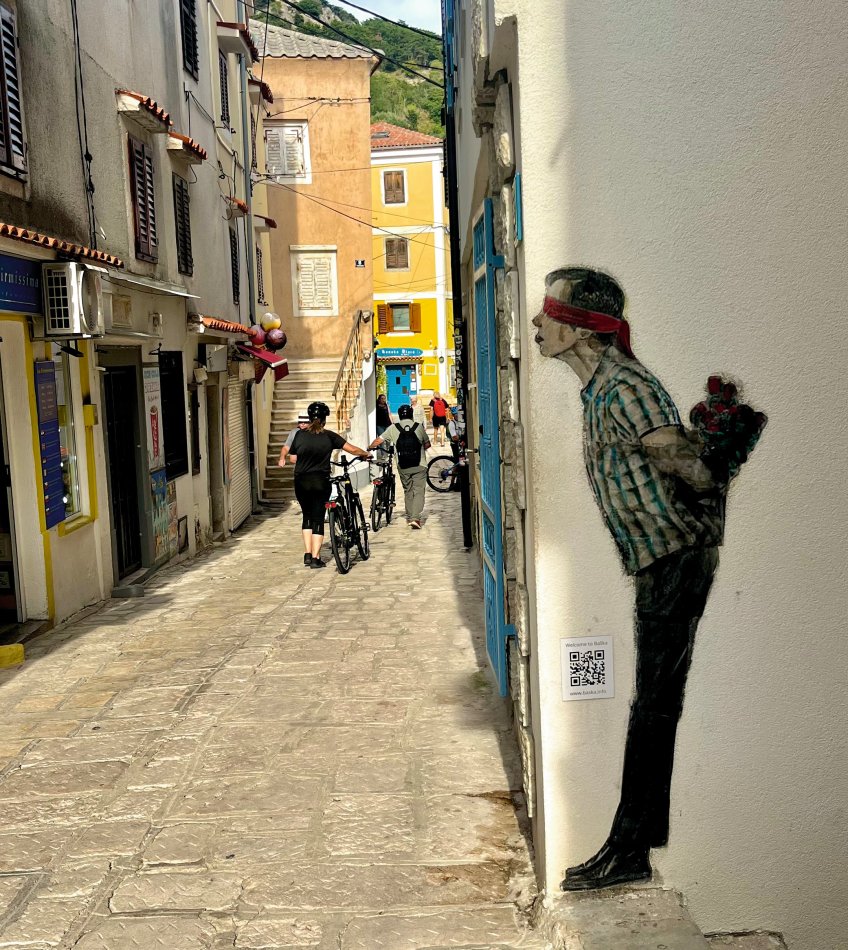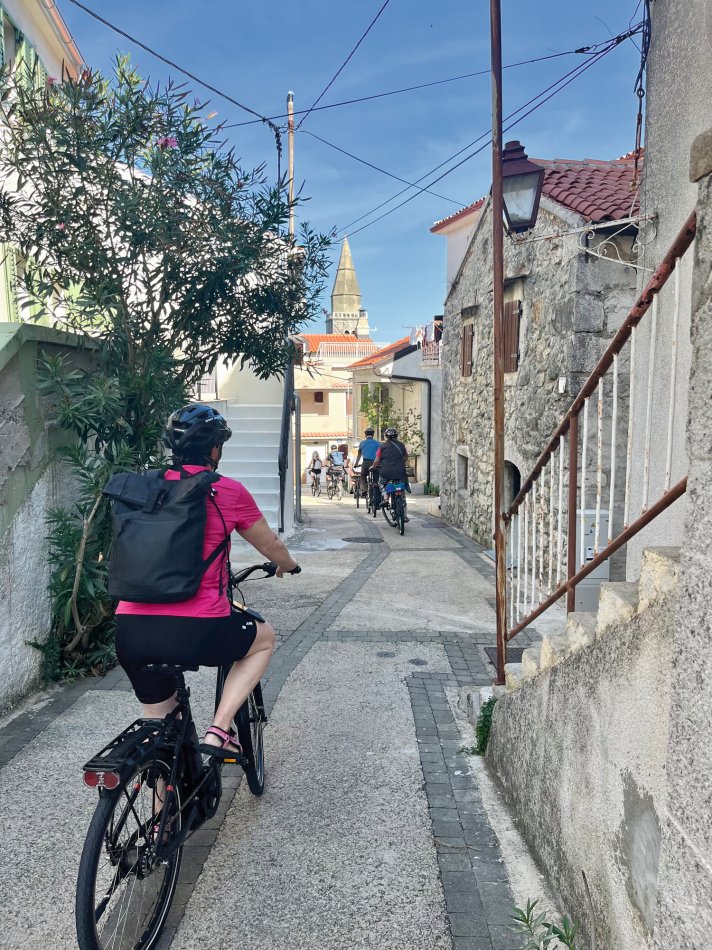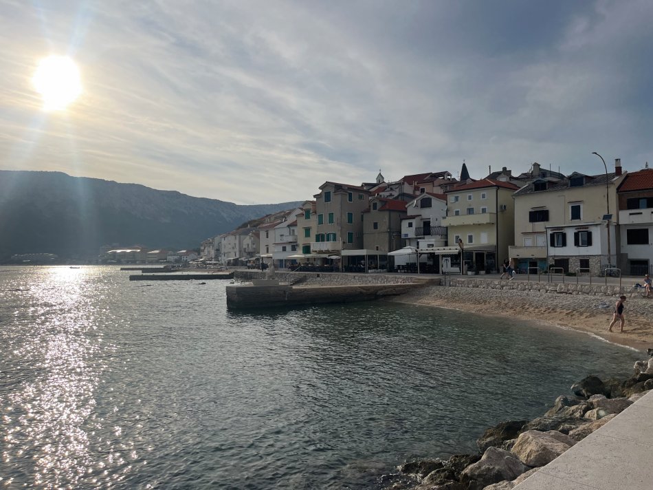 Ganz ruhig erwachte das beschauliche Krk gestern früh, während die Sonne langsam am Horizont empor stieg. Nach dem Frühstück an Bord starteten wir zu unserer Radtour. Erstes Ziel war die kleine Gemeinde Dobrinj im Nordosten der Insel. Hier hatten wir Zeit, den Ausblick bis nach Opatija und Rijeka zu genießen und ein erstes erfrischendes Radler zu trinken. Durch die Weingärten der Insel ging es dann weiter bis nach Vrbnik. Zunächst kehrten wir in eine urige Konoba zur Weinverkostung ein. Neben den lokalen Weinen wurde auch Schinken und Käse probiert. Anschließend ging es weiter in die Altstadt. Das Weinstädtchen Vrbnik, was auf einer 47 m hohen Klippe über dem Meer thront ist wirklich ganz zauberhaft. Urige Gässchen, kleine Geschäfte, tolle Lokale, die alle in den Weißwein Zlahtina servieren und die kleinste Gasse der Welt mit nur 40 cm Breite, wollten erkundet werden. Gegen 14:00 Uhr radelten wir dann gemütlich weiter bis nach Baska, wo unsere Meridijan auf uns wartete. Zeit zum Spazieren und Schwimmen bis 18:00 Uhr. Dann gab es ein Abendessen an Bord. Anschließend haben wir den Abend bei ganz schön viel Zlahtina in einem gemütlichen Lokal an der Riva ausklingen lassen.
