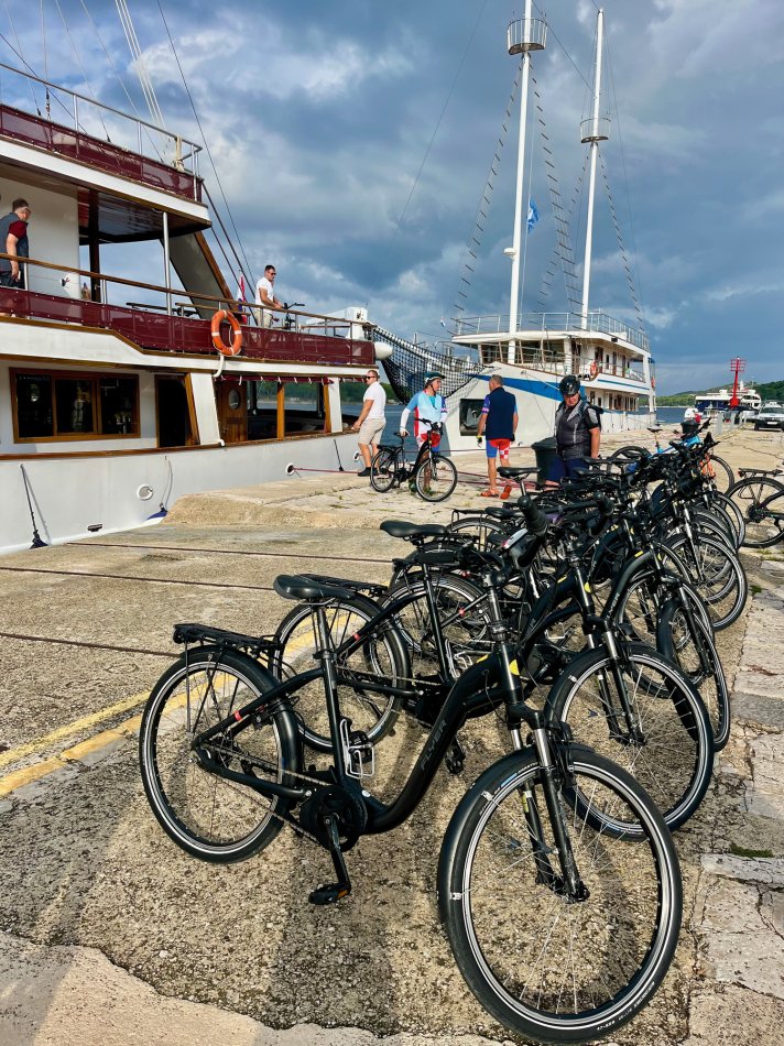 Da das Wetter umgeschlagen ist und ein starker Jugo-Wind erwartet wurde, mussten wir kurzerhand ein bisschen umdisponieren. Demzufolge sind wir nach dem Frühstück gegen 099:30 Uhr gemütlich zu einer Radtour über die Insel Cres gestartet. Bei verschiedenen Aussichtspunkten haben wir diverse Fotostopps gemacht und hatten eine tolle Sicht auf Cres-Stadt. Über Vrana sind wir weiter gefahren zum Süßwassersee Vransko jezero und von dort aus weiter ins beschauliche Örtchen Orlec. Pause zu Füßen des Kirchturms und dann ging es zurück nach Cres-Stadt. Mittagessen an Bord des Schiffes, bevor am Nachmittag jeder tun konnte, wonach ihm der Sinn stand. Einige Gäste sind individuell noch mal mit dem Fahrrad los und zum Leuchtturm gefahren, andere haben die Zeit zum Bummeln, Spazieren und Einkehren genutzt. Für den Abend haben wir ein Peka-Abendessen in einer traditionellen Konoba reserviert. Mit vorzüglichem Lamm, saftigen Kartoffeln und gutem Wein wurden wir in Loznati verwöhnt. Das Taxi brachte uns um 22:00 Uhr zurück nach Cres. Der Wind hatte ganz schön an Geschwindigkeit aufgenommen, aber an Bord unserer Meridijan saßen wir geschützt und ließen den Abend gemütlich ausklingen.