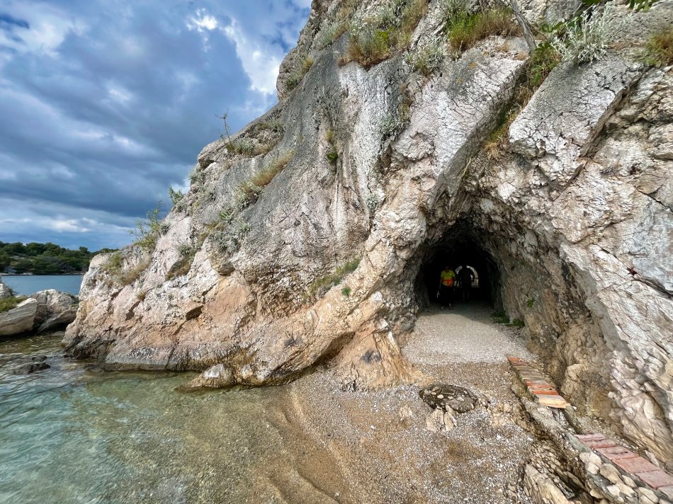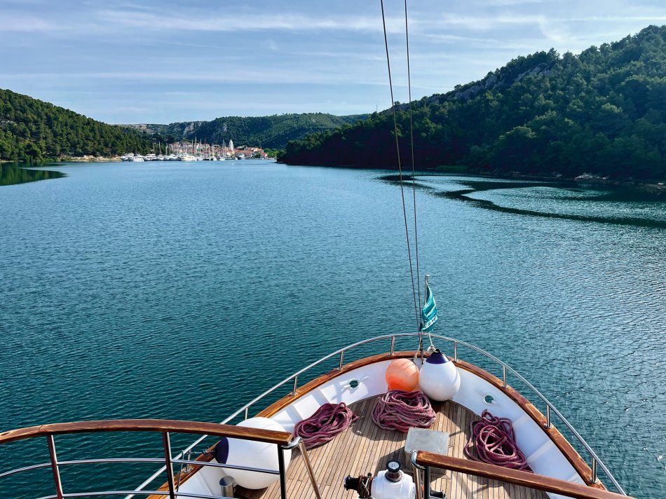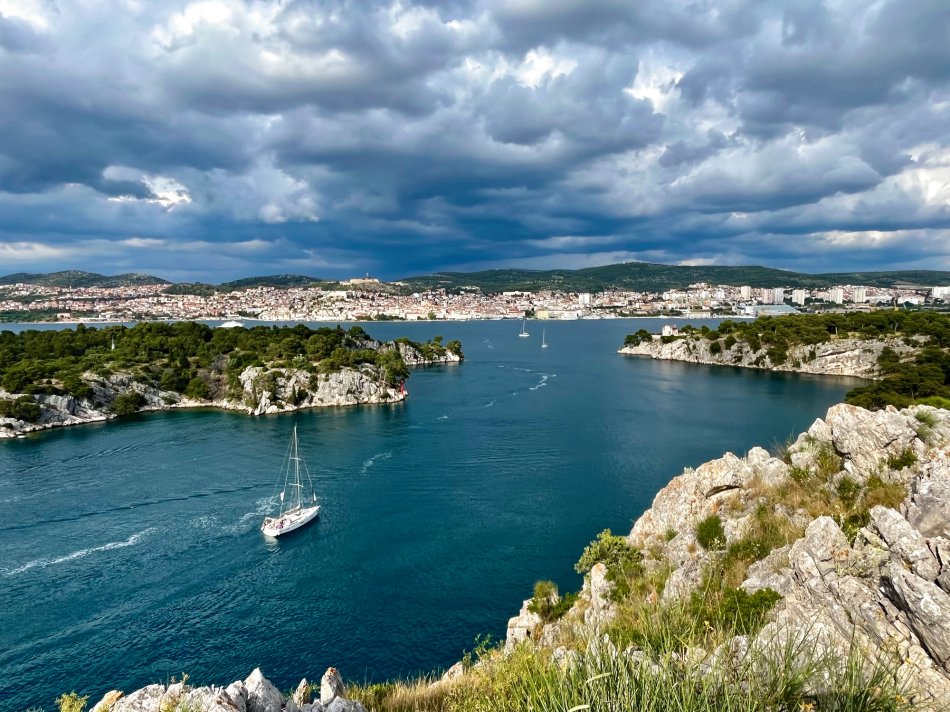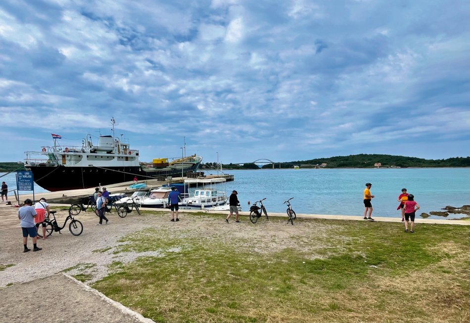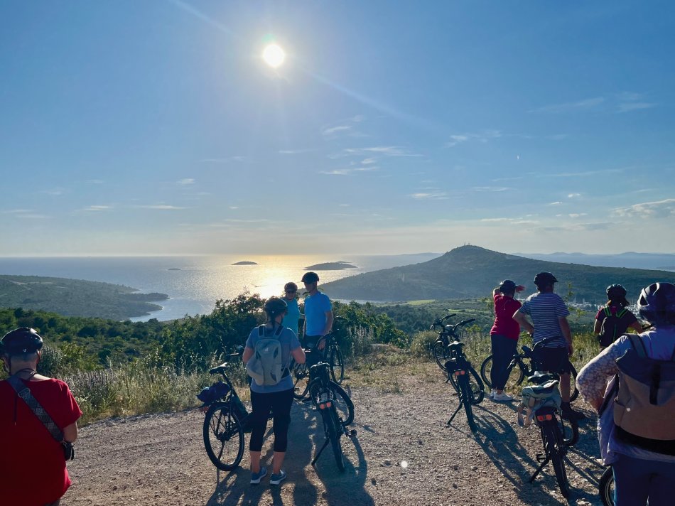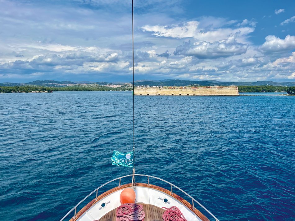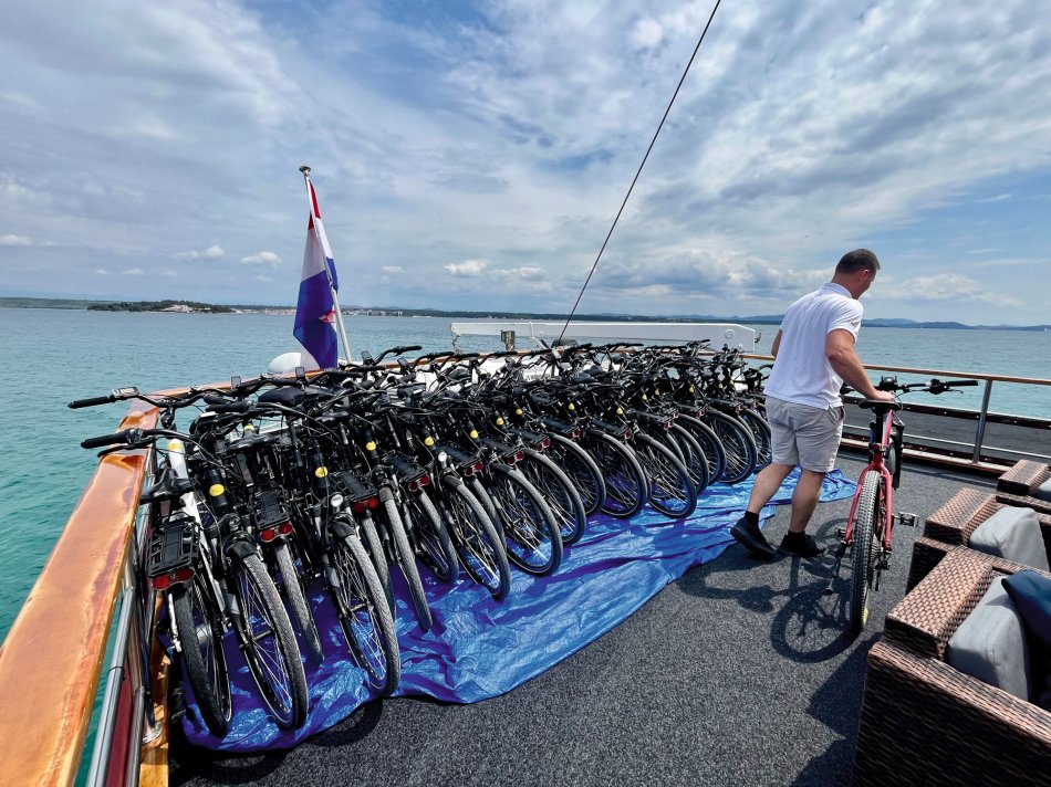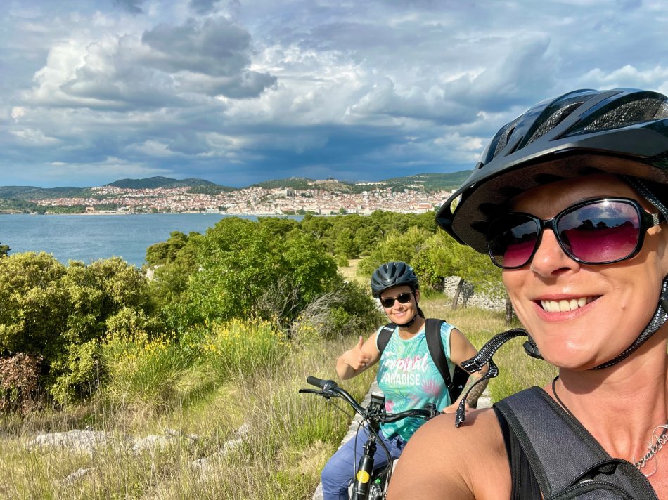 Ein bedeckter Himmel aber angenehme Temperaturen begleiteten uns gestern auf unserer Radtour über die Insel Uglijan und Pasman. In Tkon angekommen, erwartete uns die Meridijan bereits zum Mittagessen. Einer Tomatensuppe folgte ein üppiges Salatbuffet und ein selbstgebackener Apfelstrudel. Anschließend ließen wir unsere Irmgard mit einer vorzüglichen Creme-Torte und ein paar kleinen Geschenken zum Geburtstag Hoch leben! Am frühen Nachmittag versammelten sich die Gäste an Deck, während wir die Seefestung Sveti Nikola passierten und in den Kanal von Skradin einfuhren. Und dann lag die Stadt der Festungen plötzlich vor uns. Wir ergatterten einen Liegeplatz in erster Reihe - unweit der Altstadt mit der herrlichen Kathedrale - die Räder wurden abgeladen und los ging unsere Radtour Richtung Seefestung. Nachdem wir den Stadtverkehr hinter uns gelassen hatten, fuhren wir auf schattigen, gewundenen Wegen direkt am Wasser entlang. Der Wanderweg, der sich wie eine Schlange Bergauf und Bergab windet, wurde zwischenzeitlich so steil, dass einige Gäste lieber ihr Rad schoben, anstatt zu fahren. Dank der Schiebehilfe der Räder, war das Erklimmen des Gipfels jedoch kein Problem. Belohnt wurden wir mit einem atemberaubenden Blick auf den Kanal von Sibenik, die prächtige Stadt, die Seefestung und den See Veliko Jezero. Traumhaft! Bergab ging es dann natürlich wieder leichter. Unterwegs legten wir einen Stopp an der Höhle und Kirche Sveti Ante ein. Sowas sieht man wahrlich nicht alle Tage! Weiter ging es durch schattenspendende Wälder und über einen Holzsteg bis auf ein kleines Inselchen, welches mit zahlreichen Bunkeranlagen gespickt ist, die einige unserer Gäste erkundeten. Und dann lag Sie plötzlich majestätisch und auch ein bisschen bedrohlich vor uns, die Seefestung Sveti Nikola. Eine beeindruckende und seltene Verteidigungsanlage mitten in der Adria. Wir radelten gemütlich zurück zum Schiff, wo der Abend in einer der guten Restaurants in Sibenik, einem Stadtspaziergang und einem Absacker an Bord wunderbar ausklang.