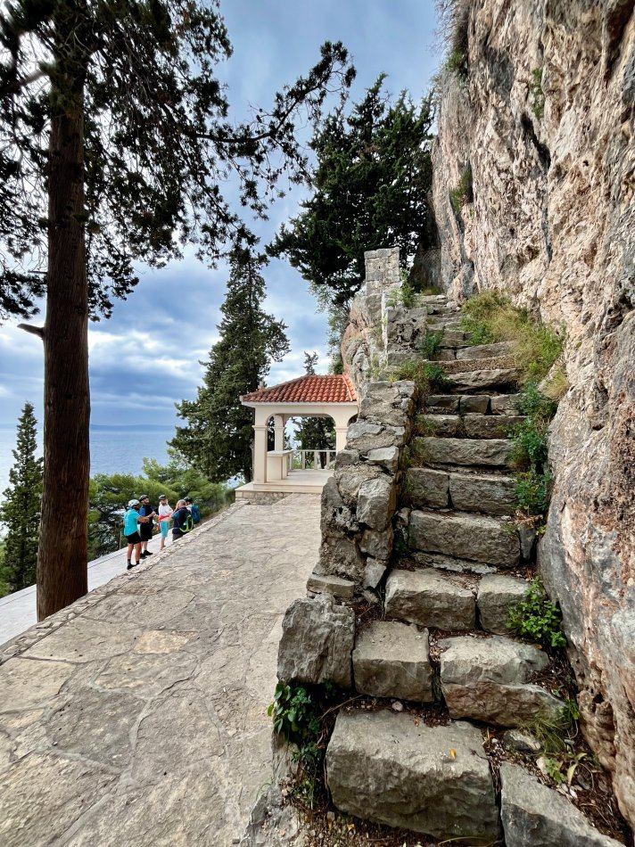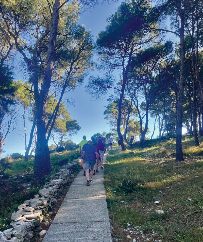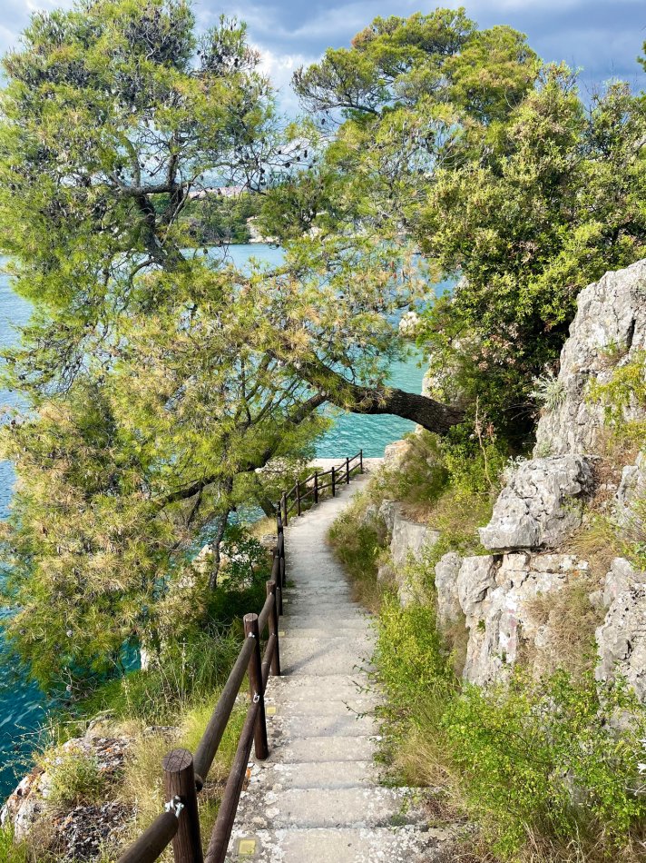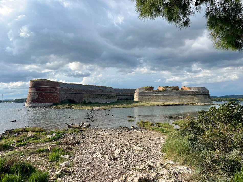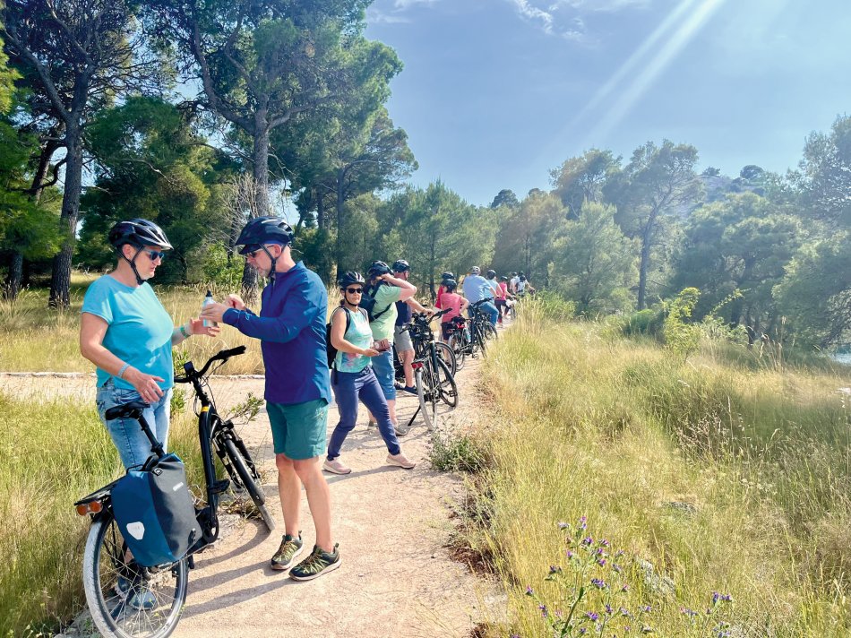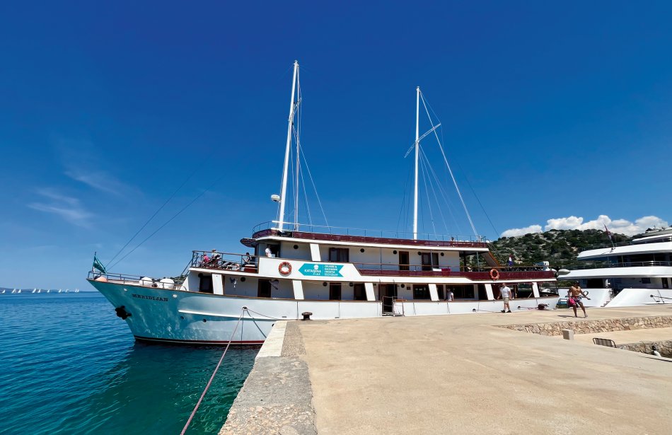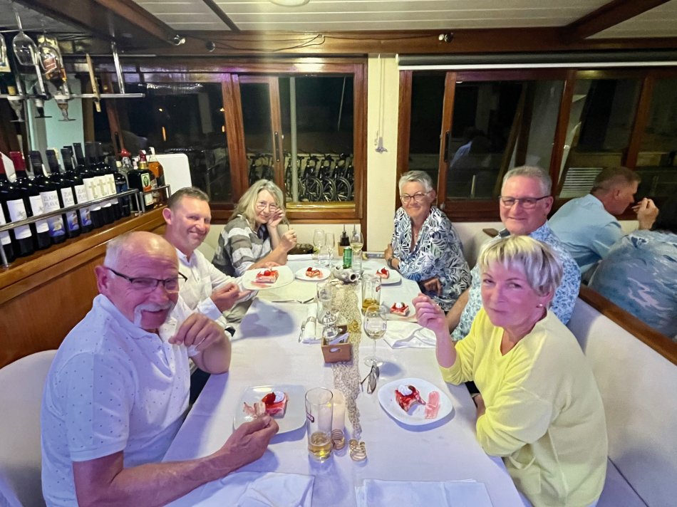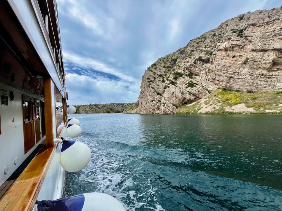 Ein bedeckter Himmel aber angenehme Temperaturen begleiteten uns gestern auf unserer Radtour über die Insel Uglijan und Pasman. In Tkon angekommen, erwartete uns die Meridijan bereits zum Mittagessen. Einer Tomatensuppe folgte ein üppiges Salatbuffet und ein selbstgebackener Apfelstrudel. Anschließend ließen wir unsere Irmgard mit einer vorzüglichen Creme-Torte und ein paar kleinen Geschenken zum Geburtstag Hoch leben! Am frühen Nachmittag versammelten sich die Gäste an Deck, während wir die Seefestung Sveti Nikola passierten und in den Kanal von Skradin einfuhren. Und dann lag die Stadt der Festungen plötzlich vor uns. Wir ergatterten einen Liegeplatz in erster Reihe - unweit der Altstadt mit der herrlichen Kathedrale - die Räder wurden abgeladen und los ging unsere Radtour Richtung Seefestung. Nachdem wir den Stadtverkehr hinter uns gelassen hatten, fuhren wir auf schattigen, gewundenen Wegen direkt am Wasser entlang. Der Wanderweg, der sich wie eine Schlange Bergauf und Bergab windet, wurde zwischenzeitlich so steil, dass einige Gäste lieber ihr Rad schoben, anstatt zu fahren. Dank der Schiebehilfe der Räder, war das Erklimmen des Gipfels jedoch kein Problem. Belohnt wurden wir mit einem atemberaubenden Blick auf den Kanal von Sibenik, die prächtige Stadt, die Seefestung und den See Veliko Jezero. Traumhaft! Bergab ging es dann natürlich wieder leichter. Unterwegs legten wir einen Stopp an der Höhle und Kirche Sveti Ante ein. Sowas sieht man wahrlich nicht alle Tage! Weiter ging es durch schattenspendende Wälder und über einen Holzsteg bis auf ein kleines Inselchen, welches mit zahlreichen Bunkeranlagen gespickt ist, die einige unserer Gäste erkundeten. Und dann lag Sie plötzlich majestätisch und auch ein bisschen bedrohlich vor uns, die Seefestung Sveti Nikola. Eine beeindruckende und seltene Verteidigungsanlage mitten in der Adria. Wir radelten gemütlich zurück zum Schiff, wo der Abend in einer der guten Restaurants in Sibenik, einem Stadtspaziergang und einem Absacker an Bord wunderbar ausklang.
