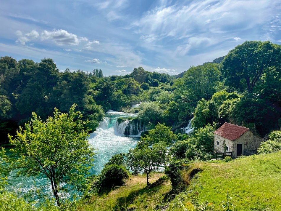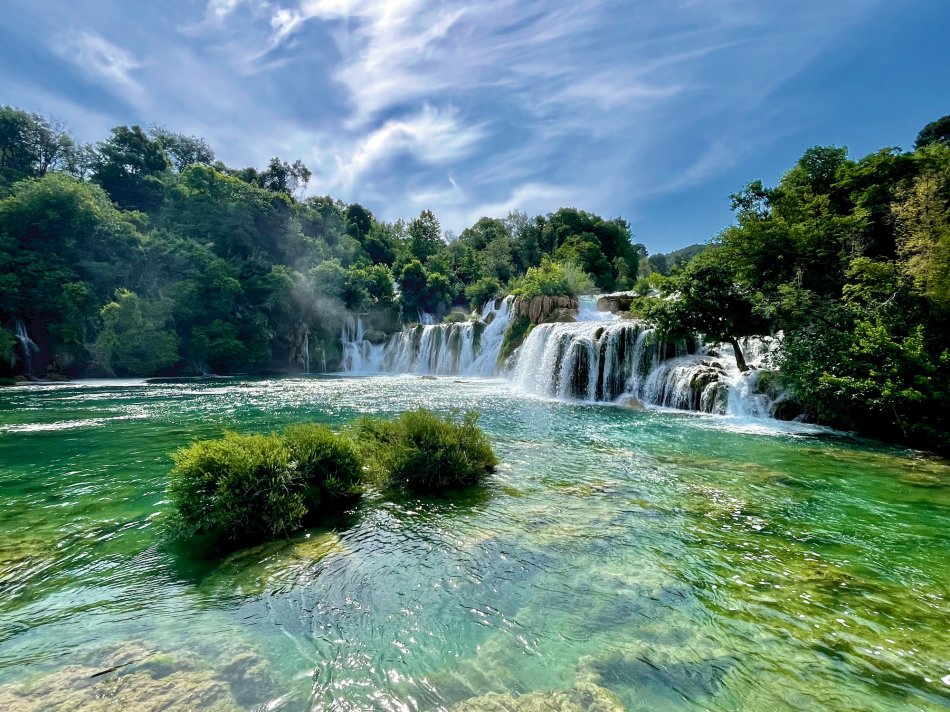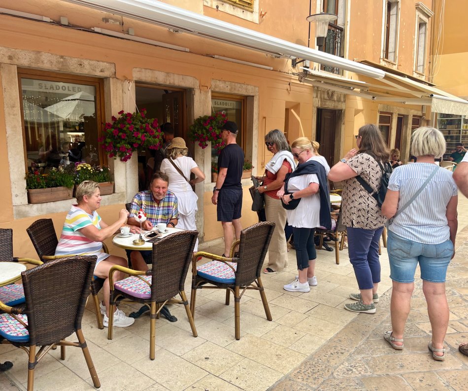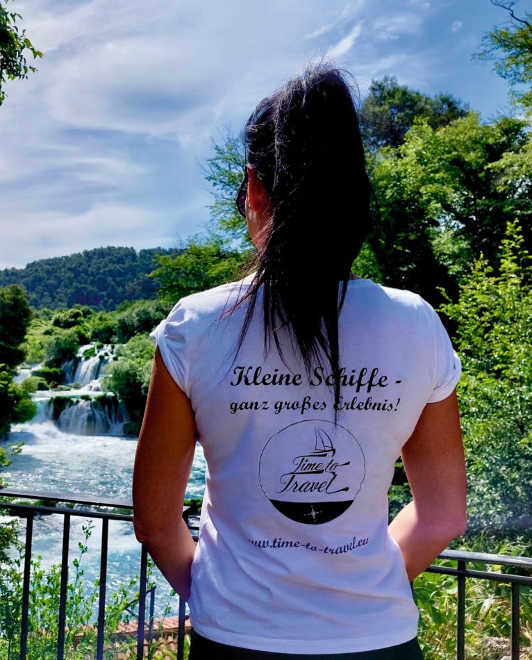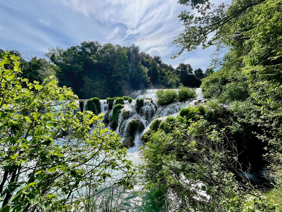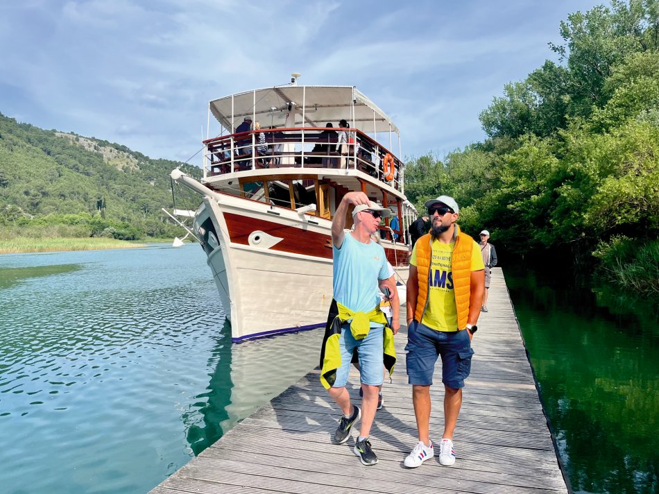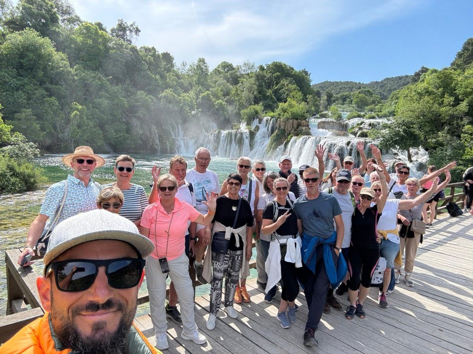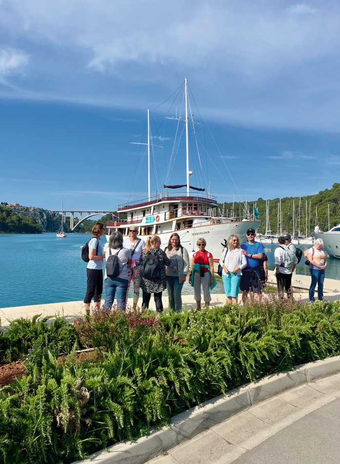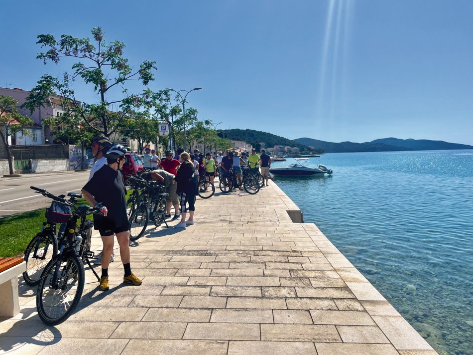 Gestern blieben die Räder an Bord. Während des Frühstücks nahmen wir Kurs auf Skradin, vorbei an zahlreichen Muscheln- und Austernfarmen. In Skradin angekommen wechselten wir von unserer Meridijan auf die MS Nedica, die uns in 20 Minuten in den Nationalpark Krka brachte. Das Rauschen der Wasserfälle war schon von Weitem zu hören. Und dann lag er plötzlich vor uns, der Skradinski Buk, der 7. und längste Wasserfall des Nationalparks Krka. Über 17 Stufen und eine Länge von 800 m stürzt sich das Wasser die Berge hinunter. Das ist ein Anblick! Von der Holzbrücke aus hat man zweifelsohne die schönste Sicht auf das Naturspektakel - ein idealer Platz also für unser Gruppenfoto. Wir unternahmen einen Spaziergang auf dem 2 km langen Rundwanderweg, der, umgeben von üppiger Natur, immer wieder wunderschöne Ausblicke auf die Fallstufen bietet. Einige Gäste zogen auf eigene Faust los und suchten die schönsten Fotospots, andere nutzten die Zeit zur Einkehr und eine kleine Erfrischung. Um 12:30 brachte uns das Nationalparkboot wieder zurück nach Skradin und mit unsere Meridijan nahmen wir Kurs auf Trogir. Dem Mittagessen an Bord folgte eine etwas stürmische Überfahrt, durch einen starken Südwind. Wir suchten uns vom Wind geschützte Plätze an Bord und genossen die Überfahrt. Um 17:30 erreichten wir die dalmatinische Perle Trogir, wo wir spontan eine Stadtführung organisiert hatten. Reiseleiterin Monika wusste viel Interessantes über "Ihre Stadt" zu erzählen. Anschließend hatten wir Freizeit, zum Eis essen, Bummeln, Schlendern durch das verwinkelte Netz an kleinen Gässchen, die gespickt sind mit kleinen, urigen Restaurants. Heute geht es mit den Rädern weiter über die Insel Ciovo, aber dazu morgen mehr....