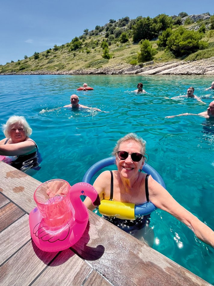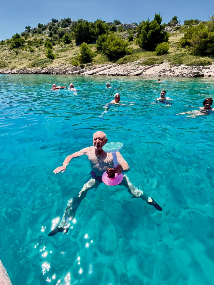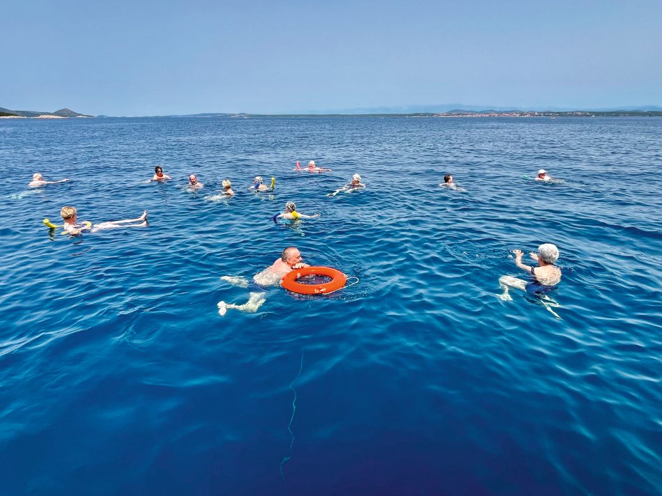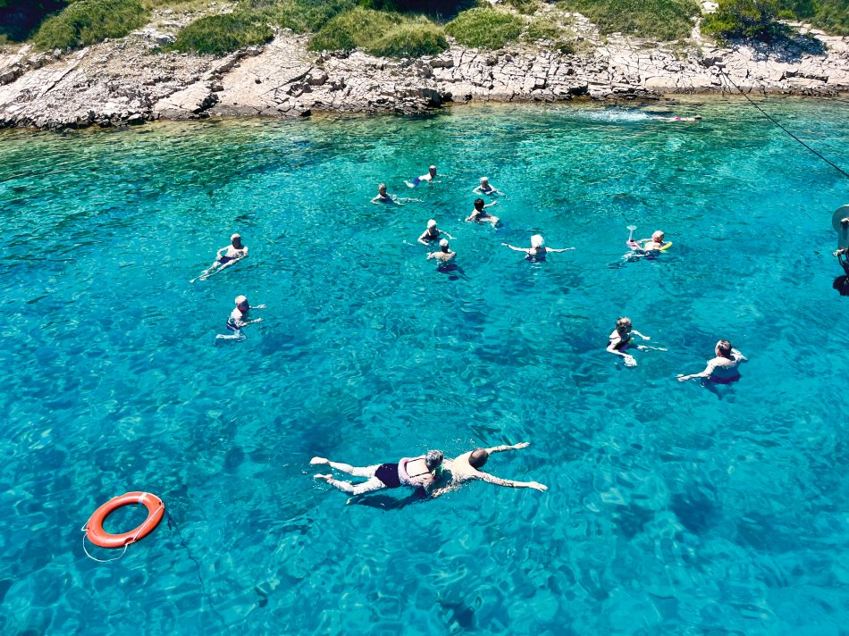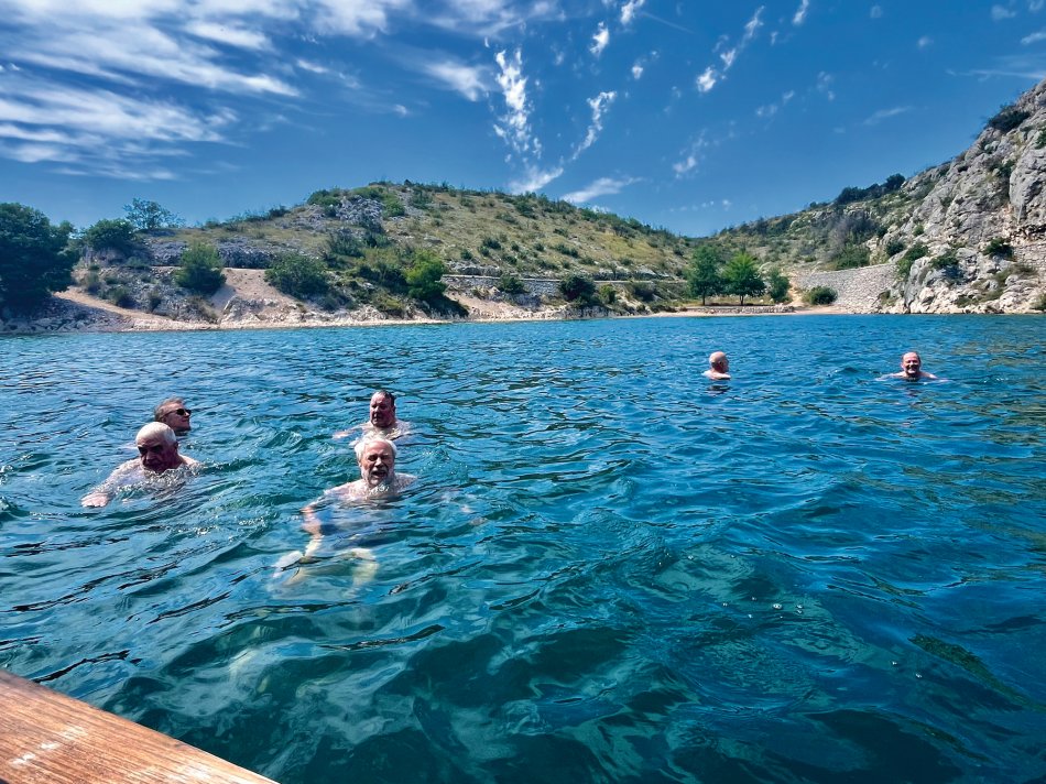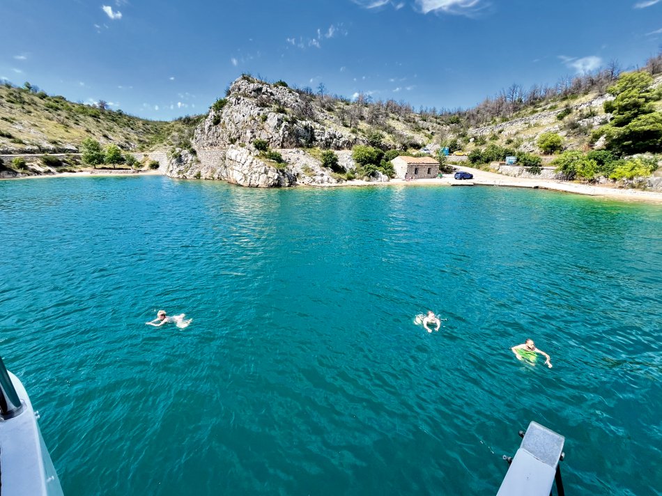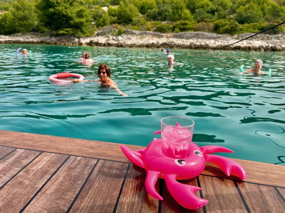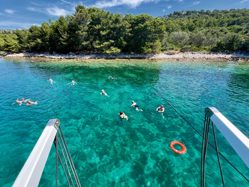 hat wieder eine herrliche Bucht für uns gefunden, wo wir ausgiebig Zeit hatten, um in die glasklare Adria einzutauchen. Bei spiegelglatter See haben wir auch heute noch mal einen Getränkeservice im Wasser angeboten. Schnorcheln, vom Schiff aus ins Wasser springen, sich auf den Schwimmnudeln treiben lassen und die ein oder andere Runde um´s Schiff drehen - ein toller Badestopp! Ein letztes vorzügliches Mittagessen