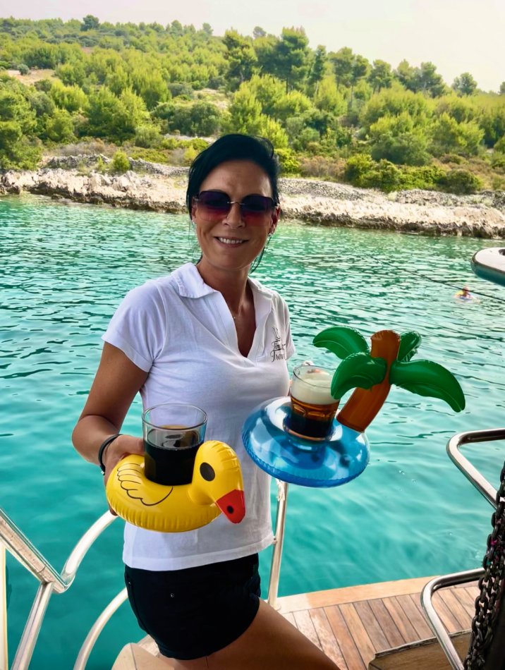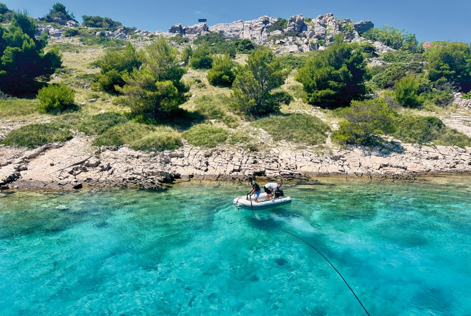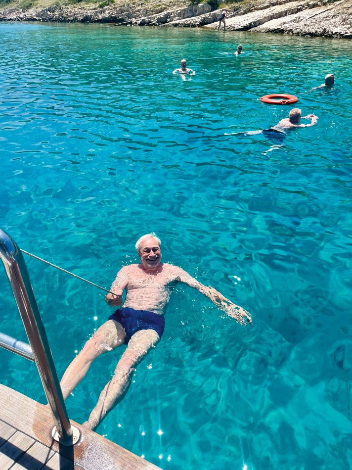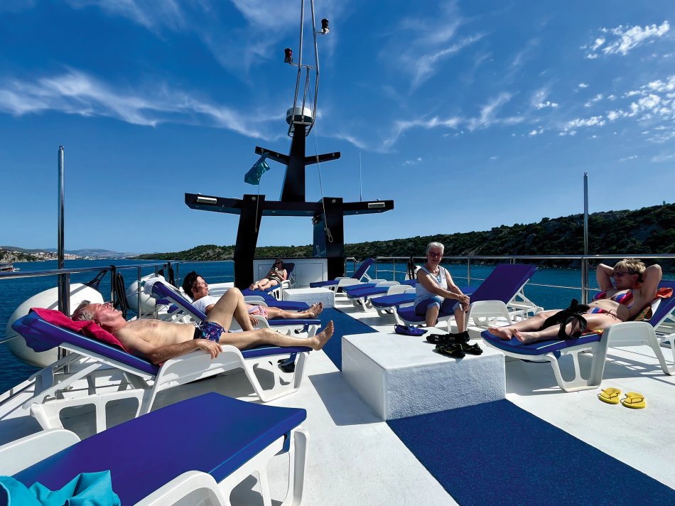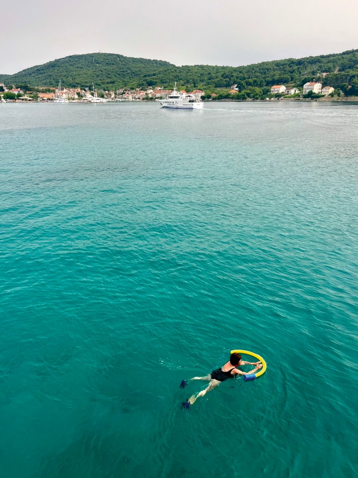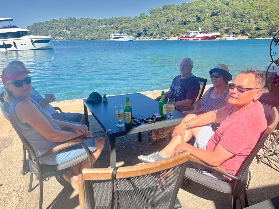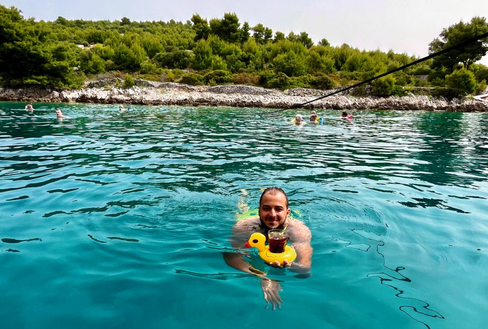 hat wieder eine herrliche Bucht für uns gefunden, wo wir ausgiebig Zeit hatten, um in die glasklare Adria einzutauchen. Bei spiegelglatter See haben wir auch heute noch mal einen Getränkeservice im Wasser angeboten. Schnorcheln, vom Schiff aus ins Wasser springen, sich auf den Schwimmnudeln treiben lassen und die ein oder andere Runde um´s Schiff drehen - ein toller Badestopp! Ein letztes vorzügliches Mittagessen