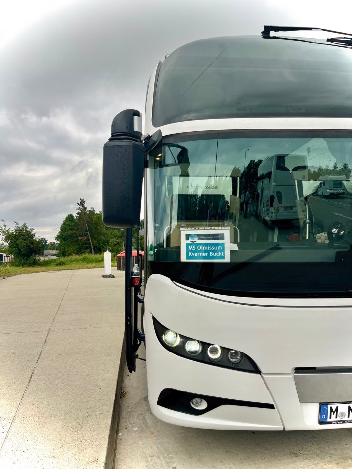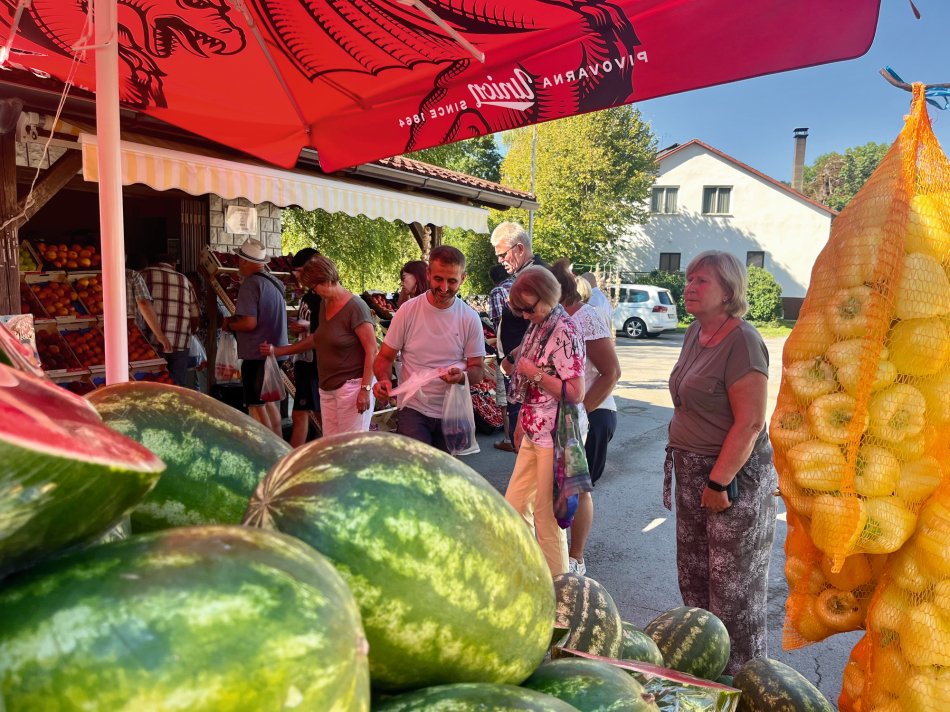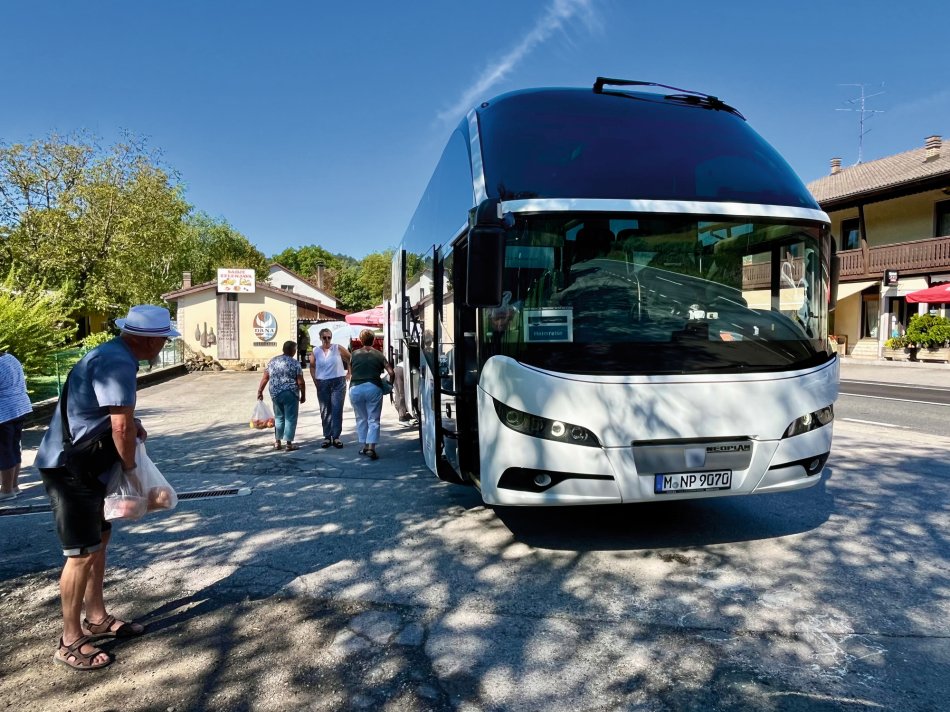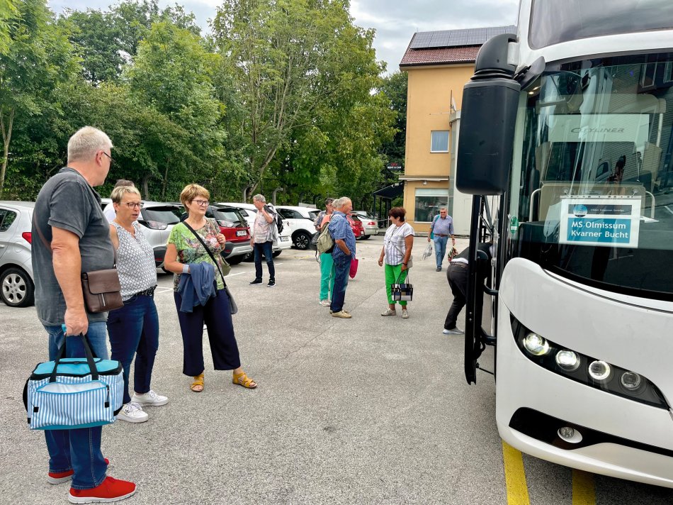 Ein letztes leckeres Frühstück an Bord unserer Olmissum. Um 08:30 Uhr kam das Fahrzeug für den Gepäcktransfer und es hieß Abschied nehmen von dem tollen Schiff und der Crew. Gemütlicher Süahziergang entlang des Lungomares zum Busbahnhof, wo unser Rainer bereits auf unser wartete. Das Gepäck war schnell verladen und mit einem letzten Blick auf Opatija ging es über die Grenze nach Slowenien. Hier haben wir einen kleinen Stopp eingelegt, um uns mit frischem Obst und Gemüse für zu Hause zu versorgen. Alle Gäste haben ordentlich zugeschlagen.