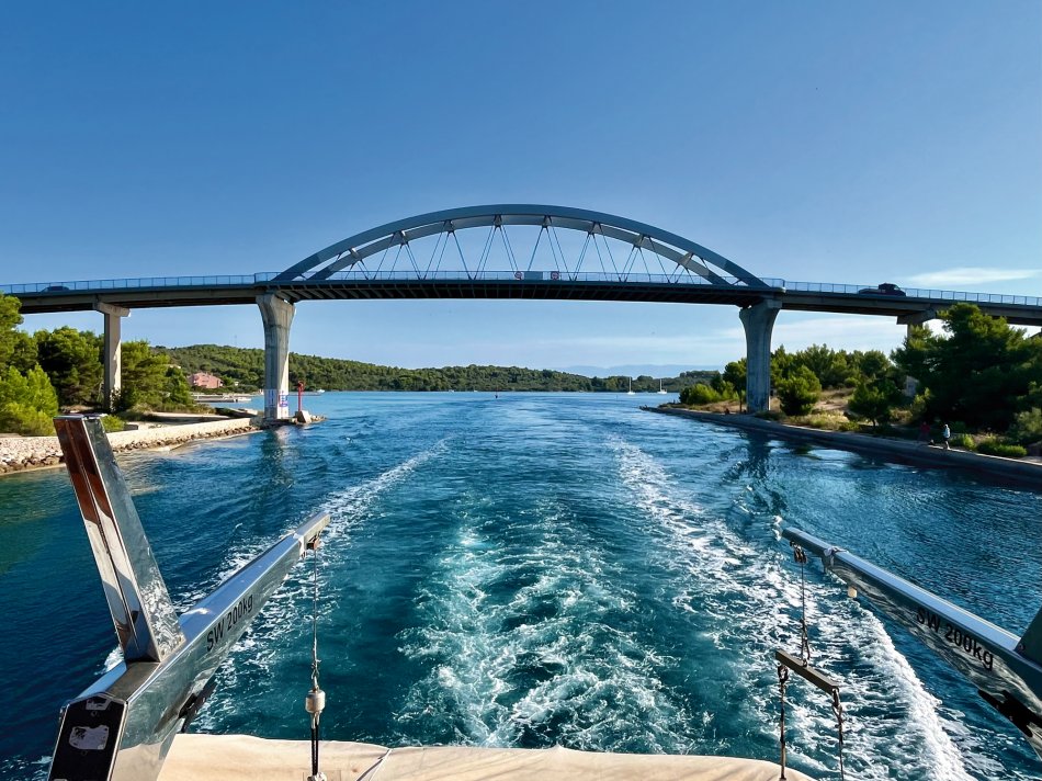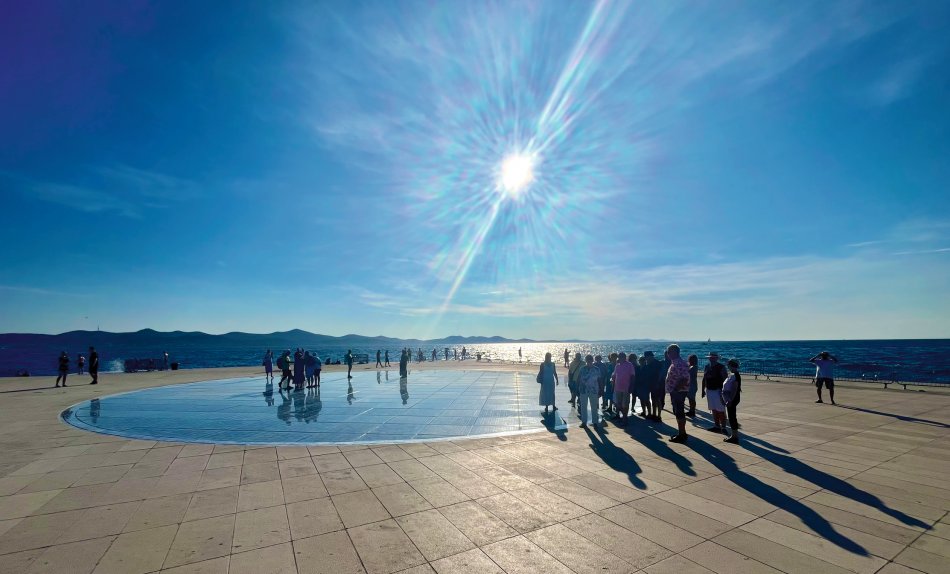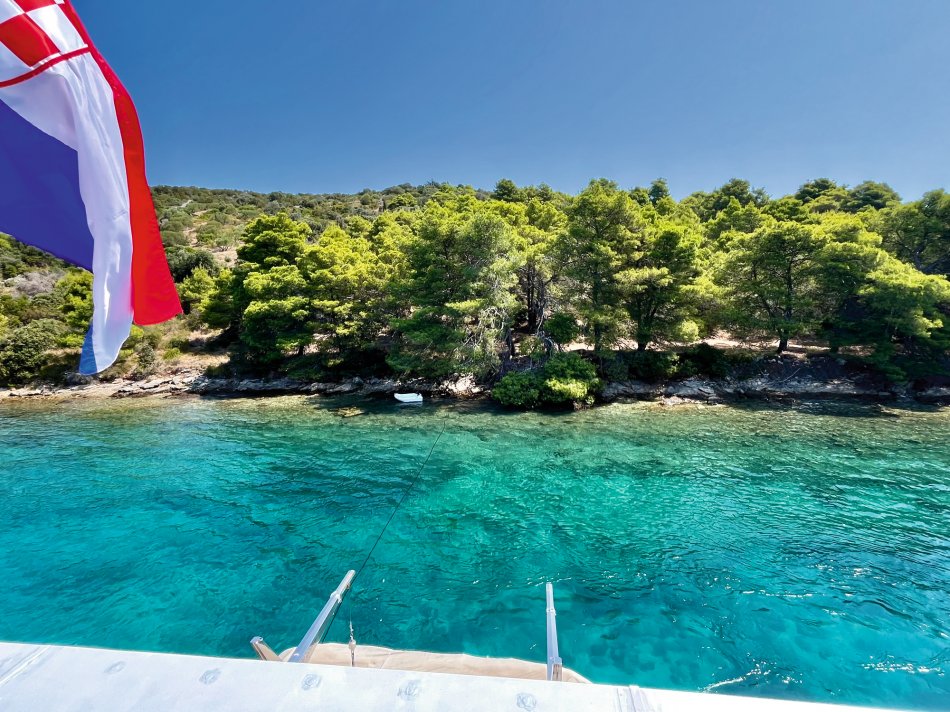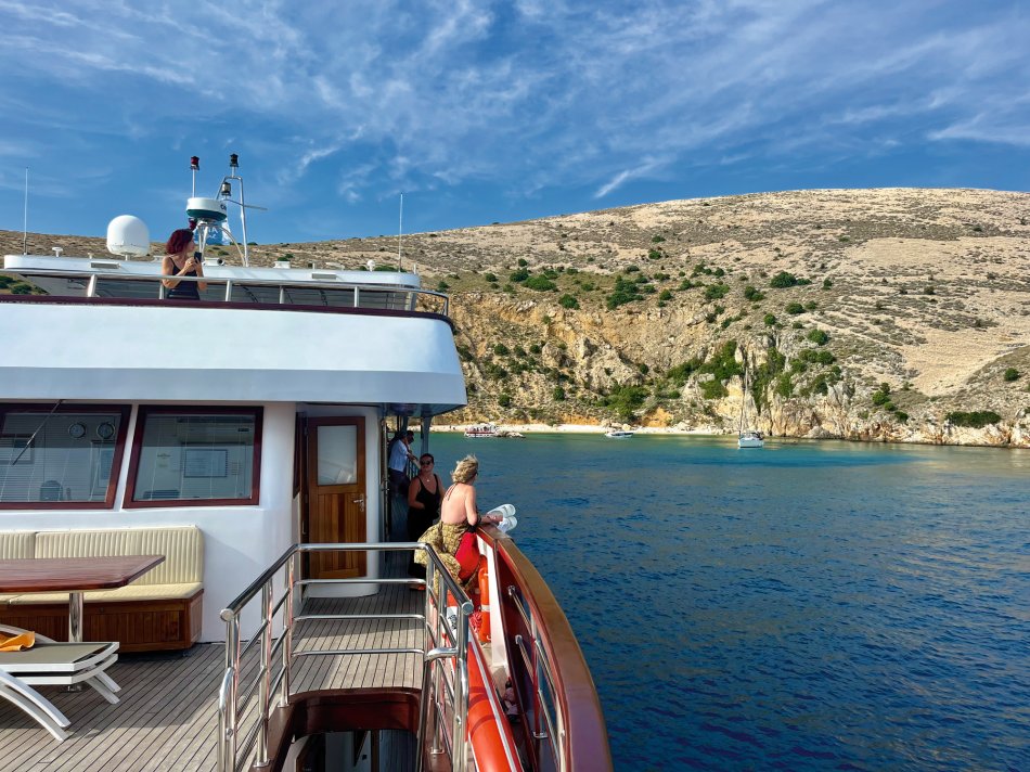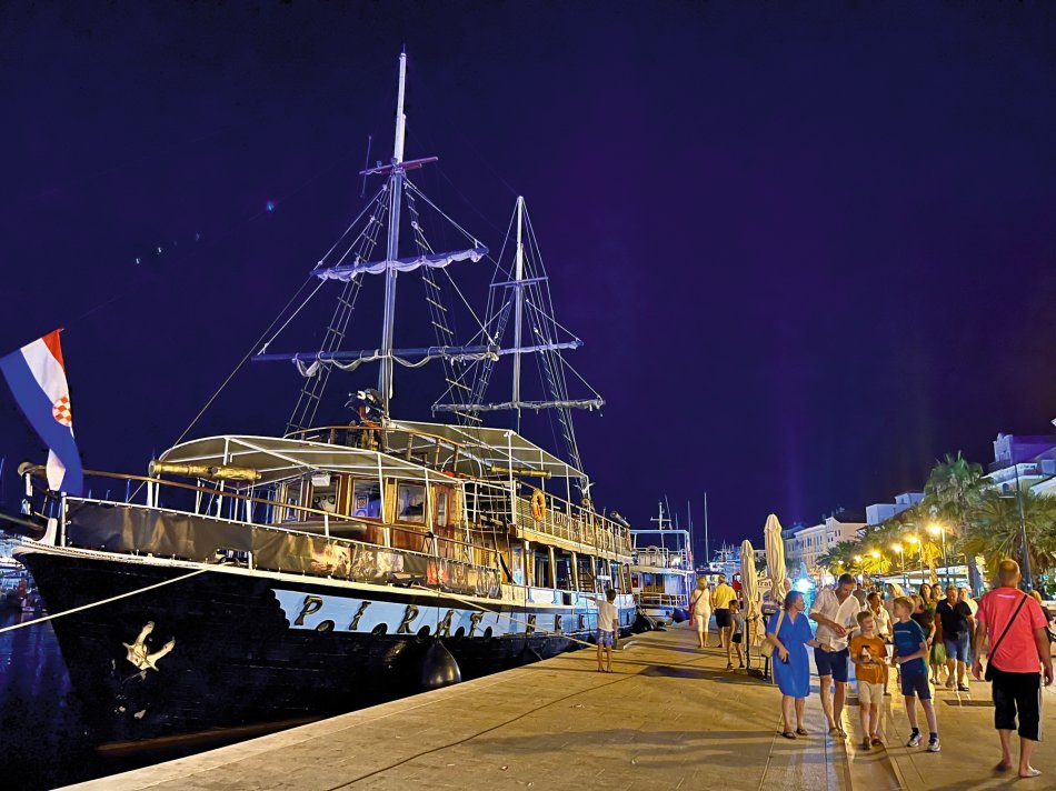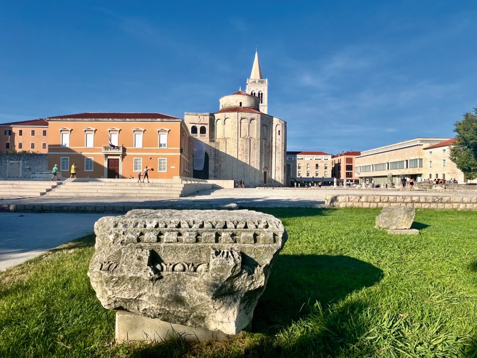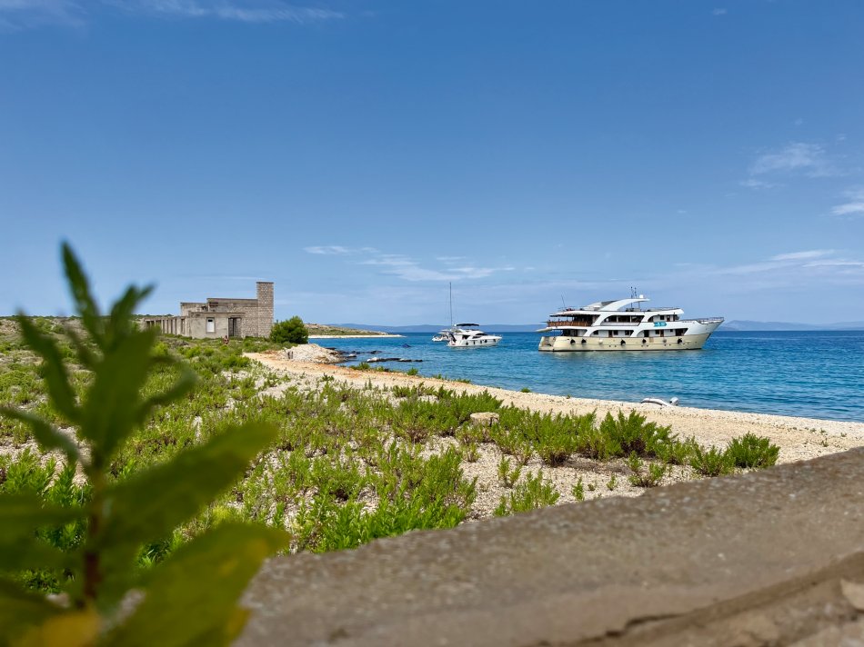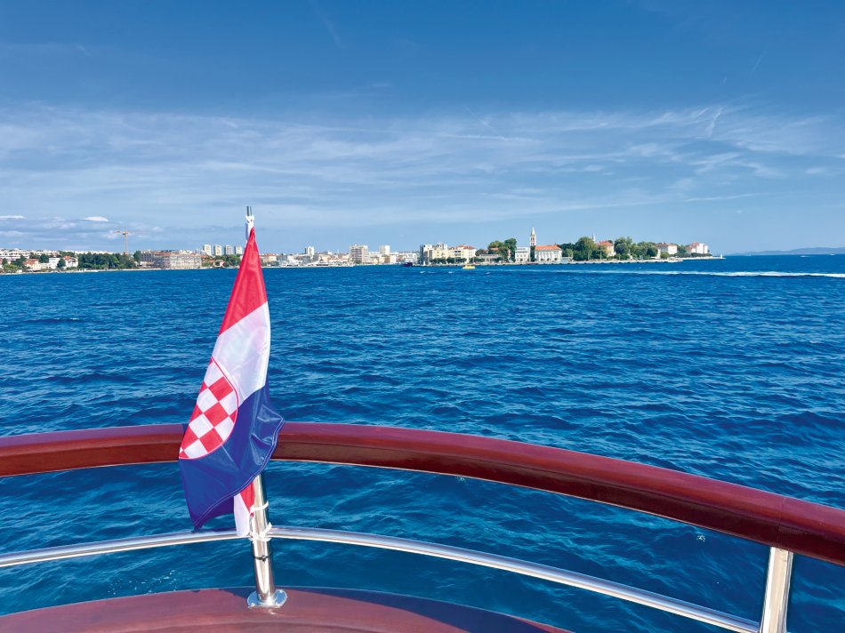 Während des Frühstücks mit Blick auf die glasklare Adria nahmen wir gestern Morgen Kurs in Richtung Süden. Während der allmorgendlichen Routen- & Tagesplanung passierten wir die karge Insel Pag mit Novalja und ankerten in unserer Lieblingsbucht auf dieser Strecke, an der kleinen Insel Maun. Sandbänke, glasklares, türkisfarbenes Wasser und das Zirpen der Zikaden erwarteten uns. Kapitän Josip war auf Oktopusjagd und kam mit einem kleinen Tintenfisch zurück an Bord. Wir hatten ausreichend Zeit zum Schnorcheln und Schwimmen, bevor wir zum Mittagessen weiter fuhren nach Zadar. Hier erwartete uns unsere Reiseleiterin Tea zur kurzweiligen und lustigen Stadtführung. Natürlich haben wir unseren Gästen alles gezeigt, was man in Zadar gesehen haben muss: Der Platz „Gruß an die Sonne“ mit der Meeresorgel, die gestern durch den Wind ganz schön laute Töne von sich gab, das Forum, die Kuchenkathedrale, die Kalelarga und wo unsere Gäste das beste Eis der Stadt probieren können. – Das ließen sie sich nicht zweimal sagen…