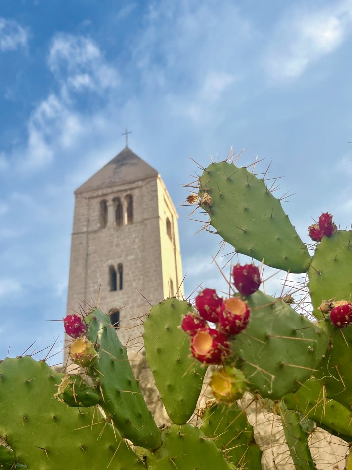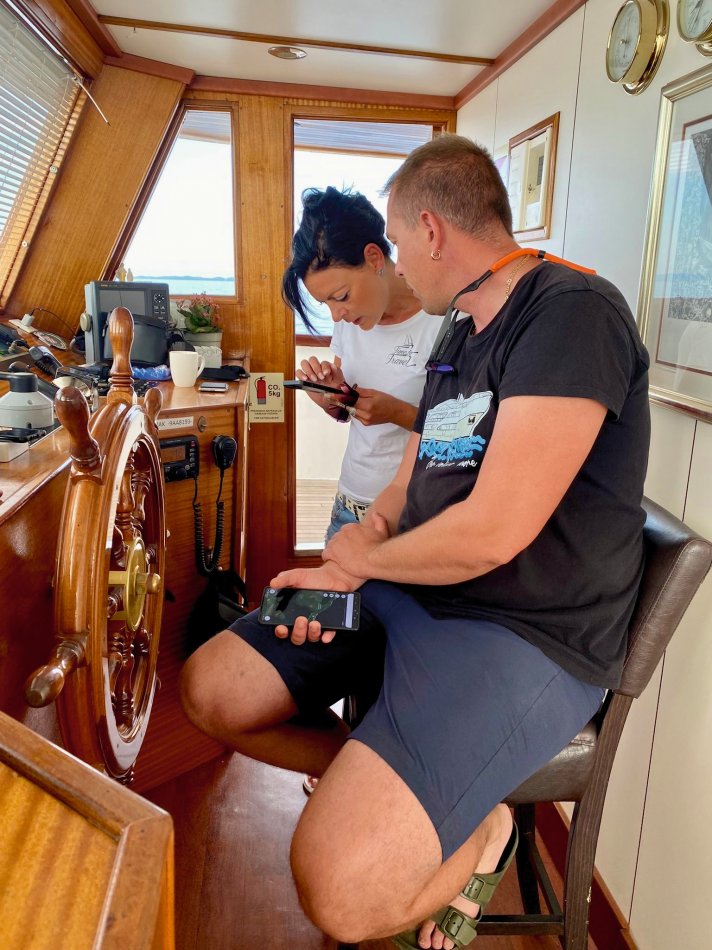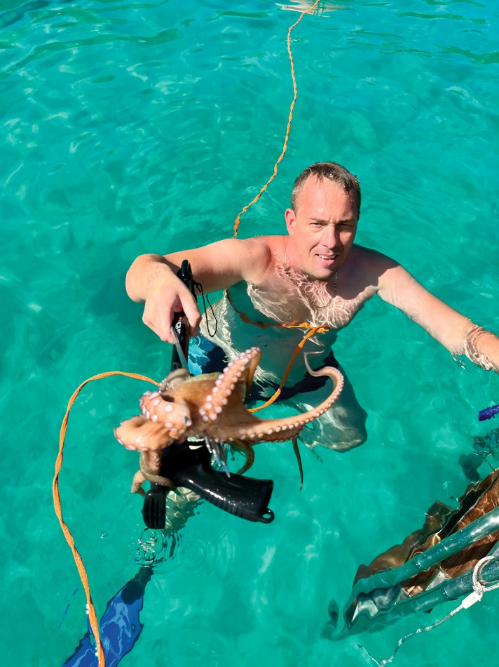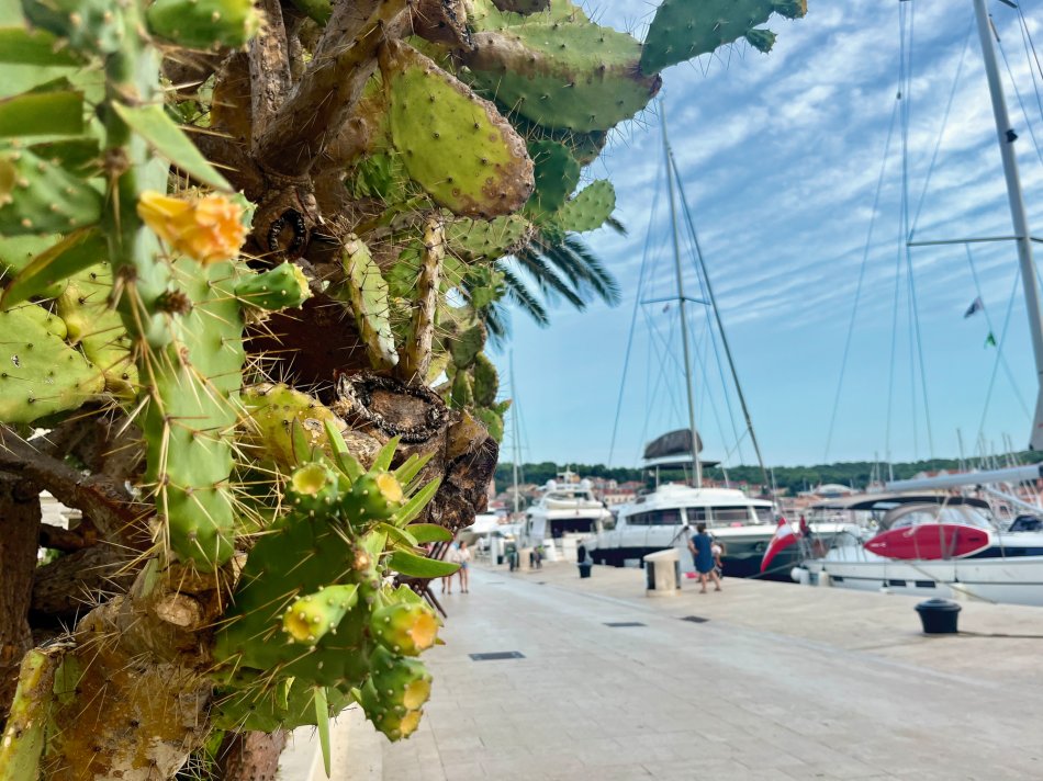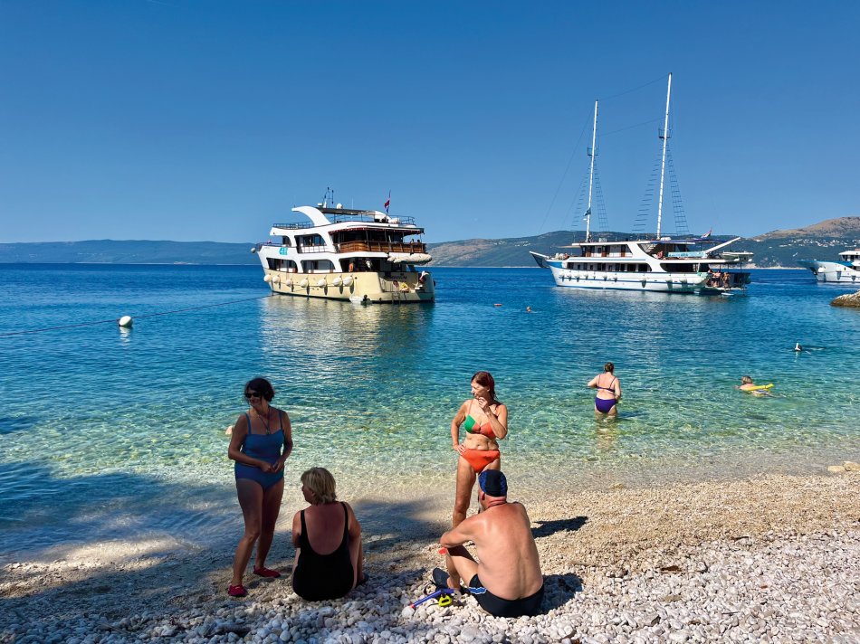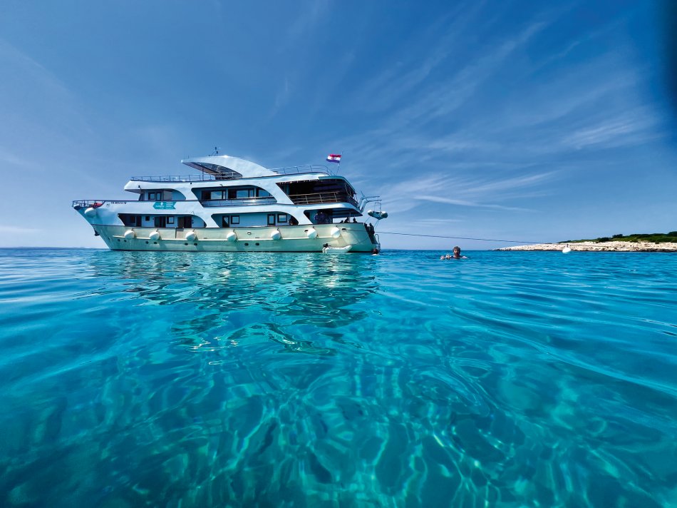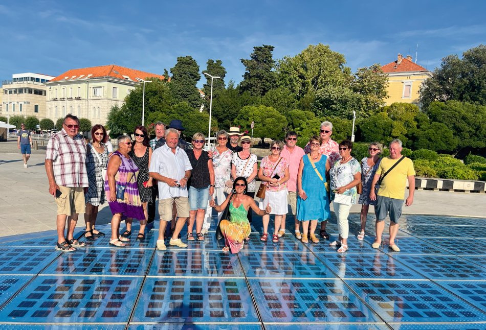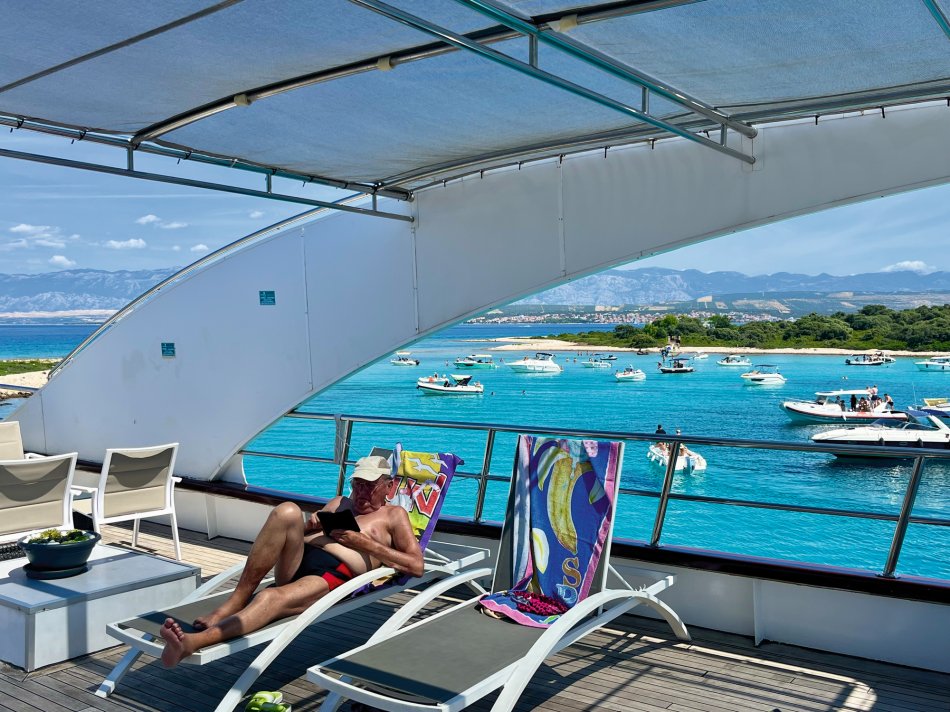 Während des Frühstücks mit Blick auf die glasklare Adria nahmen wir gestern Morgen Kurs in Richtung Süden. Während der allmorgendlichen Routen- & Tagesplanung passierten wir die karge Insel Pag mit Novalja und ankerten in unserer Lieblingsbucht auf dieser Strecke, an der kleinen Insel Maun. Sandbänke, glasklares, türkisfarbenes Wasser und das Zirpen der Zikaden erwarteten uns. Kapitän Josip war auf Oktopusjagd und kam mit einem kleinen Tintenfisch zurück an Bord. Wir hatten ausreichend Zeit zum Schnorcheln und Schwimmen, bevor wir zum Mittagessen weiter fuhren nach Zadar. Hier erwartete uns unsere Reiseleiterin Tea zur kurzweiligen und lustigen Stadtführung. Natürlich haben wir unseren Gästen alles gezeigt, was man in Zadar gesehen haben muss: Der Platz „Gruß an die Sonne“ mit der Meeresorgel, die gestern durch den Wind ganz schön laute Töne von sich gab, das Forum, die Kuchenkathedrale, die Kalelarga und wo unsere Gäste das beste Eis der Stadt probieren können. – Das ließen sie sich nicht zweimal sagen…