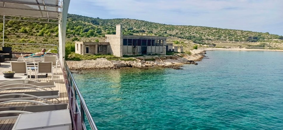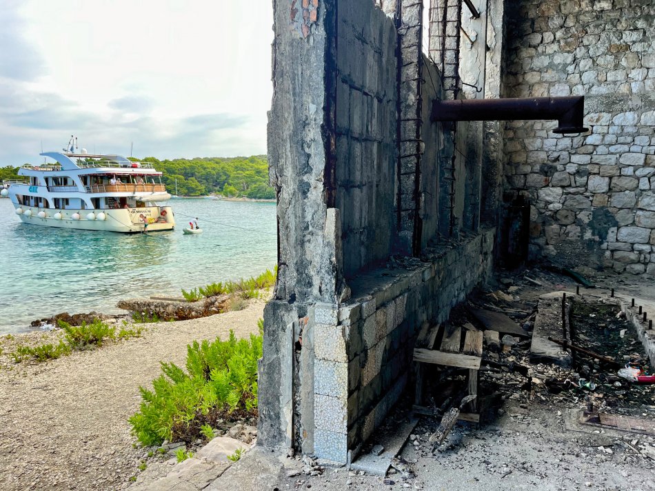 Wir haben Baska gestern früh um 08:00 Uhr verlassen und haben während des Frühstücks Kurs auf die Insel Grgur genommen. Die ehemalige Gefängnisinsel ist heute eine Oase der Ruhe. Nur noch Überreste des Gefängnisareals zeugen heute hier von der dunklen Zeit Jugoslawiens. Spannend, durch die Ruinen zu streifen, den Blick auf die türkis schimmernde Adria immer gegeben. Neben einem kleinen Restaurant gibt es auf der Insel freilebendes Dammwild, das sehr zutraulich und auch ganz schön verfressen ist