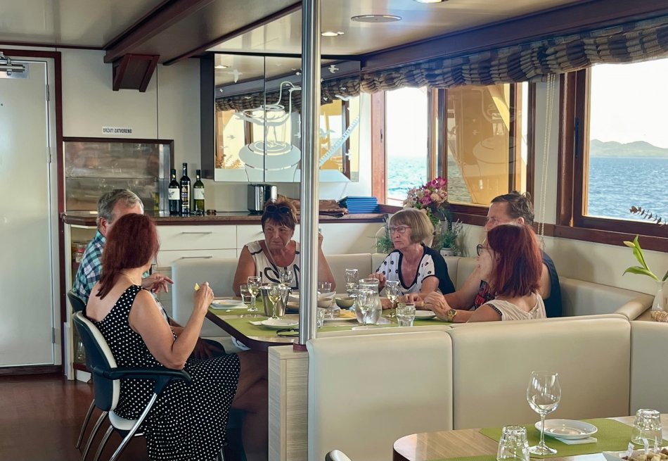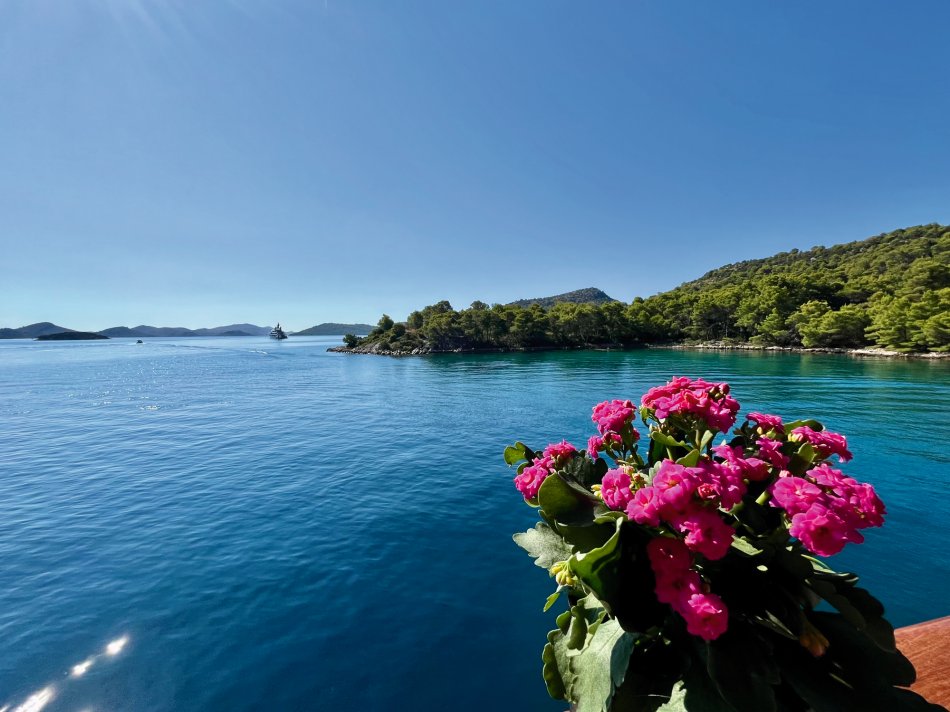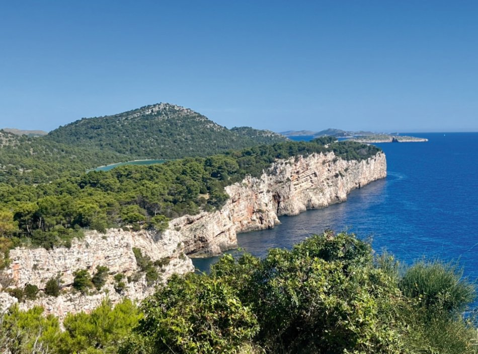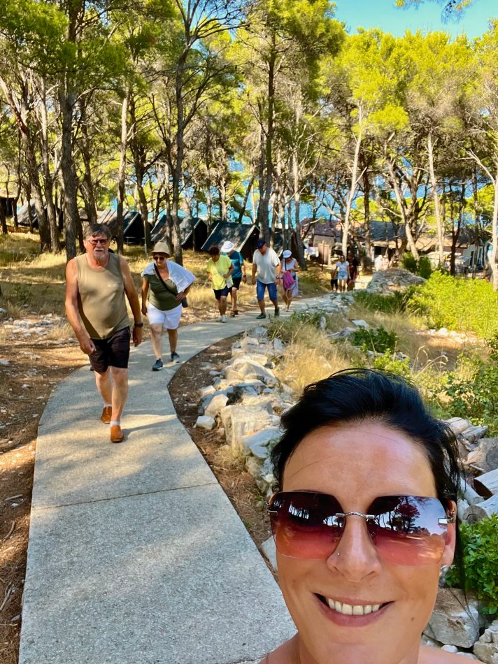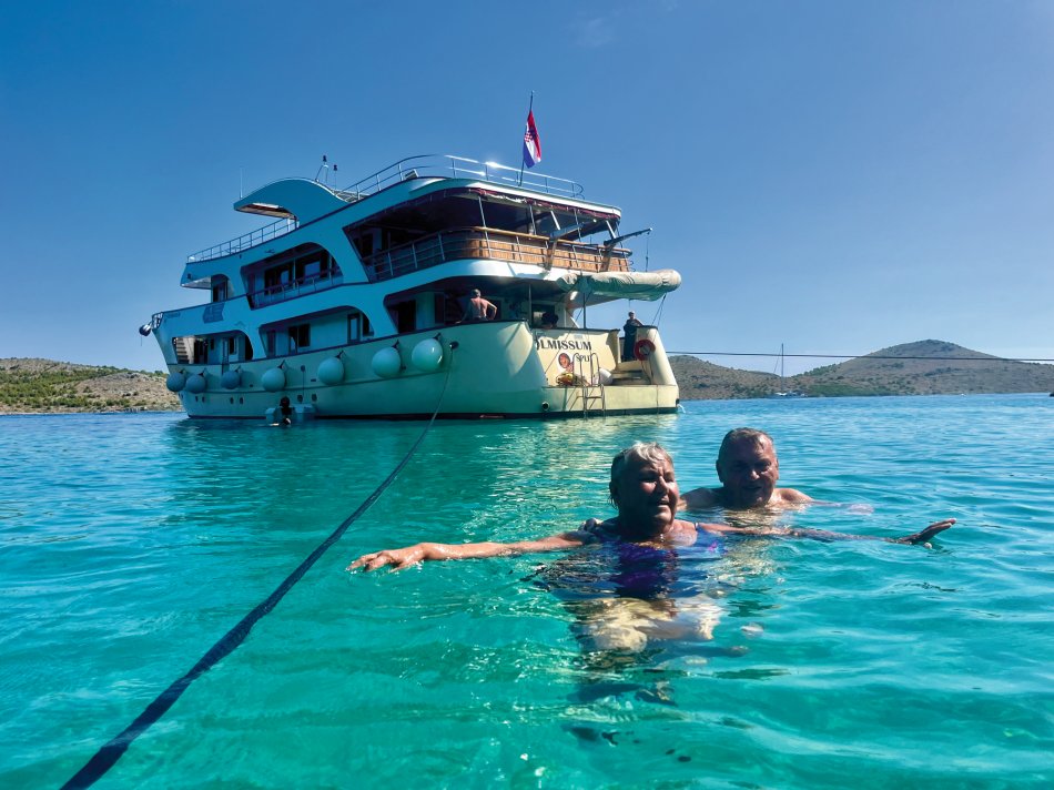 Bereits um 06:30 Uhr haben wir gestern Zadar verlassen und uns auf den Weg Richtung Kornaten begeben. Bei spiegelglatter See ließen wir uns das Frühstück schmecken, während wir die Zdrelac Brücke passierten und durch die Meerenge Mala Proversa fuhren, die kaum breiter war, als unsere MS Olmissum. Der Spruch „eine Handbreit Wasser unter dem Kiel“ ist bei der Durchfahrt durch Mala Proversa tatsächlich Programm, bei einer Tiefe von lediglich 4 Metern. Aber Kapitän Josip ist schließlich Profi und hat uns sicher zu einer der schönsten Badestellen in der Telascica-Bucht navigiert. Atemberaubend glasklares und türkisfarbenes Wasser erwartete uns und alle Gäste stürzten sich ins kühle Nass. Es war herrlich! Da wir Telascica erst um 15:30 Uhr anlaufen konnten, blieb sehr viel Zeit zum Schwimmen, Sonnenbaden und Relaxen an diesem idyllischen Fleckchen. In Telasisca festgemacht, erkundeten wir mit den Gästen den Naturpark und erklommen zunächst einige Stufen, um auf das Aussichtsplateau auf den Klippen zu gelangen. 160 Meter ragen die Klippen hier aus dem Meer heraus und von ganz oben konnte man sogar den Salzsee Mir sehen, dem wir im Anschluss einen Besuch abstatteten. Einige Gäste haben direkt eine kleine Abkühlung im See genossen. Nach einem Erfrischungsgetränk mit Blick auf die Adria ging es mit unserer MS Olmissum weiter nach Sali, wo Jospi zum Captain´s Dinner einlud. Bei einem vorzüglichen Abendessen und Musik zum Tanz klang ein toller Tag stimmungsvoll aus.