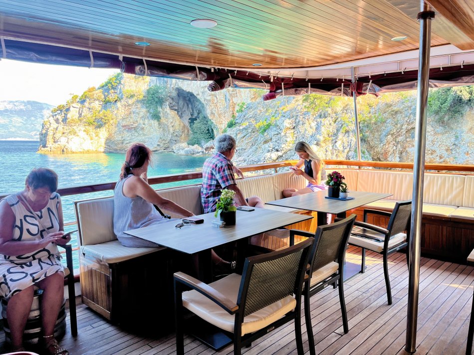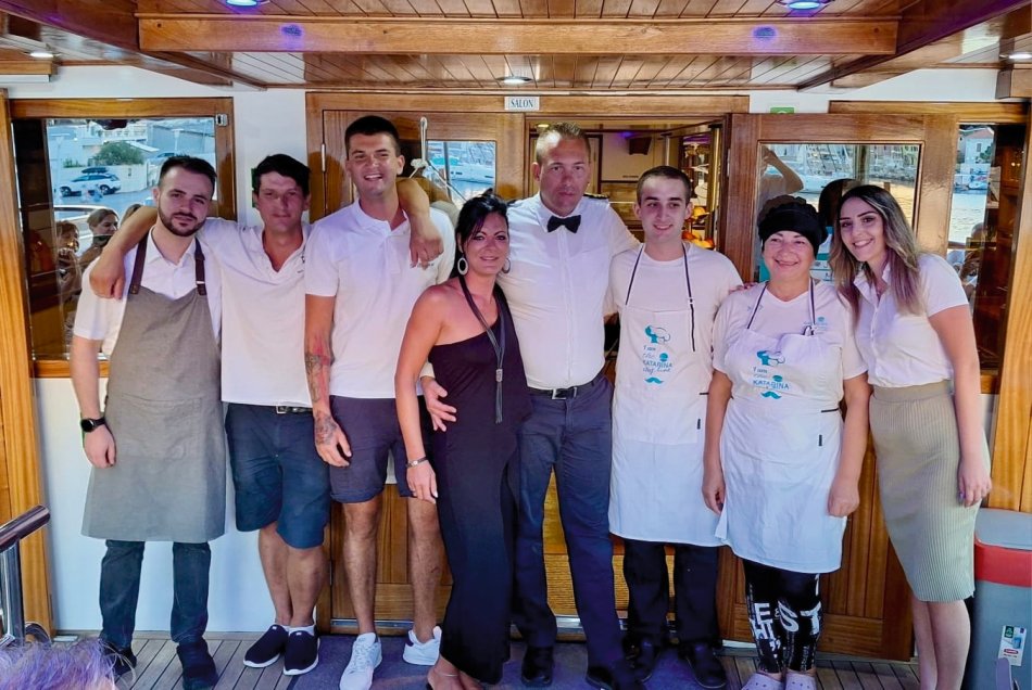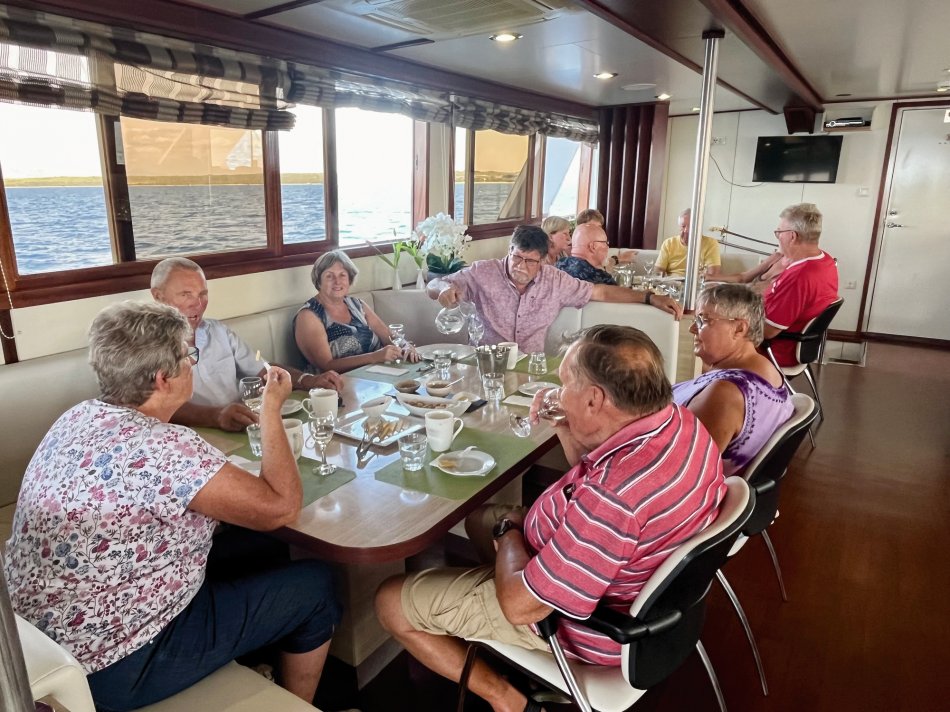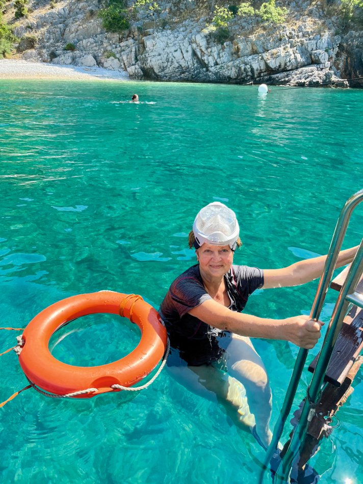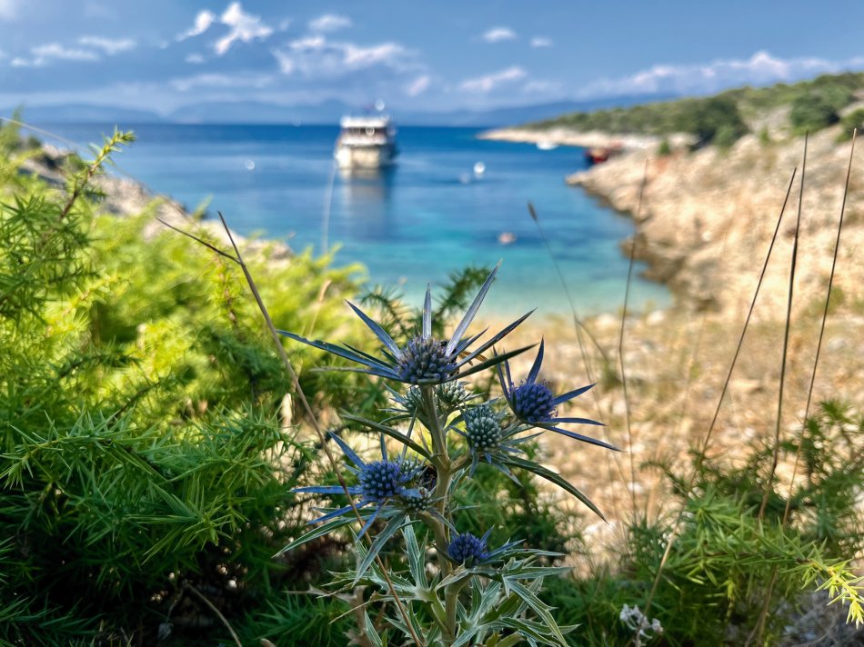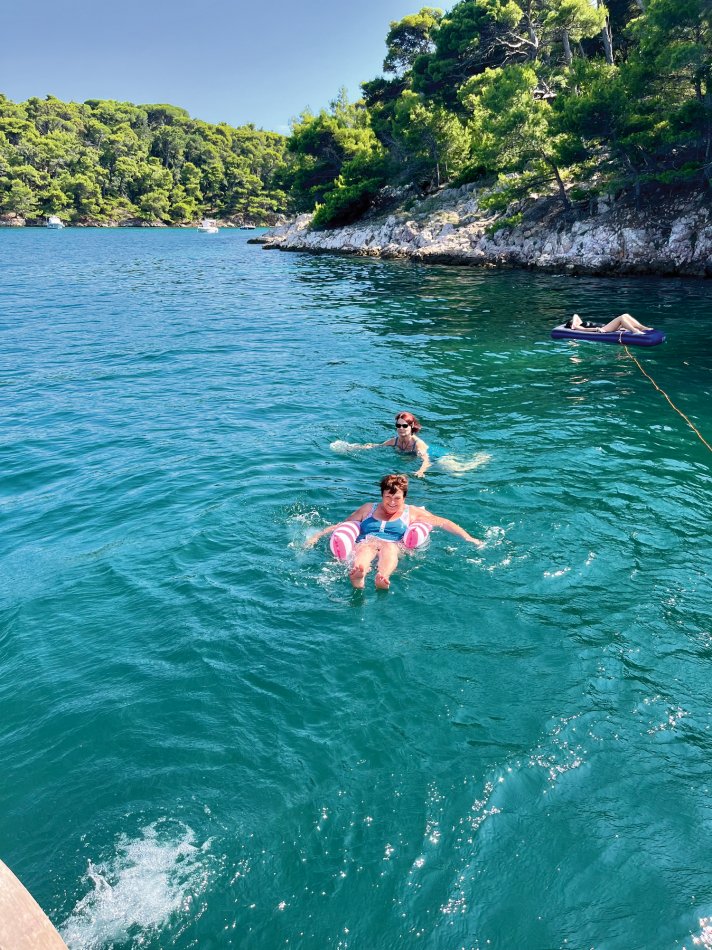 Bereits um 06:30 Uhr haben wir gestern Zadar verlassen und uns auf den Weg Richtung Kornaten begeben. Bei spiegelglatter See ließen wir uns das Frühstück schmecken, während wir die Zdrelac Brücke passierten und durch die Meerenge Mala Proversa fuhren, die kaum breiter war, als unsere MS Olmissum. Der Spruch „eine Handbreit Wasser unter dem Kiel“ ist bei der Durchfahrt durch Mala Proversa tatsächlich Programm, bei einer Tiefe von lediglich 4 Metern. Aber Kapitän Josip ist schließlich Profi und hat uns sicher zu einer der schönsten Badestellen in der Telascica-Bucht navigiert. Atemberaubend glasklares und türkisfarbenes Wasser erwartete uns und alle Gäste stürzten sich ins kühle Nass. Es war herrlich! Da wir Telascica erst um 15:30 Uhr anlaufen konnten, blieb sehr viel Zeit zum Schwimmen, Sonnenbaden und Relaxen an diesem idyllischen Fleckchen. In Telasisca festgemacht, erkundeten wir mit den Gästen den Naturpark und erklommen zunächst einige Stufen, um auf das Aussichtsplateau auf den Klippen zu gelangen. 160 Meter ragen die Klippen hier aus dem Meer heraus und von ganz oben konnte man sogar den Salzsee Mir sehen, dem wir im Anschluss einen Besuch abstatteten. Einige Gäste haben direkt eine kleine Abkühlung im See genossen. Nach einem Erfrischungsgetränk mit Blick auf die Adria ging es mit unserer MS Olmissum weiter nach Sali, wo Jospi zum Captain´s Dinner einlud. Bei einem vorzüglichen Abendessen und Musik zum Tanz klang ein toller Tag stimmungsvoll aus.
