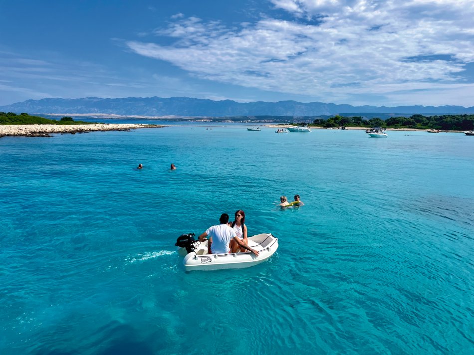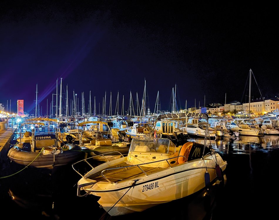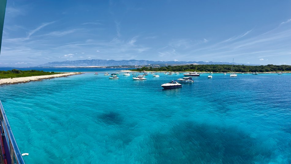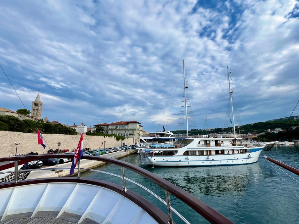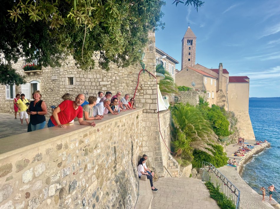 Wir hatten ausgiebig Zeit für eine individuelle Erkundung, einen Kaffee und zum Baden. Zum Mittagessen haben wir Kurs auf die Insel Rab genommen. Die Stadt Rab schon im Blick, war abermals Zeit für eine ausgiebige Badepause und eine Abkühlung in der Adria. Gegen 17:30 haben wir im Hafen von Rab festgemacht und unsere Reiseleiterin Natali hat uns mitgenommen auf einen Streifzug durch die Stadt der Türme. Anschließend klang der Abend, gefolgt von einem Geschäftebummel, in der Konoba Kod Kineza bei einem schmackhaften Abendessen gemütlich aus. An der Riva, umgeben von zahlreichen Bars und Cafés, spielte am Abend noch eine kroatische Band zum Konzert auf.