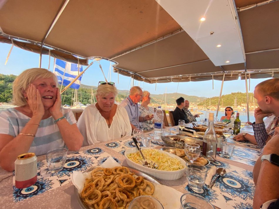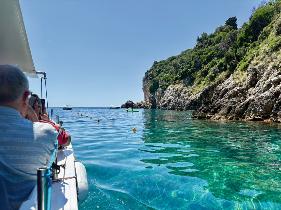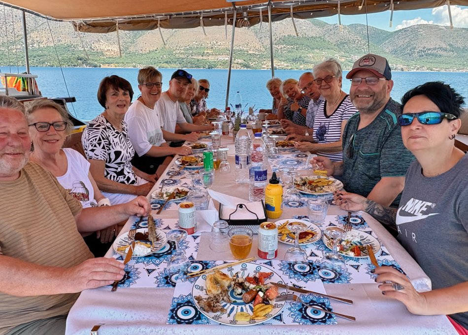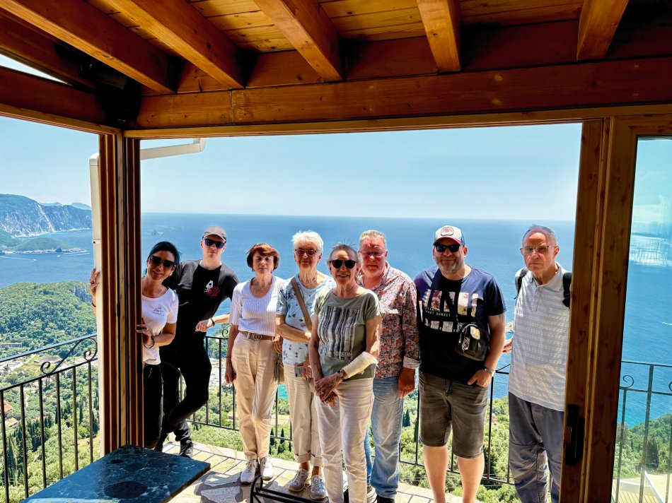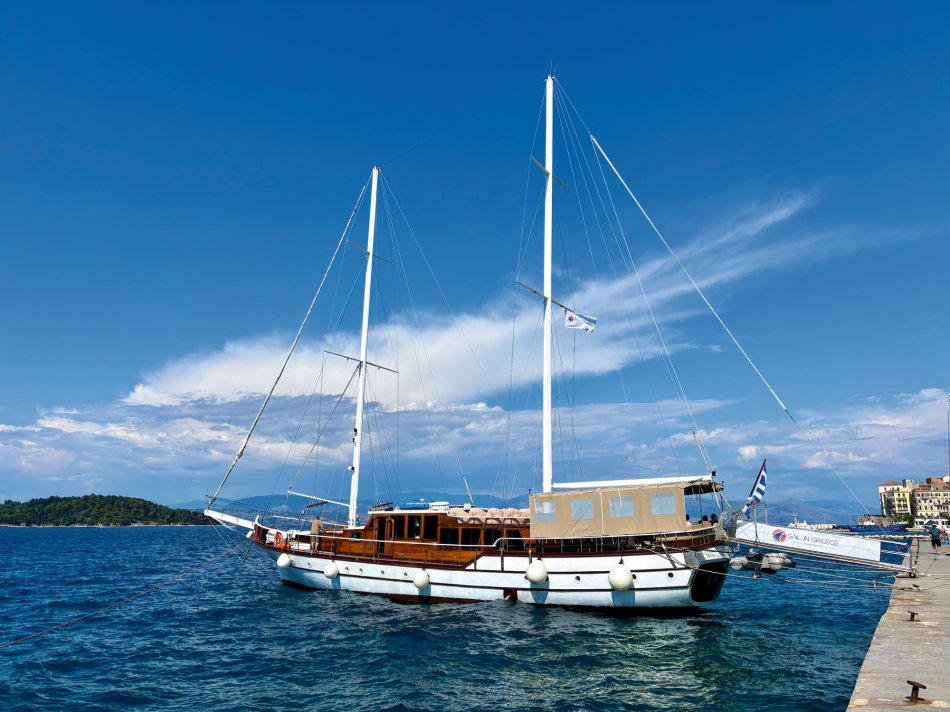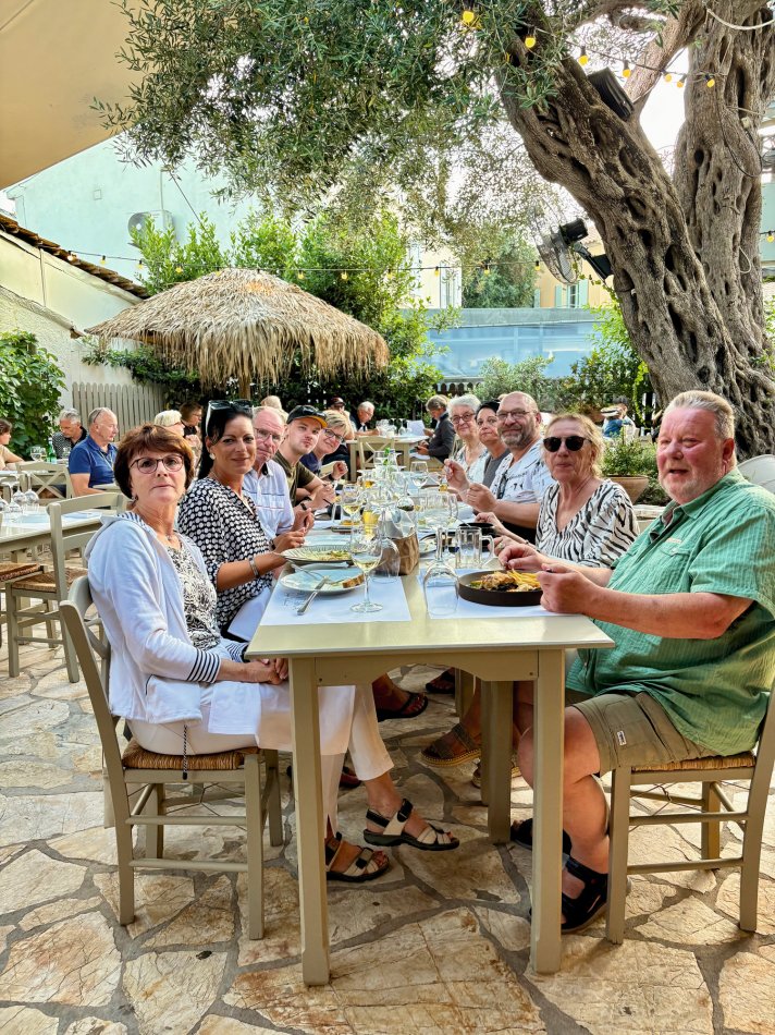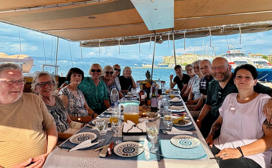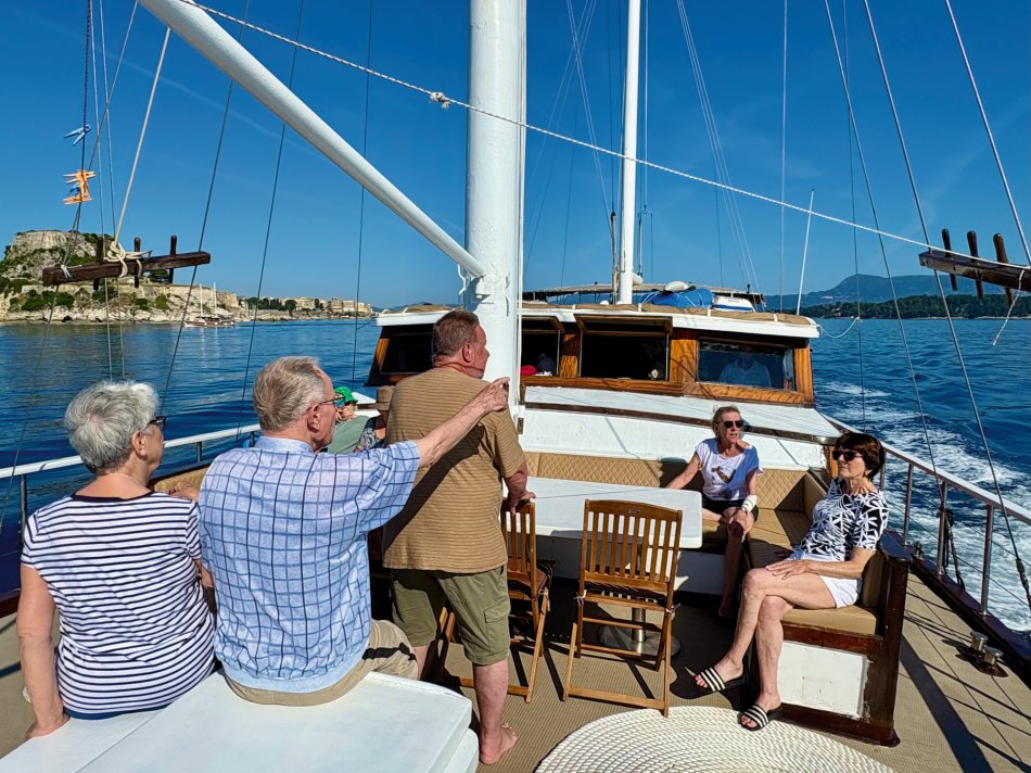 Bereits um 03:00 Uhr gestern Morgen haben wir uns am Flughafen Leipzig getroffen, um in unser Abendteuer „Rund um Korfu mit MS Hera“ zu starten. Durch technische Probleme am Flughafen verzögerte sich der Check-In leider um fast eine Stunde, was der guten Laune unserer kleinen Reisegruppe aber keinen Abbruch tat. Mit knapp 45 Minuten Verspätung sind wir dann Richtung Korfu gestartet und 2,5 Stunden später sicher gelandet. Am Flughafen wurden wir herzlich von Reiseleiterin Carola und Busfahrer Nico empfangen, die uns auf eine kleine Besichtigungstour in den Nord-Westen der Insel mitnahmen, um die Zeit bis zum Check-In auf unsere Gulet zu überbrücken. Erster Stopp war im Yachthafen von Korfu, wo wir Zeit für eine ausgiebige Frühstückspause mit Blick auf die zahlreichen Segelboote hatten. Frisch gestärkt ging es anschließend weiter nach Paleokastritsa – eine kleine Perle auf der Insel Korfu. In der herrlichen Bucht wechselten wir vom Bus auf ein kleines Ausflugsboot und unternahmen eine 45-minütige Bootsfahrt zu den verschiedenen Grotten, in denen sich bunte Fische tummelten und sich die glasklare Ägäis spiegelte. Anschließend ging es mit dem Bus weiter ins Bergdorf Lakones. Nach einer abenteuerlichen Fahrt (die Straßen sind nur 30 cm breiter als der Bus 😊) erreichten wir das Café Bella Vista. Bei einem Kaffee oder einem Erfrischungsgetränk genossen wir den fantastischen Ausblick auf das uns zu Füßen liegende Paleokastritsa. Traumhaft! Anschließend ging es weiter in den Alten Hafen von Korfu, wo wir um 16:30 Uhr herzlich an Bord von MS Hera empfangen wurden. Die Kabinen wurden bezogen und um 17:00 Uhr erwartete uns die Crew zu einem Willkommensgetränk mit kleinen Häppchen. Die Zeit bis zum Welcome-Dinner nutzen wir zum Entspannen und Ausruhen nach dem langen Tag. Bei knackigen Salaten, Pasta, typische griechischen Spezialitäten und leckerem Wein klang der erste Abend gemütlich aus.