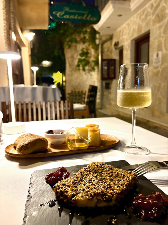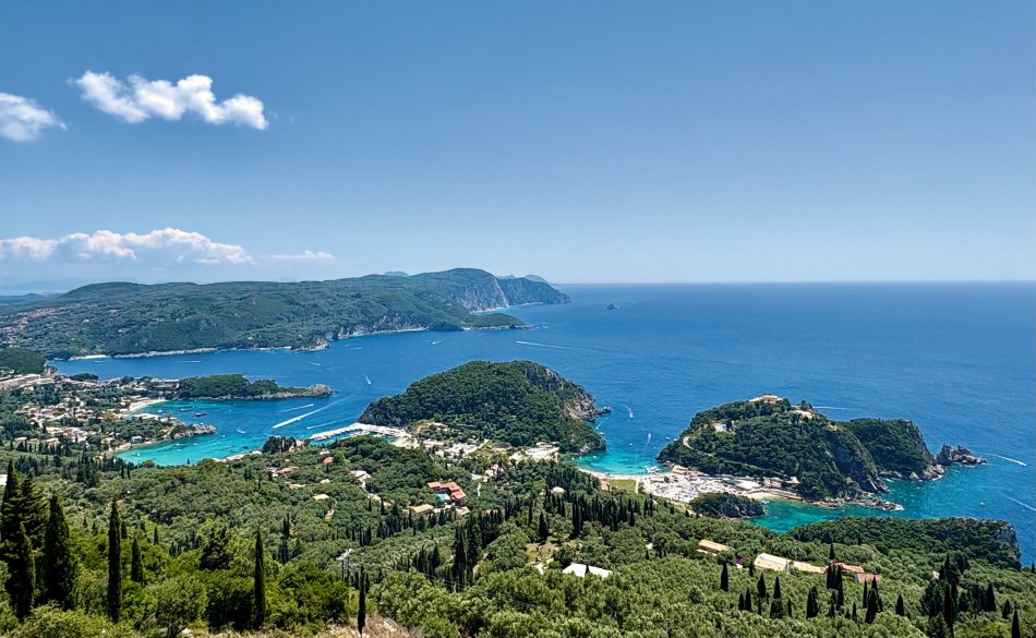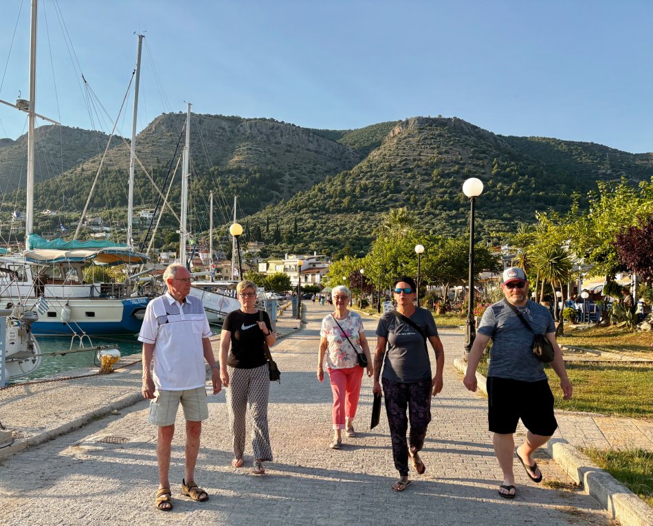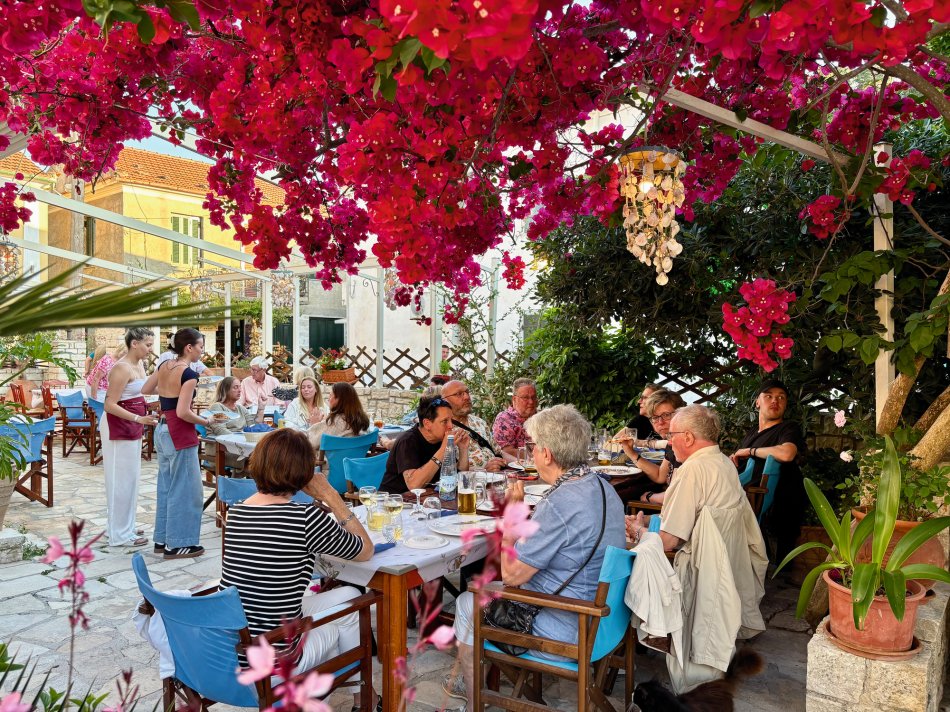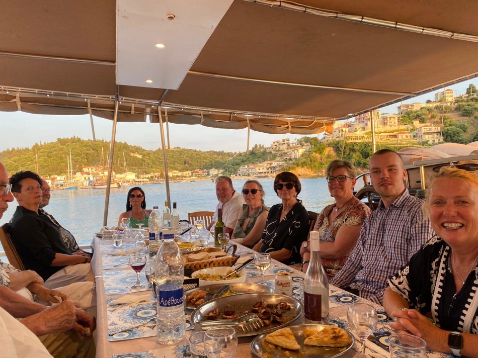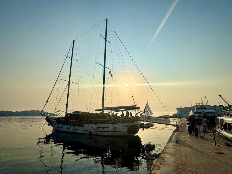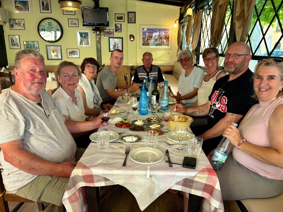 Bereits um 03:00 Uhr gestern Morgen haben wir uns am Flughafen Leipzig getroffen, um in unser Abendteuer „Rund um Korfu mit MS Hera“ zu starten. Durch technische Probleme am Flughafen verzögerte sich der Check-In leider um fast eine Stunde, was der guten Laune unserer kleinen Reisegruppe aber keinen Abbruch tat. Mit knapp 45 Minuten Verspätung sind wir dann Richtung Korfu gestartet und 2,5 Stunden später sicher gelandet. Am Flughafen wurden wir herzlich von Reiseleiterin Carola und Busfahrer Nico empfangen, die uns auf eine kleine Besichtigungstour in den Nord-Westen der Insel mitnahmen, um die Zeit bis zum Check-In auf unsere Gulet zu überbrücken. Erster Stopp war im Yachthafen von Korfu, wo wir Zeit für eine ausgiebige Frühstückspause mit Blick auf die zahlreichen Segelboote hatten. Frisch gestärkt ging es anschließend weiter nach Paleokastritsa – eine kleine Perle auf der Insel Korfu. In der herrlichen Bucht wechselten wir vom Bus auf ein kleines Ausflugsboot und unternahmen eine 45-minütige Bootsfahrt zu den verschiedenen Grotten, in denen sich bunte Fische tummelten und sich die glasklare Ägäis spiegelte. Anschließend ging es mit dem Bus weiter ins Bergdorf Lakones. Nach einer abenteuerlichen Fahrt (die Straßen sind nur 30 cm breiter als der Bus 😊) erreichten wir das Café Bella Vista. Bei einem Kaffee oder einem Erfrischungsgetränk genossen wir den fantastischen Ausblick auf das uns zu Füßen liegende Paleokastritsa. Traumhaft! Anschließend ging es weiter in den Alten Hafen von Korfu, wo wir um 16:30 Uhr herzlich an Bord von MS Hera empfangen wurden. Die Kabinen wurden bezogen und um 17:00 Uhr erwartete uns die Crew zu einem Willkommensgetränk mit kleinen Häppchen. Die Zeit bis zum Welcome-Dinner nutzen wir zum Entspannen und Ausruhen nach dem langen Tag. Bei knackigen Salaten, Pasta, typische griechischen Spezialitäten und leckerem Wein klang der erste Abend gemütlich aus.