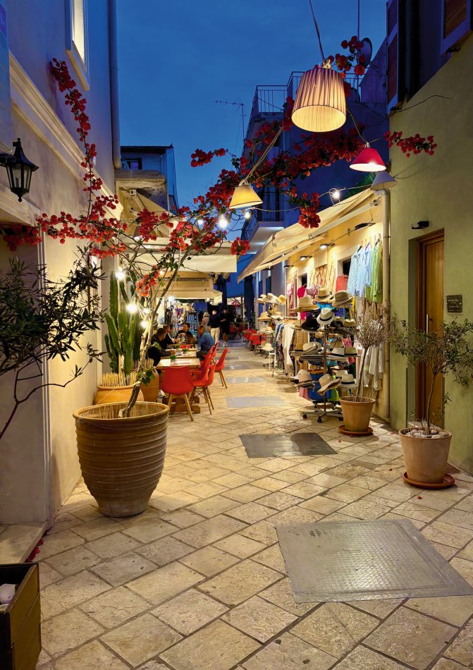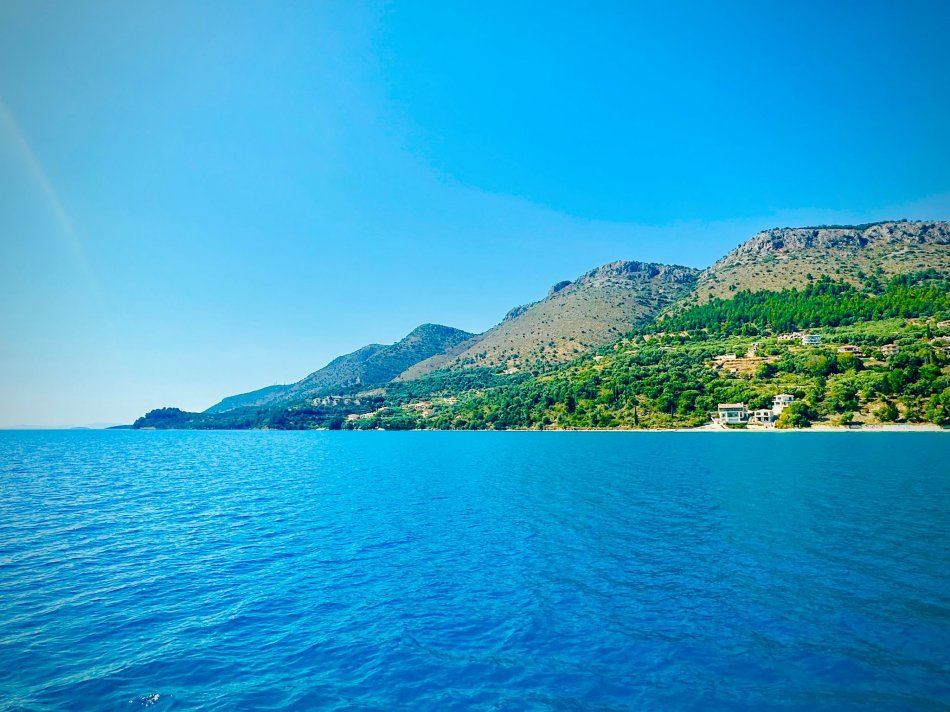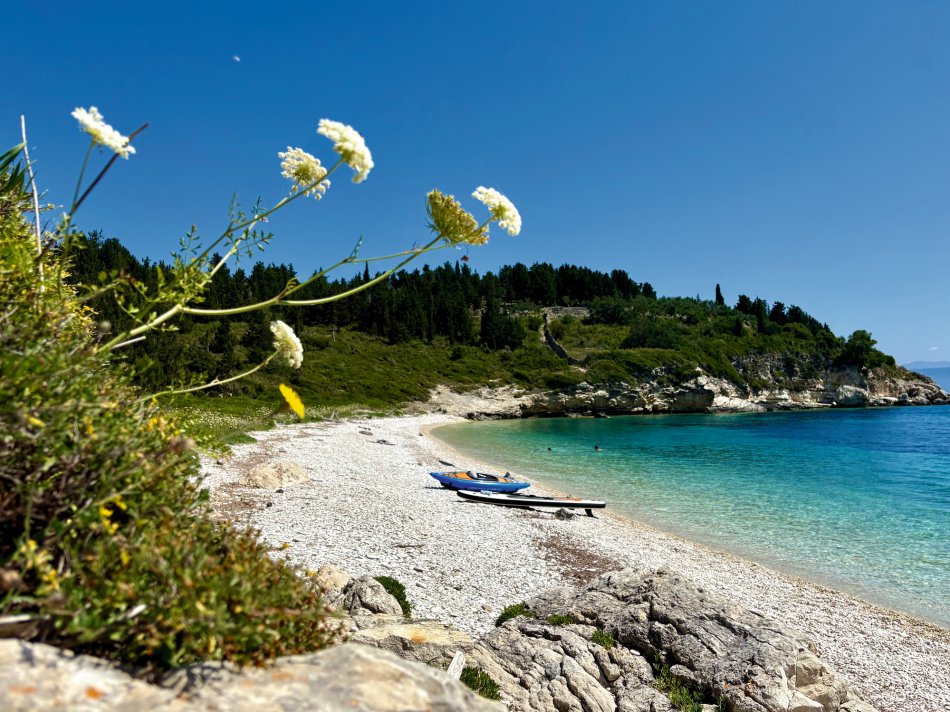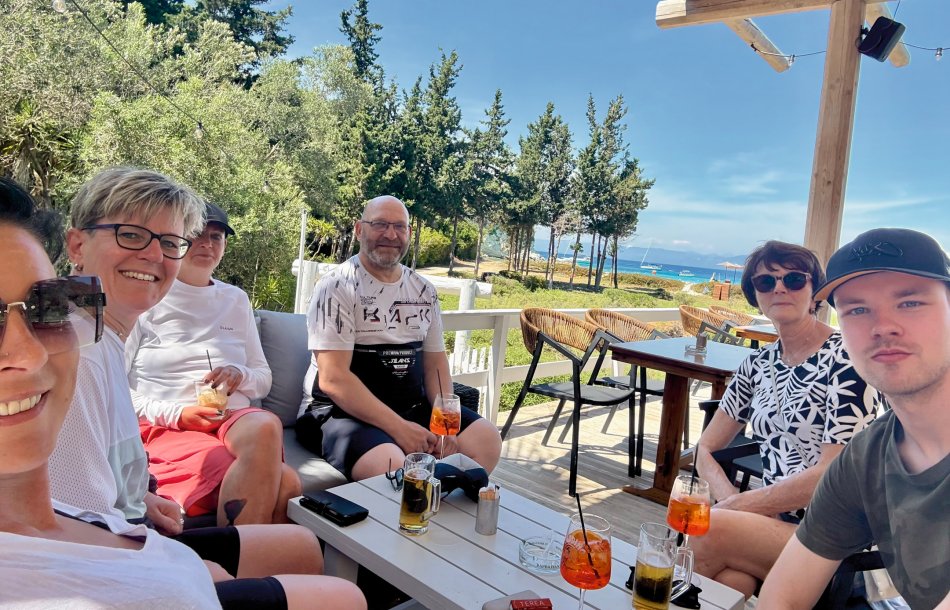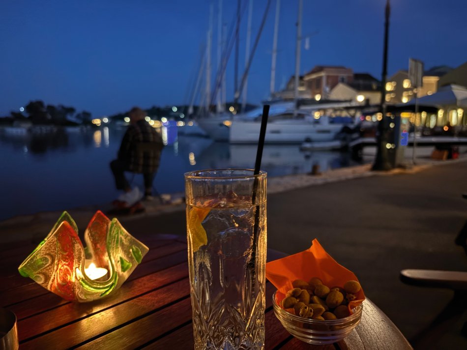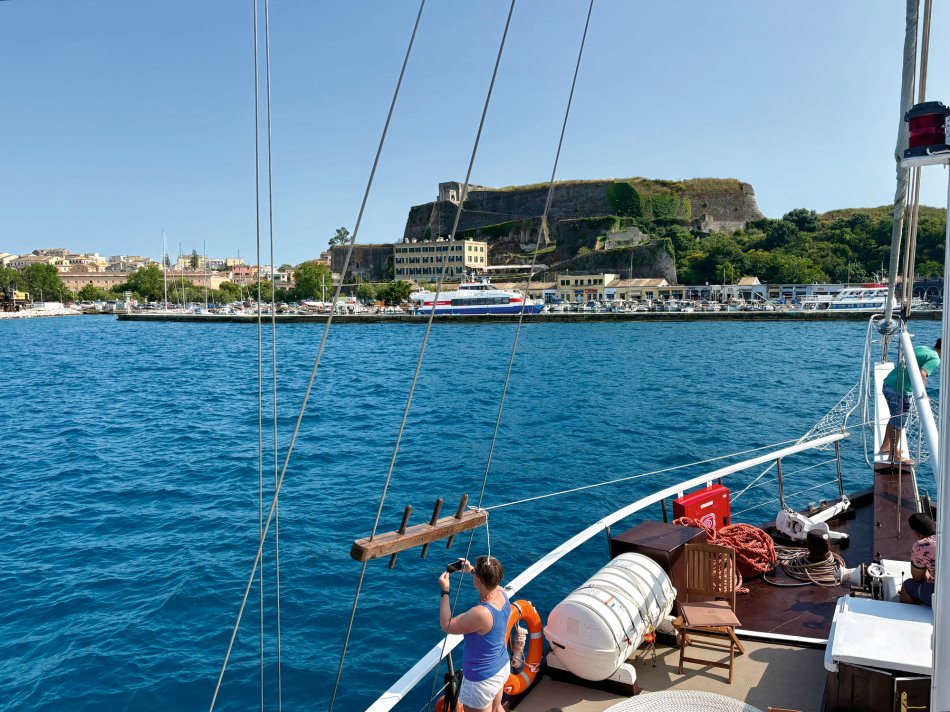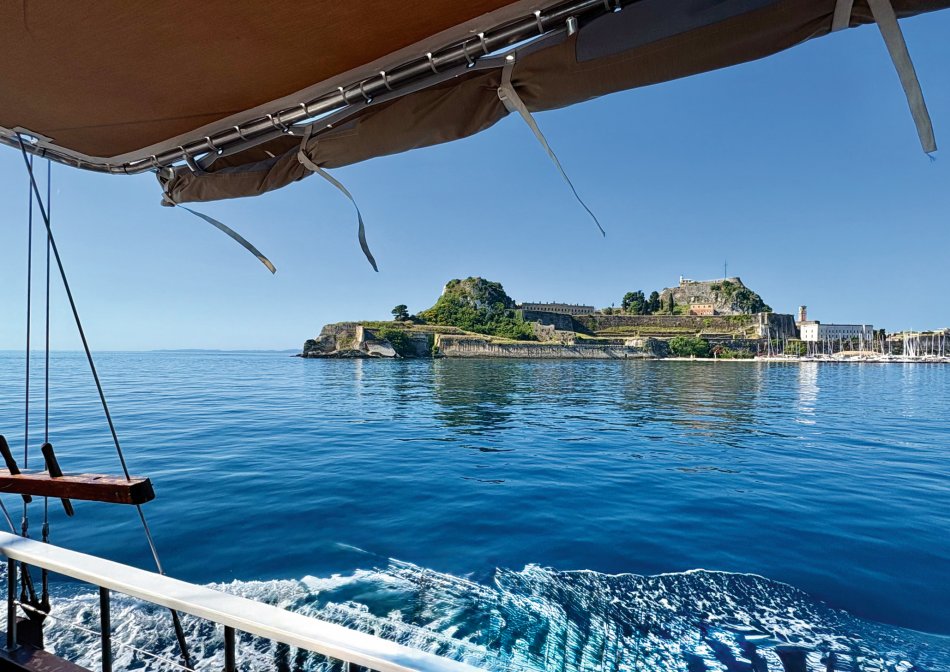 Letzter Kreuzfahrttag ☹ Während des Frühstücks haben wir die Sonne und den Blick auf das erwachende Syvota genossen. Dann nahmen wir Kurs zurück nach Korfu. Herrlich entspannt war die Überfahrt. Wir dösten in der Sonne, plauderten bei einem Aperol Spritz und erreichten das, der Insel Korfu vorgelagerte Inselchen Vido, wo der Anker ausgelegt wurde. Hinein ging es ein letztes (aber ausgiebiges) Mal ins kühle Nass. Mit dem SUP und dem Kajak erkundeten wir den Strand, der auch anderen kleinen Segelbooten und Katamaranen als Badestelle diente. Glasklares Wasser, bei dem man bis auf den Grund schauen konnte, erwartete uns. Ein letztes Mittagessen, bevor es langsam ans Kofferpacken ging. Wir genossen die Überfahrt zum Altstadthafen von Korfu, wo uns Reiseleitung Carola und Stephanus erwarteten, um mit uns durch die Stadt zu ziehen. Der entspannte Rundgang führte durch die zahlreichen Gässchen, die gespickt sind mit einer Vielzahl an Läden und kleinen Cafés, vorbei an der Festung und hübschen, trubeligen Plätzen. In der urigen Taverne Pergola erwartete uns dann griechischer Wein zur Verkostung. Außerdem wurden zahlreiche kleine Tellerchen mit leckeren regionalen Spezialitäten, Olivenöl und frischem Brot gereicht. Umrahmt wurde der Abend dann noch durch Live-Musik. Ein herrlicher Abschluss einer wirklich schönen Reise.