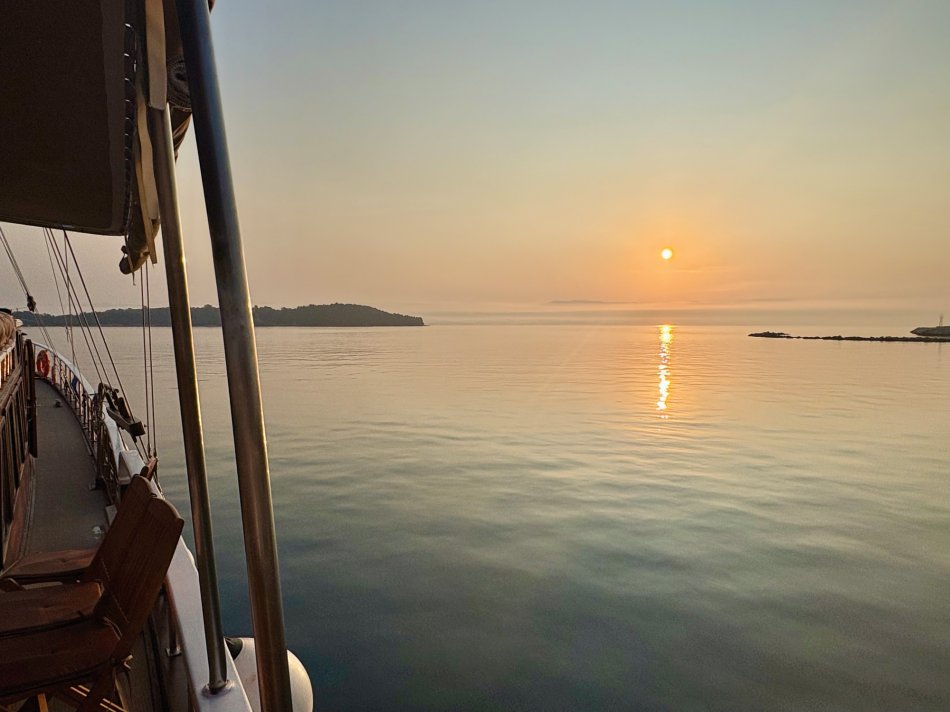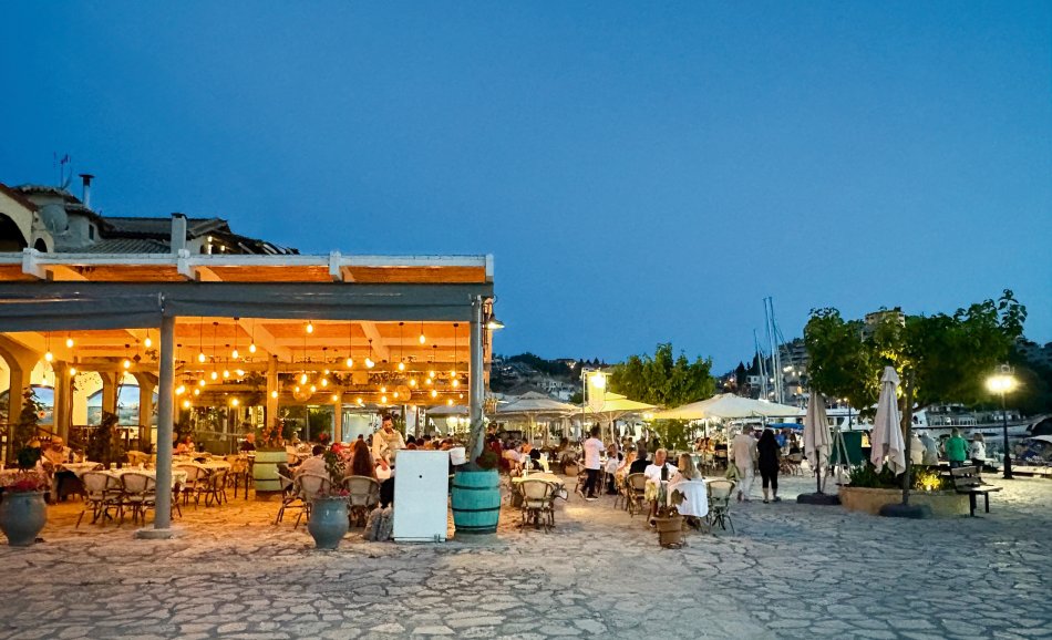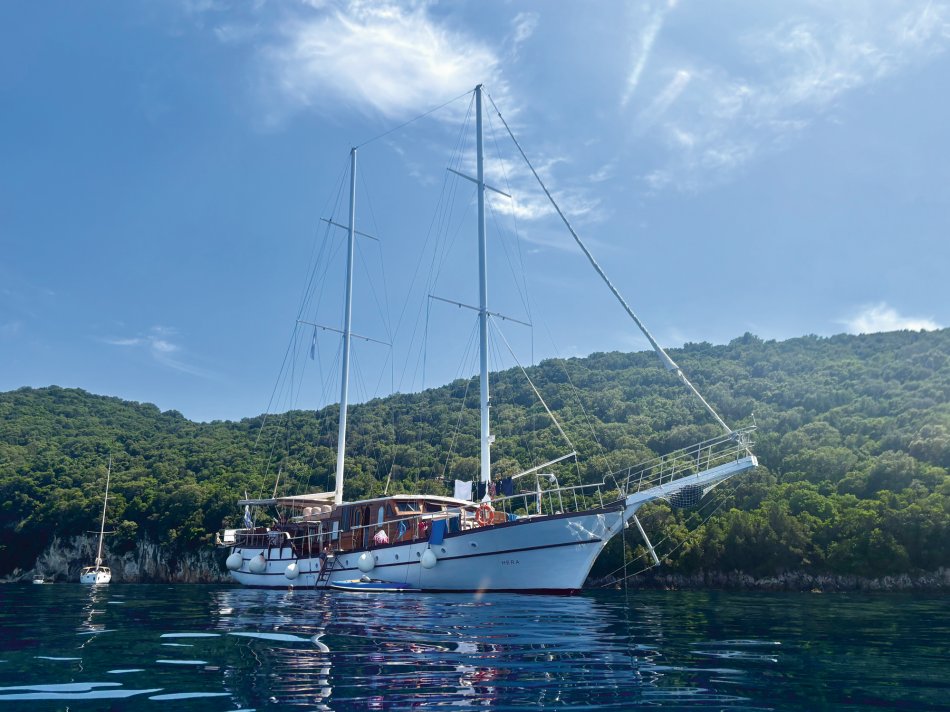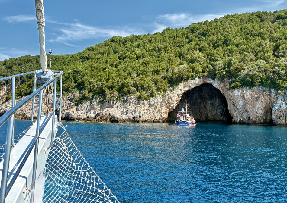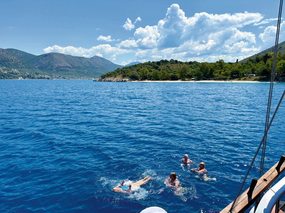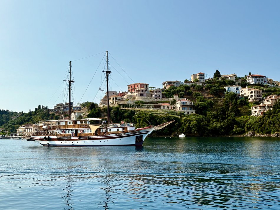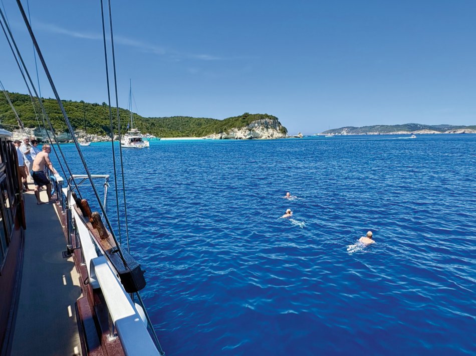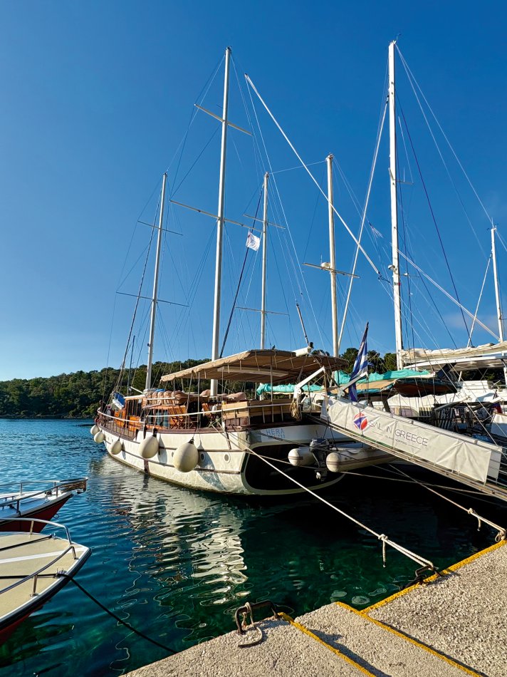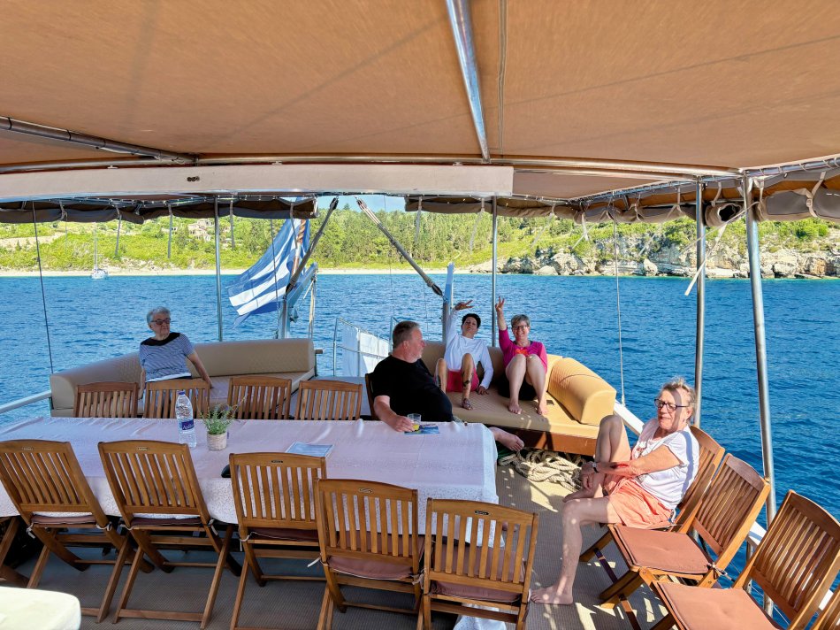 Nach einer ruhigen Nacht im Fischerdörfchen Plataria und einem Frühstück an Bord im Sonnenschein haben wir gegen 09:15 Uhr Kurs auf die Insel Antipaxos genommen. Die kleinste der Ionischen Inseln ist nur 5 km² groß und völlig unberührt. Es gibt ein Netz aus schmalen Wegen, die ins Inselinnere führen, vorbei an einzelnen Häusern, wilden Kräutern und Weinbergen. Wir haben die paradiesische Bucht des Voutomi Beach angesteuert. Paradiesisch trifft es wirklich – der weiße Kieselstrand hebt sich perfekt ab vom helltürkisfarbenen Wasser. Mit dem Dingi haben wir uns zum Strand übersetzen lassen und hatten Zeit zum Schwimmen, Spazieren und natürlich auch zur Einkehr in die einzige geöffnete kleine Taverne. Bei einem Aperol Spritz haben wir das fantastische Flair genossen. Erst um 16:00 Uhr haben wir Kurs auf die Nachbarinsel Paxos genommen und sind um 16:30 Uhr im hübschen Hafen von Gaios angekommen – dem Hauptort der Insel. Die lange Promenade war gespickt mit Segelboten, Katamaranen und kleinen Fischkuttern und lud zu einem Spaziergang ins Ortszentrum ein. Kleine Boutiquen, Souvenirläden und eine Vielzahl an Tavernen und Cafés warteten hier auf unsere Gäste. Der trubelige Stadtplatz mit malerischen Häusern und ein Labyrinth aus kleinen, engen Gassen luden zum Bummeln und Verweilen ein. Unsere Gäste sind unserer Restaurantempfehlung gefolgt und zum Abendessen ins Taka Taka Seafood Restaurant eingekehrt. Unter den Ästen einer mächtigen Olive haben wir hier griechischen Wein und leckere Köstlichkeiten genossen. Noch ein Absacker in einer der kleinen Bars entlang der Uferpromenade, bevor man sich auch auf dem Schiff noch zu einem „flüssigen Betthupferl“ zusammenfand. Ein toller Tag ging in gemütlicher Atmosphäre zu Ende.