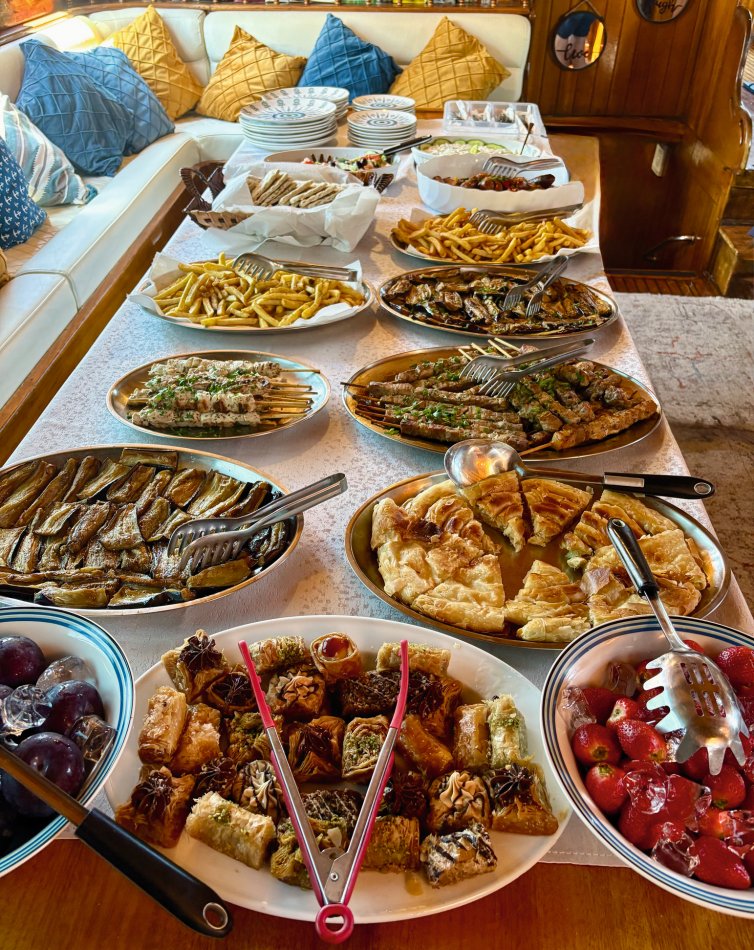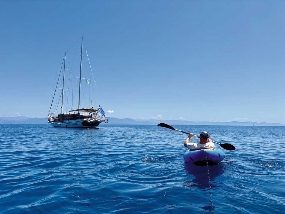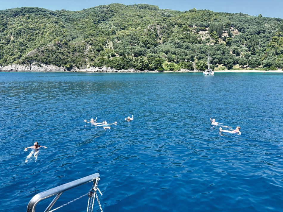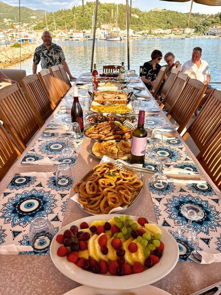 Wir haben eine ruhige Nacht in der Bucht neben Parga verbracht und natürlich wieder ein hervorragendes Frühstück bei strahlendem Sonnenschein und tollen Ausblicken genossen. Gegen 09:30 wurde der Anker gelichtet und wir haben Kurs auf die Blaue Grotte genommen. Sehr imposant, aber leider ist unser Schiffchen ein bisschen zu groß, um hinein zu fahren. Also ging es weiter zu nahe gelegenen Blauen Lagune, wo wir für unseren ausgiebigen Badestopp ankerten. Spiegelglatte See und glasklares Wasser empfing uns hier. Das Kajak und das Stand-up-Paddle wurden zu Wasser gelassen und los ging es zur Erkundung der kleinen Meereshöhlen und an den herrlichen Strand, der in der Bucht nestelte. Nach dem Mittagessen und einer kleinen Mittagspause haben wir uns alle noch mal in die Fluten gestürzt und uns anschließend auf dem Sonnendeck trocknen lassen. Gegen 17:00 Uhr haben wir den beschaulichen Hafen von Syvota erreicht und für die Nacht festgemacht. Es blieb Zeit für einen kleinen Bummel entlang der schönen Promenade, bevor Kapitän Stelios zum Captain´s Dinner eingeladen hat. Bei Meeresfrüchten, griechischen Spezialitäten, frischem Obst, Baklava und natürlich jeder Menge griechischem Wein haben wir einen geselligen Abend genossen. Anschließend noch ein Verdauungsspaziergang (oder auch Einkaufsbummel 😉) durch das hübsche Syvota, bevor am Schiff noch mal die Gläser erklangen.