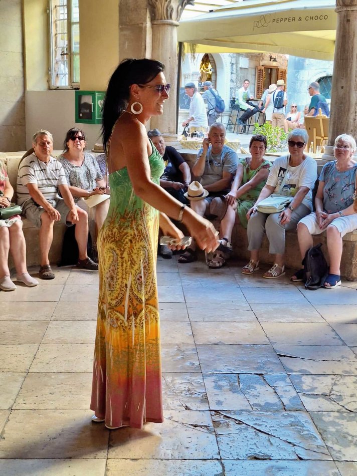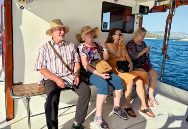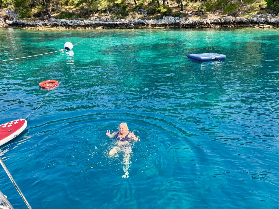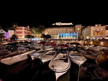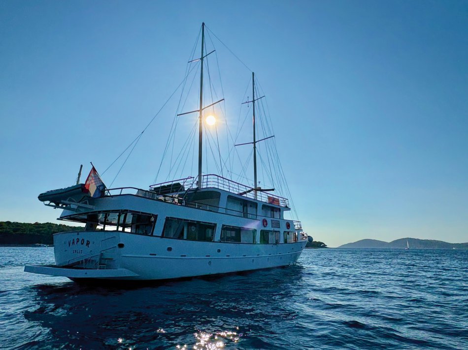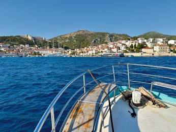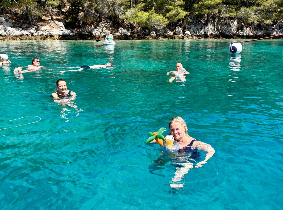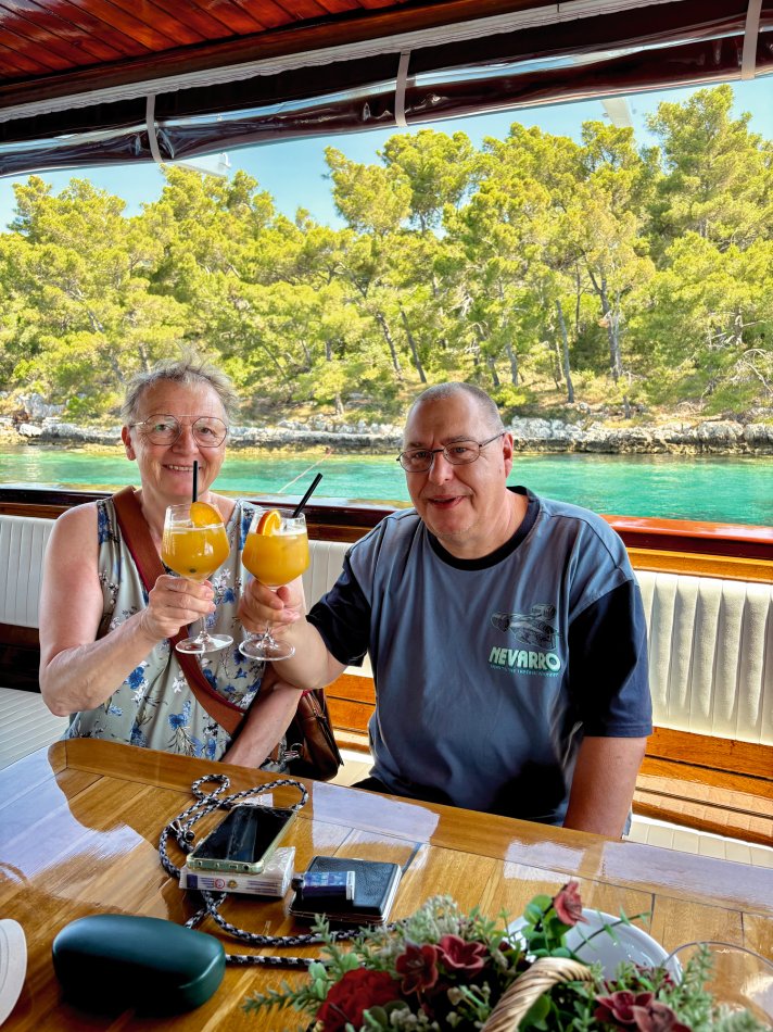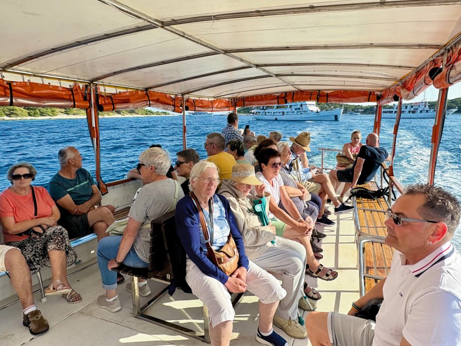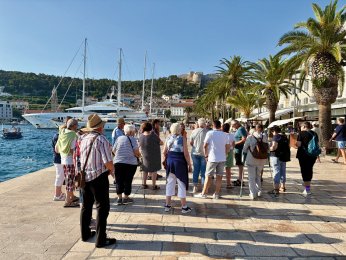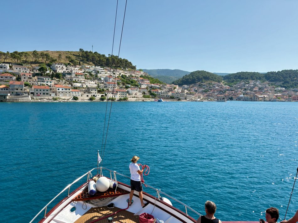 Abflug ab Berlin war 07:25 Uhr. Einige Gäste trafen sich bereits um 02:30 Uhr in Halle am Transferbus zum Flughafen. Mit 20 Gästen haben wir das Flugzeug bestiegen und hatten einen ruhigen und super schnellen Flug (sind 30 Minuten früher gelandet) nach Split, wo wir bereits von Ante erwartet wurden, der uns in 35 Minuten zum Hafen von Split brachten. Die Koffer wurden am Schiff abgegeben und wir zogen noch mal los, um eine erste kleine Erfrischung mit Blick auf das Gewusel im Hafen zu genießen. Gegen 11:30 Uhr bezogen wir dann die Kabinen und richteten uns häuslich ein. Um 13:30 Uhr hatten wir dann alle Gäste an Bord und wurden offiziell von Der Crew begrüßt. Während des Mittagessens nahmen wir Kurs auf die Insel Brac, wo wir in der Nähe von Milna einen ersten kurzen Badestopp genossen haben. Hinein ins erfrischende und glasklare Wasser…. Weiter ging es nach Hvar, wo wir um 17:30 Uhr vor Anker lagen. Um 18:00 Uhr kam unser Taxiboot in Sicht, was uns direkt an die Plamengesäumte Uferpromenade brachte. Dort wurden wir von Reiseleiterin Nikol zum gemütlichen Stadtspaziergang durch das „St. Tropez Kroatiens“ erwartet. Luxuriöse Yachten, bunt gemischtes Publikum aus aller Welt, weitläufige Plätze und enge Gässchen erwarteten uns. Anschließend stand der Rest des Abends zur freien Verfügung. Nach einem individuellen Abendessen in toller Atmosphäre bekamen wir sogar noch ein klassisches Konzert geboten. Geschafft aber glücklich endete für Reiseleitung Nicole der Abend um kurz vor Mitternacht mit der Vorfreude auf den kommenden Tag….