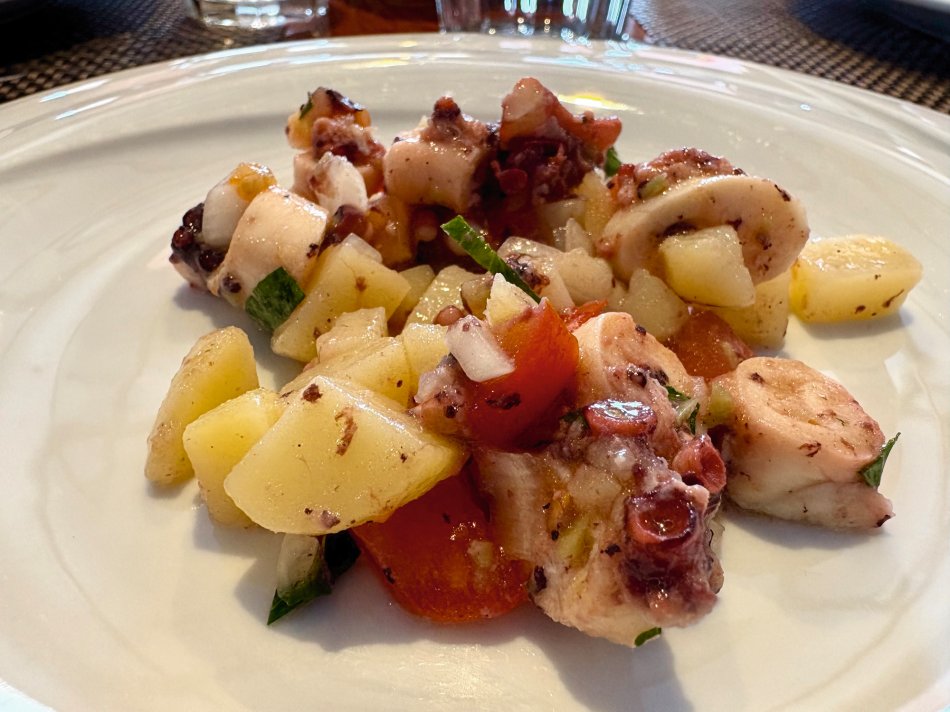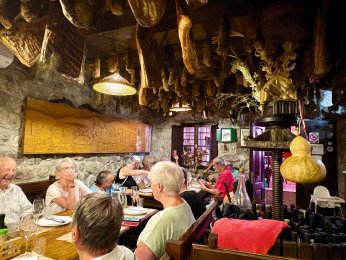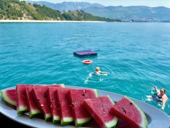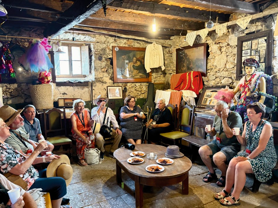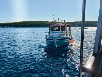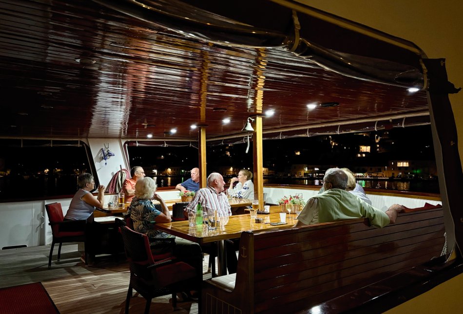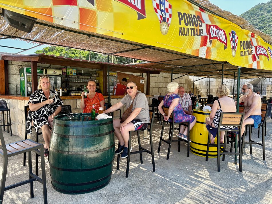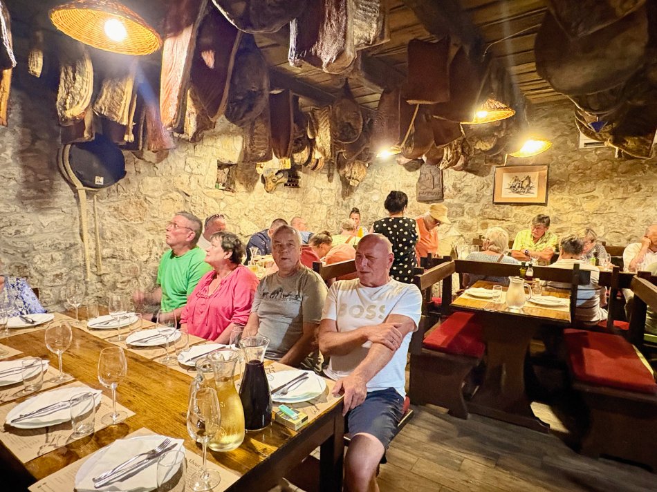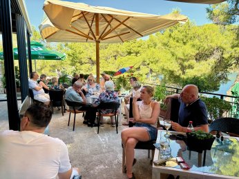 Nach einem stimmungsvollen Abend haben wir gestern um 08:00 Uhr unseren Anlegesteg verlassen und sind entlang der Nordküste von Lastovo bis zur kleinen Pier von Mihovil gefahren, wo wir am Steg für unsere Badepause fest gemacht haben. Abermals empfing uns glasklares Wasser, was zum ausgiebigen baden einlud. Außerdem befand sich an der kleinen Bier die Café Bar Mihajla, wo einige von unseren Gästen zu einem Erfrischungsgetränk mit Blick auf die Bucht und unsere Vapor einkehrten. Gegen 12:00 Uhr haben wir den Naturpark Lastovo verlassen und uns auf den Weg zur Insel Korčula begeben. Vorm beliebten Badeort Lumbarda wurde für unsere zweite Badepause geankert. Gegen 16:00 Uhr ging es dann weiter zur Halbinsel Pelješac, wo wir das beschauliche Örtchen Trstenik ansteuerten, was, umgeben von steil aufragenden Hügeln, urig in einer Bucht mit herrlichem Strand nestelt. Hier ist die Welt noch in Ordnung! Es gibt nur ein paar Häuser, zwei kleine Restaurants und ein paar Bars an der Promenade, die zu einem Spaziergang einlädt. Wir haben für unsere Gäste einen Ausflug ins Hinterland organisiert. Mit dem Bus ging es in kleine Dörfchen Kuna zu Familie Antunovic. Sie betreiben eine Eselfarm, bauen ihr eigenes Gemüse an und produzieren ihren eigenen Wein aus 10.000 Rebstöcken. Nachdem wir den Vierbeinigen Familienmitgliedern einen Besuch abgestattet haben, wurden wir herzlich in ihrer Konoba empfangen. Im großen Kamin drehte sich ein Spanferkel und unsere Peka buk unter der heißen Kohle zur Vollendung. Der kleine Gastraum war total urig mit zig Schinken, die unter der Deck hingen. Nach einem Begrüßungsschnäpschen wurden wir mit Wein aus eigener Herstellung und einer typisch dalmatinischen Vorspeisenplatte verköstigt, bevor das Hauptgericht – die Peka – auf großen Platten serviert wurde. Köstlich und wirklich authentisch! Mehr Wein wurde gereicht und das hausgemachte Dessert serviert, bevor wir um 21:00 Uhr unseren Rückweg nach Trstenik antraten. Es gab noch den ein oder anderen Absacker bei ausgelassener Stimmung, bevor sich ein toller Tag dem Ende entgegen neigte.