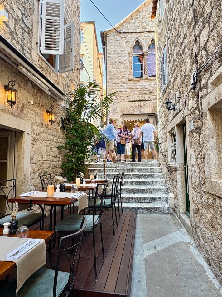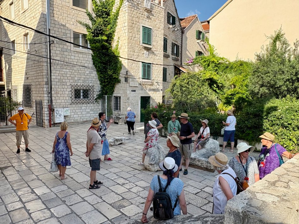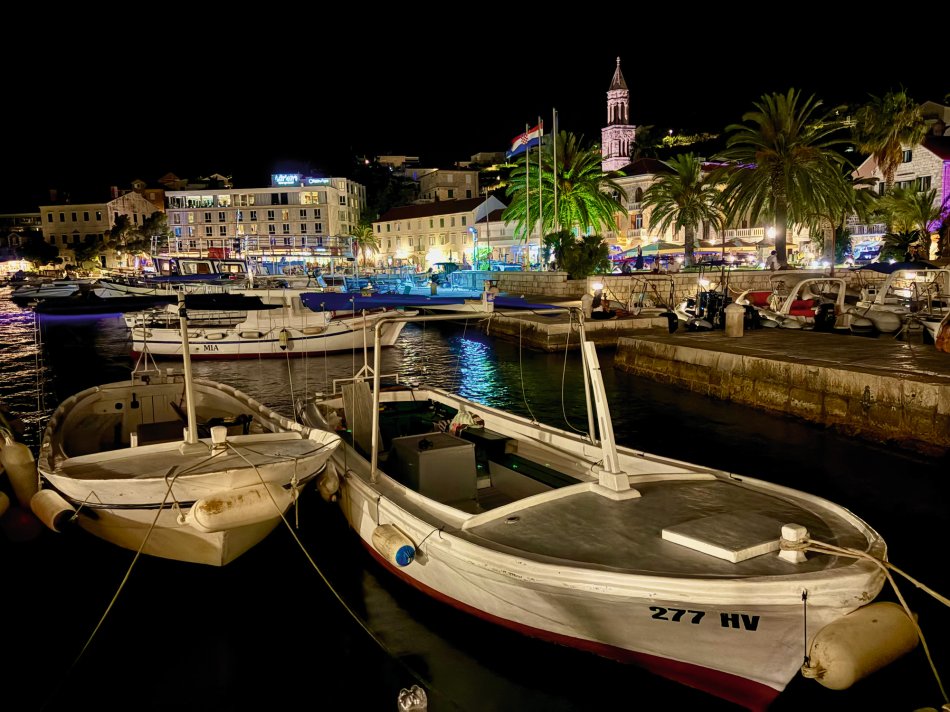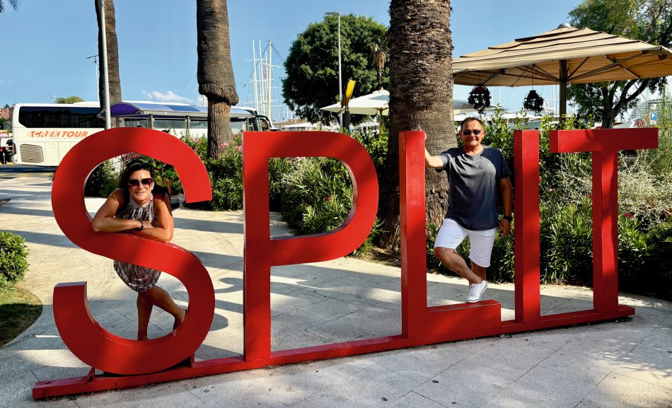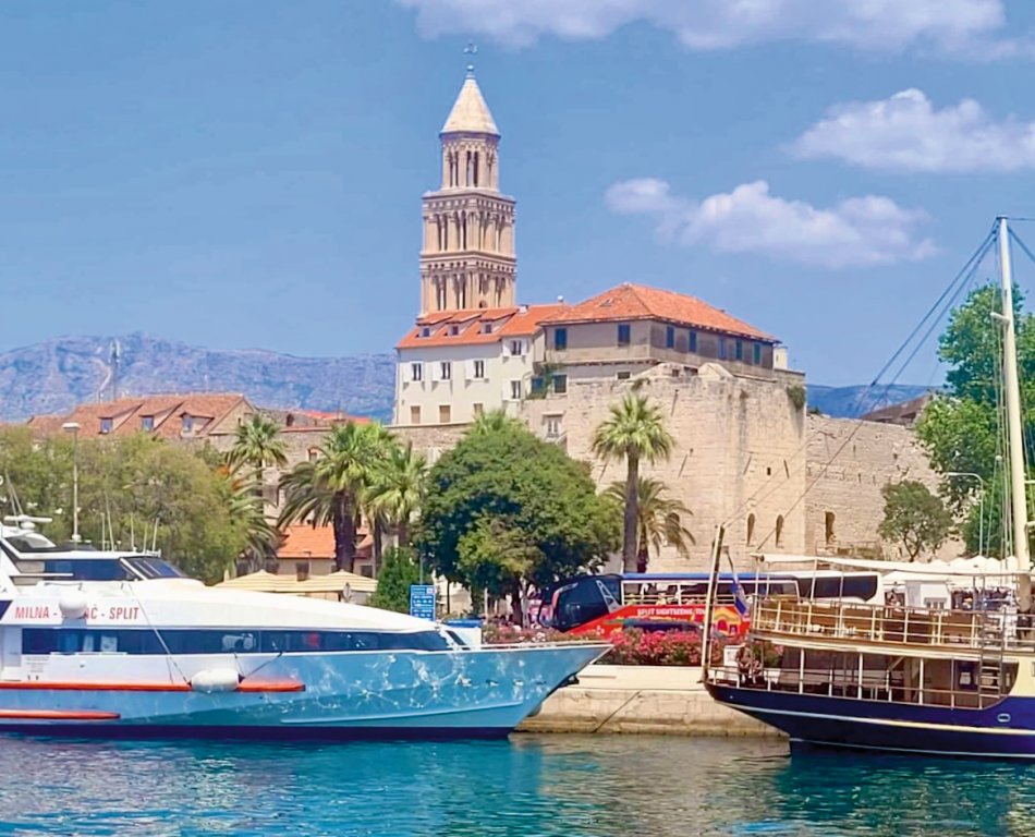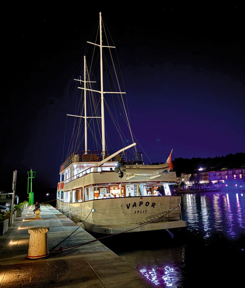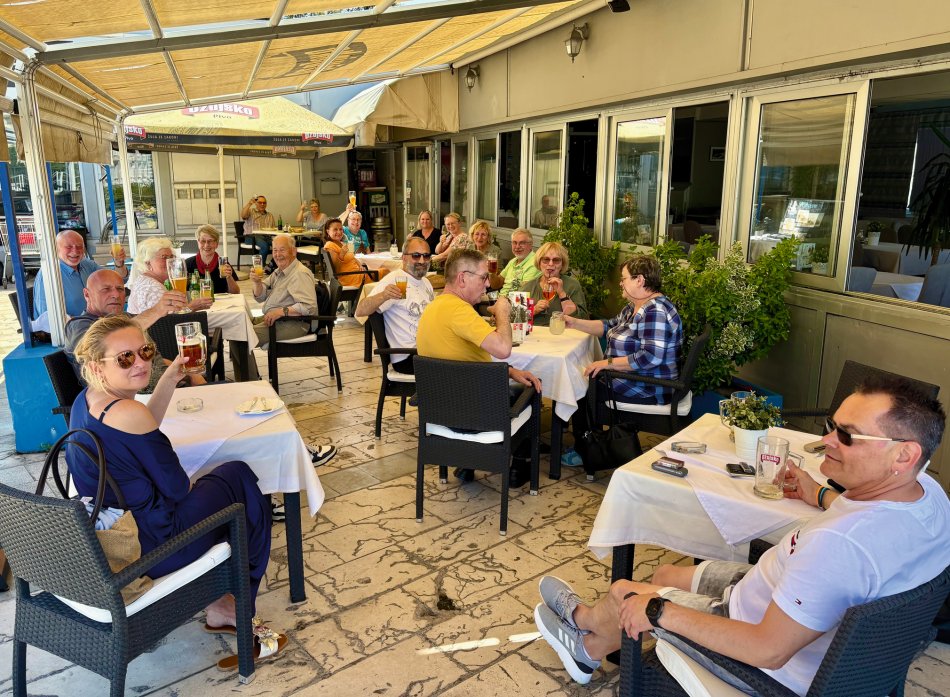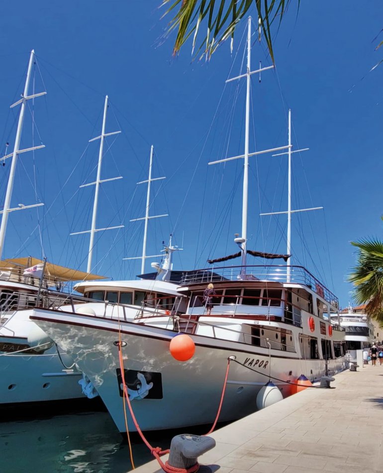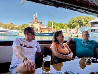 Herrlicher Sonnenschein empfing uns auch gestern früh wieder, als wir von unseren Kabinen in den Salon gingen, um in der Bucht von Pučišća, umgeben von den strahlend weißen Kalksteinhäusern, zu frühstücken. Dann ging es auch schon wieder weiter, abermals vorbei an den mächtigen Steinbrüchen, mit Kurs auf Split. Vor der trubeligen Hafenstadt haben wir ein letztes Mal geankert und unseren letzten Badestopp genossen. Das wird und allen wohl am Meisten fehlen. Gegen 12:00 Uhr ging es weiter, vorbei an zwei Kreuzfahrtriesen, die an der Pier lagen. Einstimmig haben wir beschlossen, dass wir unsere Vapor keinesfalls gegen so einen Passagierdampfer eintauschen wollen. Dann kam der Hafen von Split in Sicht, wo nach und nach die kleinen Minicruiser an der Pier festmachten. Es blieb Zeit zum Relaxen und Koffer packen, bevor wir uns um 17:30 Uhr zum Stadtrundgang trafen. Reiseleiterin Suzi zeigte uns den imposanten Palast des Diokletian und führte uns durch das Gewirr aus engen Gässchen zu den schönsten Sehenswürdigkeiten der Stadt. Der Spaziergang endete an der belebten Uferpromenade Riva, die mit zahlreichen Restaurants, Cafés und Bars aufwartete. Erstmal eine kleine Verschnaufpause bei einem spritzigen Aperol, bevor jeder seiner Wege zog. Einem kleinen Einkaufsbummel folgte die Einkehr in ein tolles Restaurant am Platz der Republik. Entlang der Riva ging es zurück zum Schiff, wo noch einmal die Gläser erklangen auf eine ganz fantastische Reise, die hinter uns liegt. Noch eine letzte Nacht an Bord, dann heißt es schon wieder Abschied nehmen von der tollen Crew, unserem Schiff und dem wundervollen Kroatien…