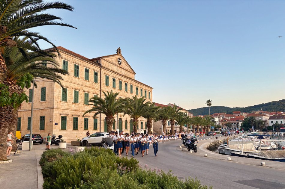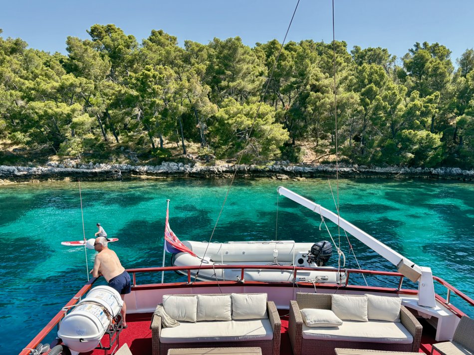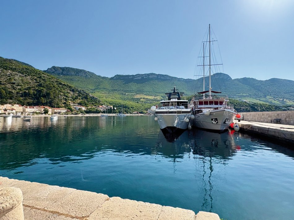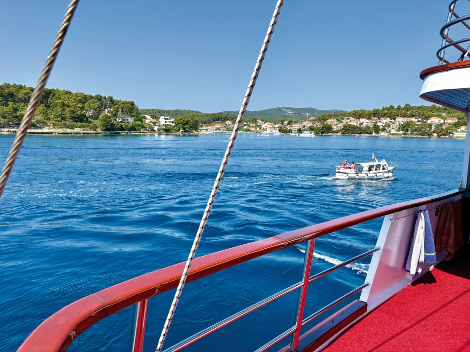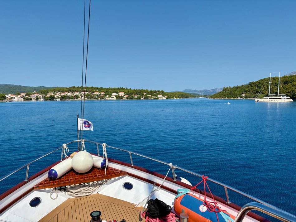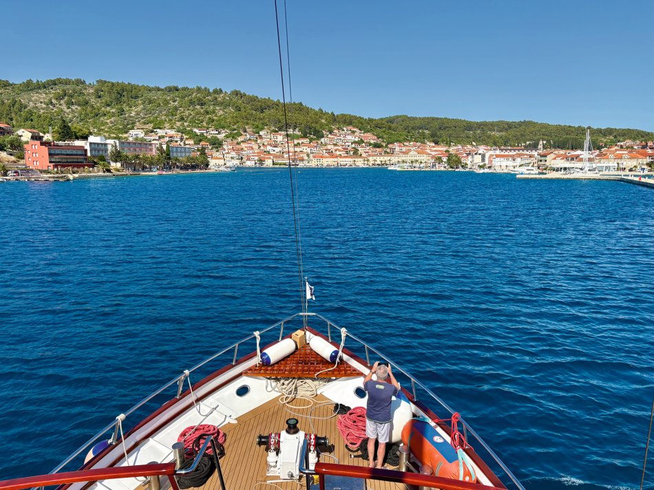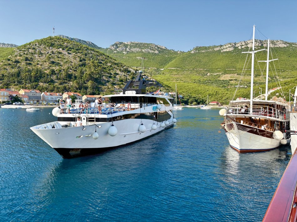 Bereits um 06:45 Uhr wurden gestern früh die Motoren gestartet. In Hvar herrscht immer viel Trubel und wir mussten mit unserem Schiff Platz machen, für die Fähren, die um 07:00 Uhr ankommen. Der Stadt Hvar vorgelagert befinden sich die Paklinski Inseln, die traumhaft schöne Buchten ausbilden – ideal für unseren ersten Badestopp! Bereits um 07:00 Uhr ankerten wir in einer herrlichen Bucht, die wir komplett für uns allein hatten. Einige Gäste nutzen bereits die Zeit vor dem Frühstück für einen Sprung in kühle Nass. Nach dem gemeinsamen Frühstück blieb genügend Zeit zum Schnorcheln, Schwimmen und Relaxen. Auch die zwei Stand-up-Paddle kamen zum Einsatz und sorgten für Spaß in der glasklaren und türkis glitzernden Adria. Um 11:15 Uhr verließen wir die Bucht und passierten die Stadt Hvar nochmals auf unserem Weg zur Insel Korčula . Bereits während des Mittagessens erreichten wir die Westseite der Insel, wo wir unseren zweiten Badestopp einlegten. Hier blieb Zeit bis 16:30 Uhr, um in der Sonne zu dösen, ein Buch zu lesen und zu schwimmen. Weiter ging es ins nur wenige Seemeilen entfernte Vela Luka, unseren Übernachtungshafen. Eine herrliche Promenade, die gespickt war mit zahlreichen Restaurants, Cafés und Bars lud zum Verweilen ein. Da gestern Nationalfeiertag war, waren zwar alle Geschäfte geschlossen, aber wir nutzten die Zeit für einen Spaziergang zur Kirche und dem herrlich angelegten Friedhof von Vela Luka. Anlässlich des Feiertages zog sogar noch ein kleiner Umzug durch die Straßen, der auf dem Platz vorm Glockenturm in einem Spektakel aus Musik und Tanz endete. Ein letztes Eis auf die Hand, bevor wir gemütlich zurück zum Schiff spazierten, wo der Abend noch feucht fröhlich bei dem ein oder anderen Getränk ausklang.