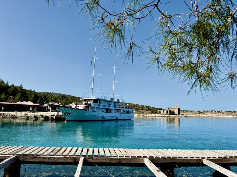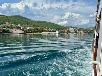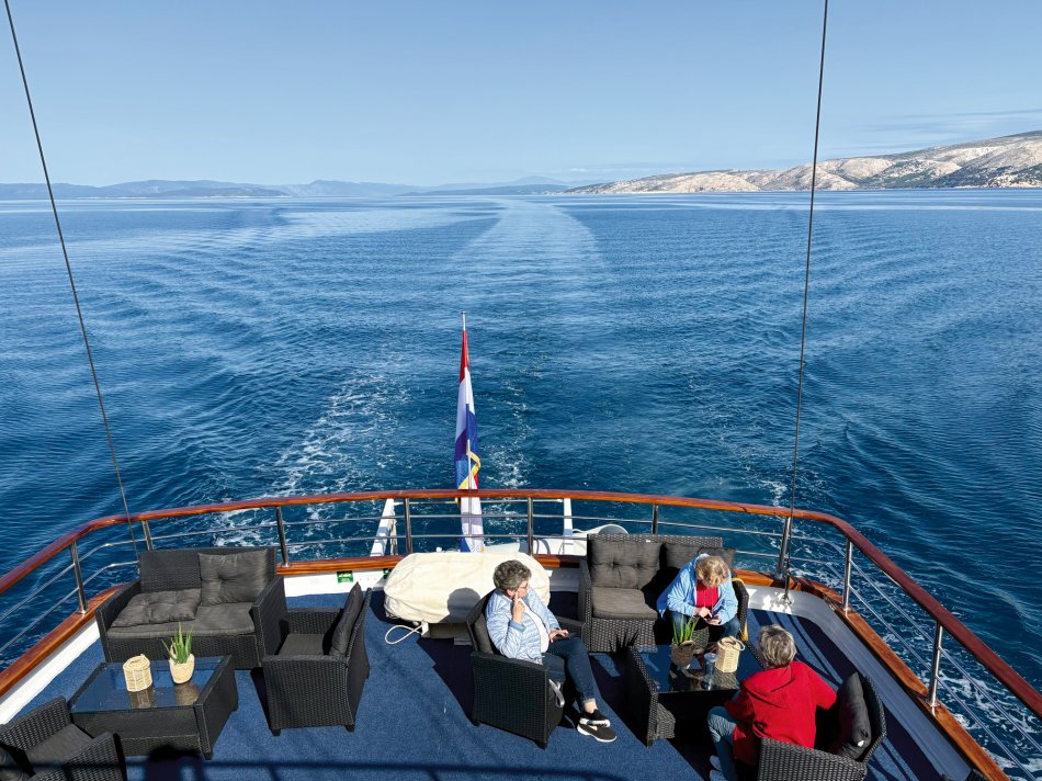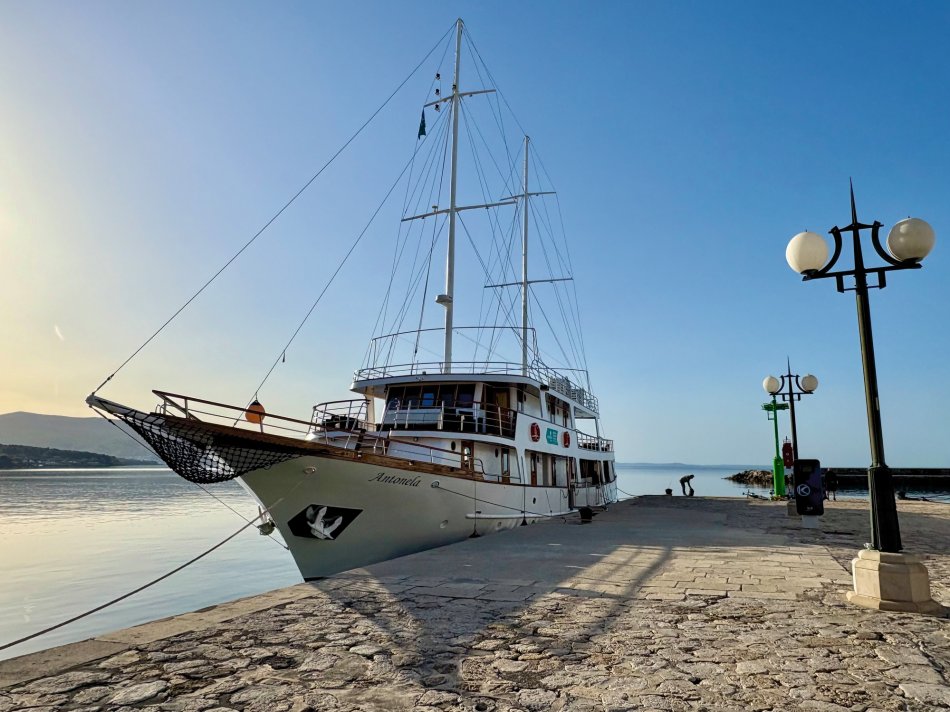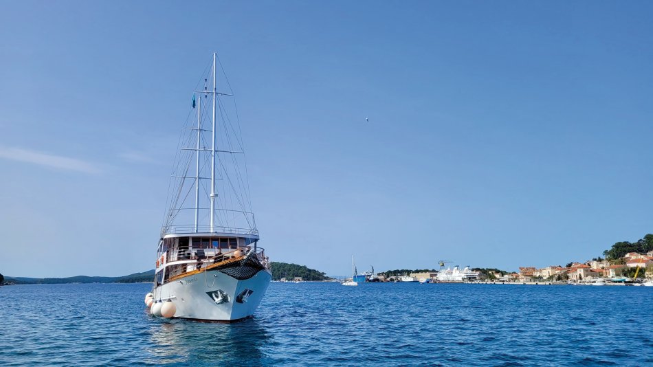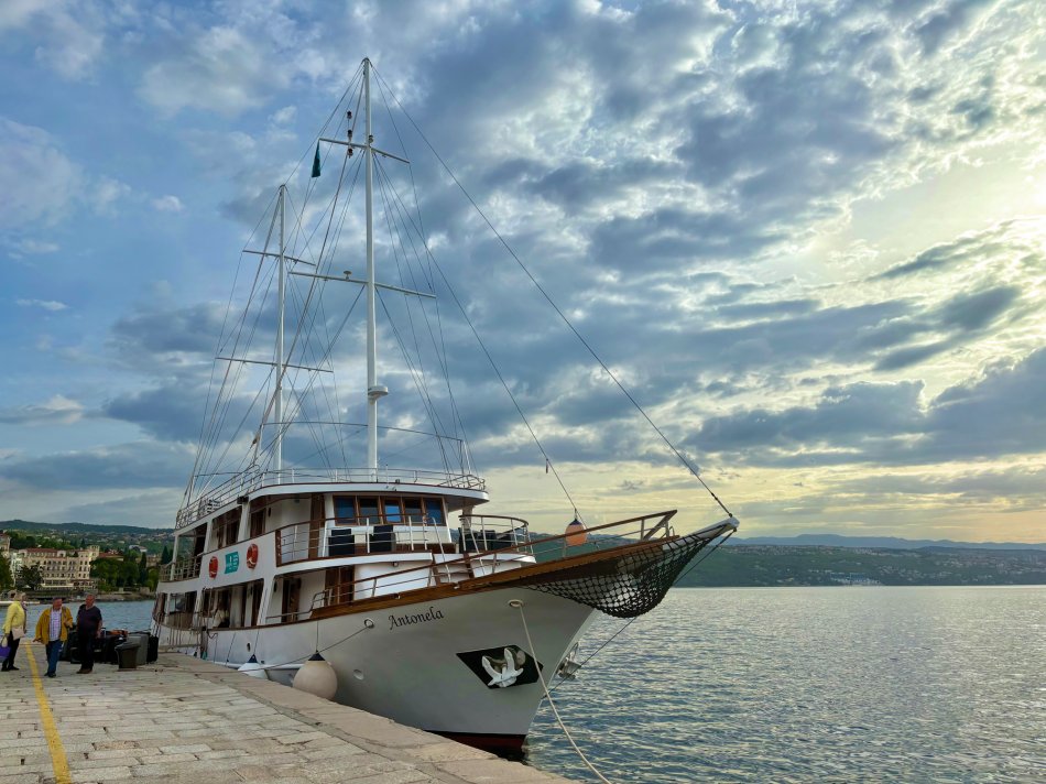 Nach einem gemütlichen Abend und einer ruhigen Nacht haben wir die hübsche Altstadt von Rab gegen 08:00 Uhr verlassen. Herrlicher Sonnenschein begleitete uns zum Frühstück und während unserer Fahrt zur Insel Ilovik. Alle genossen die wärmenden Sonnenstrahlen auf der Haut und hatten schnell ihren Lieblingsplatz an Deck gefunden. Gegen 11:00 Uhr haben wir den Ilovik-Kanal erreicht und im gleichnamigen Örtchen fest gemacht. Mit nur 6 km² Größe und rund 100 Einwohnern ist die autofreie Insel ein verstecktes Juwel für Naturbegeisterte. Nicht selten wird das Eiland auch als „Insel der Blumen“ bezeichnet, wovon wir uns eindrucksvoll bei einem Spaziergang überzeugen konnten – eine herrliche Blütenpracht, wohin aus Auge schaute…Nach der individuellen Erkundung trafen sich alle Gäste auf ein Erfrischungsgetränk in der Konoba Oliva. Bei Bier, Aperol Spritz und Kaffee genossen wir die Sonne und den Blick auf die Adria. Nach dem Mittagessen ging es weiter. Während jeder ein bisschen ausruhte und die vorbeiziehende Landschaft genoss, haben wir Kurs auf die Insel Losinj genommen. Wir passierten die Halbinsel Cikat und machten gegen 16:00 Uhr im geschützten Hafen der Augustusbucht fest. Anschließend erwartete Reiseleiterin Sandra unsere Gruppe zum kleinen Stadtspaziergang durch Mali Losinj. Beeindruckend ist die Kirche, die über dem Städtchen thront und die herrliche Promenade, die gespickt ist mit zahlreichen Restaurants und Cafés. Nach dem Rundgang stand der Rest des Tages zur freien Verfügung. Mit Blick auf die vielen kleinen Boote, die im Hafenbecken lagen, ließ sich jeder sein Abendessen schmecken, bevor wir uns alle noch mal an Bord auf einen Absacker eingefunden haben.