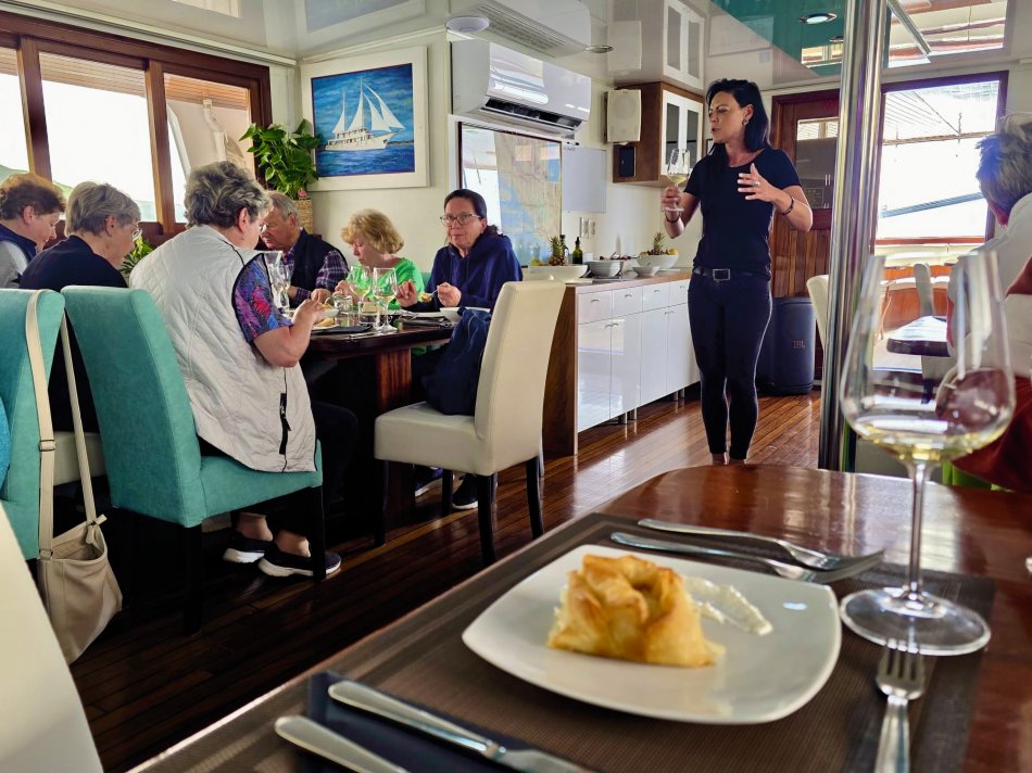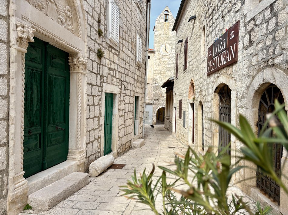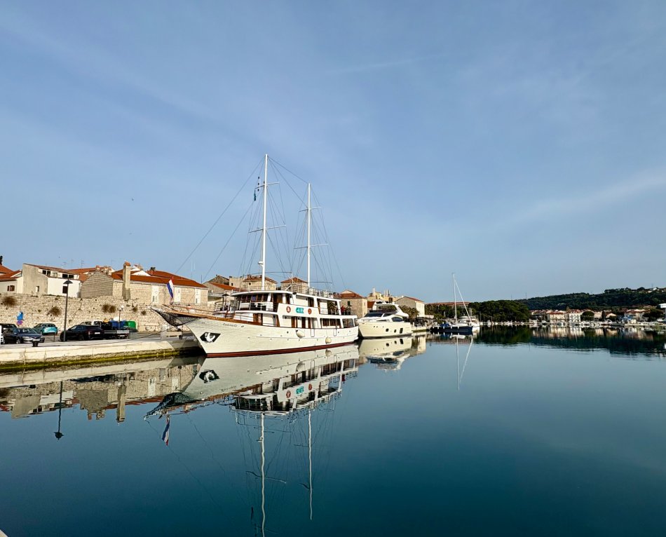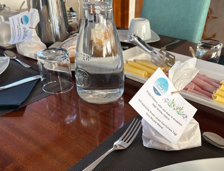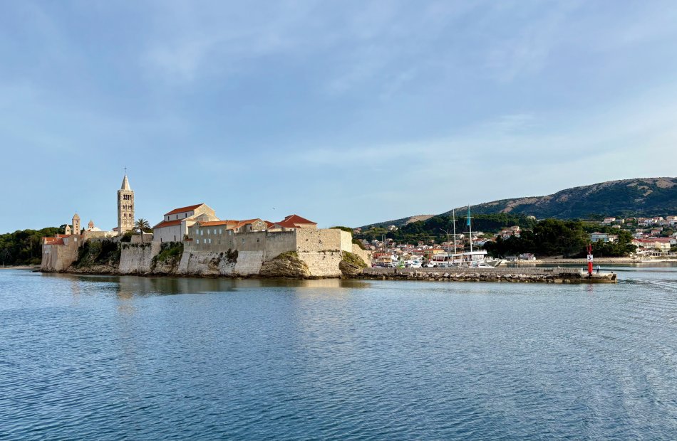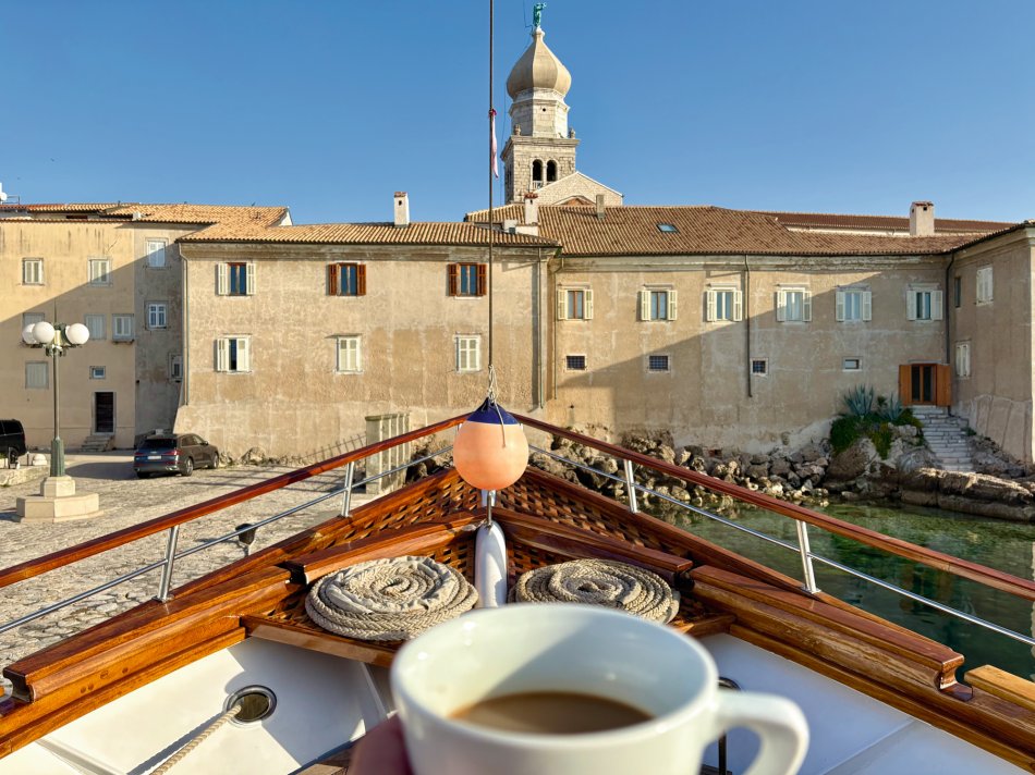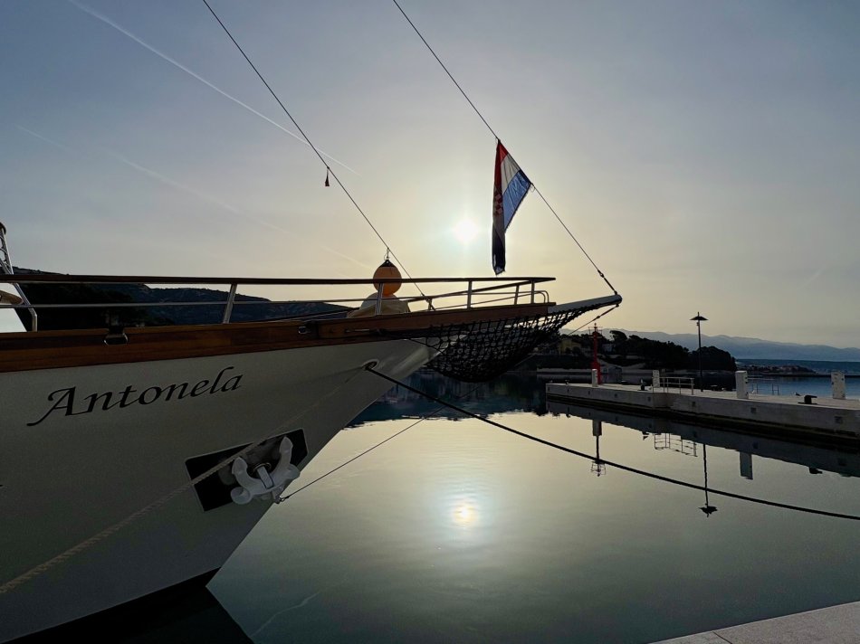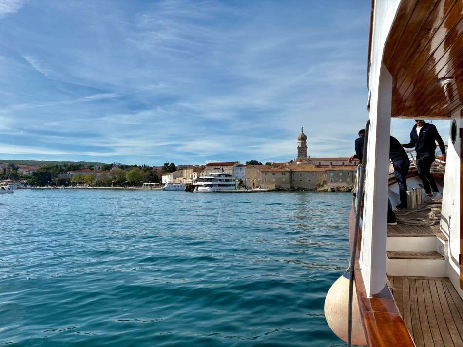Bei strahlendem Sonnenschein empfing uns der Morgen in Krk-Stadt. Der Time to Travel Osterhase war auch schon an Bord unterwegs und hat für jeden Gast und jedes Crewmitglied eine Kleinigkeit dagelassen. Nach dem Frühstück haben wir bei spiegelglatter See Kurs auf die kleine Insel Sveti Grgur genommen, die von 1948 bis 1988 Frauengefängnisinsel für politische Straftäterinnen war. Heute wird das Eiland nur von zahmem Dammwild bewohnt. Wir wurden empfangen von idyllischer Ruhe, dem Zirpen der Zikaden und glasklarem Wasser. Wir nutzten die Zeit für einen ausgiebigen Spaziergang und zum Erkunden des ehemaligen Gefängniskomplexes. Anschließend war Zeit zum Relaxen an Bord oder ein Sonnenbad am Kiesstrand, bevor es zum Mittagessen weiter ging Richtung Insel Rab. Bei ruhiger See und herrlichem Sonnenschein fand jeder sein Lieblingsplätzchen an Bord, während wir an der Pier in Rab-Stadt festmachten. Unmittelbar im Anschluss empfing uns Reiseleiter in Natali zur Verkostung der Raber Torte. Vilma hat unseren Gästen eindrucksvoll bei einer Vorführung erklärt, wie das traditionelle Gebäck hergestellt wird. Natürlich wurde auch verkostet und der ein oder andere hat direkt ein Mitbringsel für die Daheimgebliebenen ergattert. Anschließend nahm uns Natali mit auf einen Streifzug durch die „Stadt der Türme“. Herrlich blüht hier alles schon in bunter Pracht. Der Rest des Tages stand zur freien Verfügung. Zahlreiche kleine Konoben und Restaurants haben bereits geöffnet. Wir haben uns für die Konoba Kod Kinzea entschieden, die in urigem Ambiente vorzügliche kroatische Gerichte serviert. Am Schiff klang der Abend dann gemütlich aus.