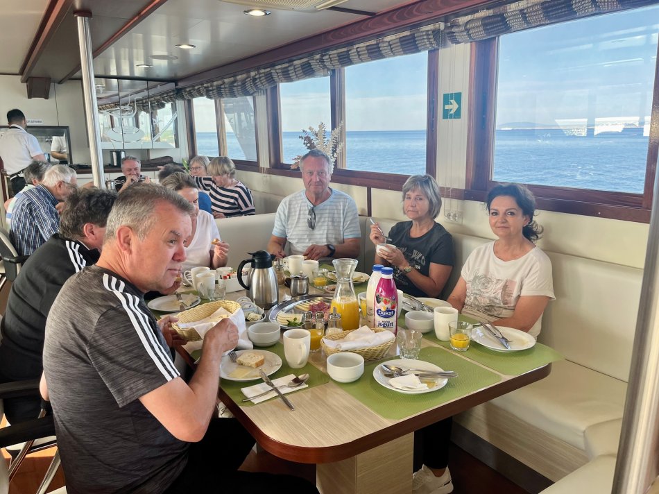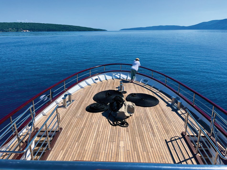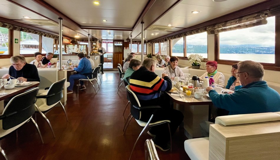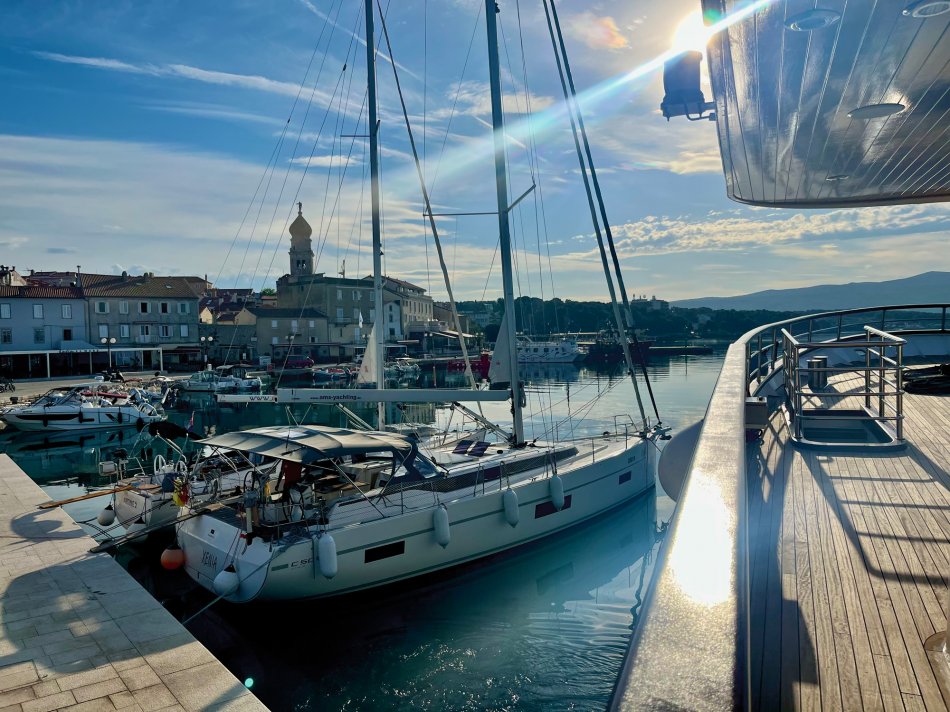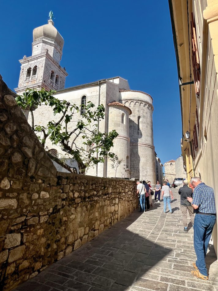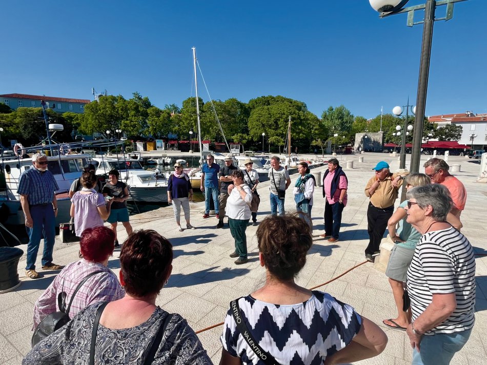 Wir haben das Hotel Mirjana & Rastoke nach einem erneut vorzüglichen Frühstück um 9:00 Uhr verlassen und die 170 km bis zum nach Opatija gemütlich zurück gelegt. Unser Bus parkte am Busbahnhof Slatina, das Gepäck wurde selbstverständlich zum Schiff transferiert und wir sind mit den Gästen entlang des Lungomare, durch den Stadtpark bis zum Hafen spaziert. Herrliches Wetter und der Blick auf die in der Sonne glitzernde Adria und dann lag sie auf einmal vor uns, MS Olmissum, unser komfortables Zuhause für die nächsten Tage. Ein tolles Schiff mit 35 m Länge, 17 Kabinen, einem lichtdurchfluteten Salon mit angrenzenden Loungebereich und einem großzügigem Sonnendeck mit bequemen Liegen und Sitzgruppen. Nach einer herzlichen Begrüßung und einem ersten Mittagessen nahmen wir direkt Kurs auf die Insel und gleichnamige Stadt Krk, die wir nach unserer Ankunft um 16:30 Uhr mit Reiseleiterin Slavica bei einem gemütlichen Spaziergang erkundet haben. Durch das mittelalterliche Stadttor gelangten wir ins 2.000 Jahre alte Stadtzentrum mit engen Gässchen, gespickt mit kleinen Boutiquen und Souvenirläden, der Kathedrale und der alten Festung. Unser Rundgang endete an der lebhaften Uferpromenade, wo sich unsere Wege trennten. Der Rest des Tages stand zur freien Verfügung. Nach einem erfrischenden Bevanda mit Blick auf unser Schiff, einer großen Portion Miesmuscheln Buzara und dem Besuch im Serect Garden Volsonis haben wir um Mitternacht sogar noch eine Bar mit kroatischer Live-Musik direkt am Hafen gefunden. Hier haben wir uns unter die Einheimischen gemischt und die herzliche Atmosphäre genossen. Um 01:30 Uhr hieß es dann "laku noc" - Gute Nacht.