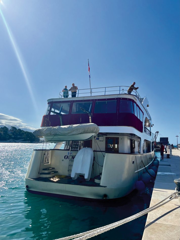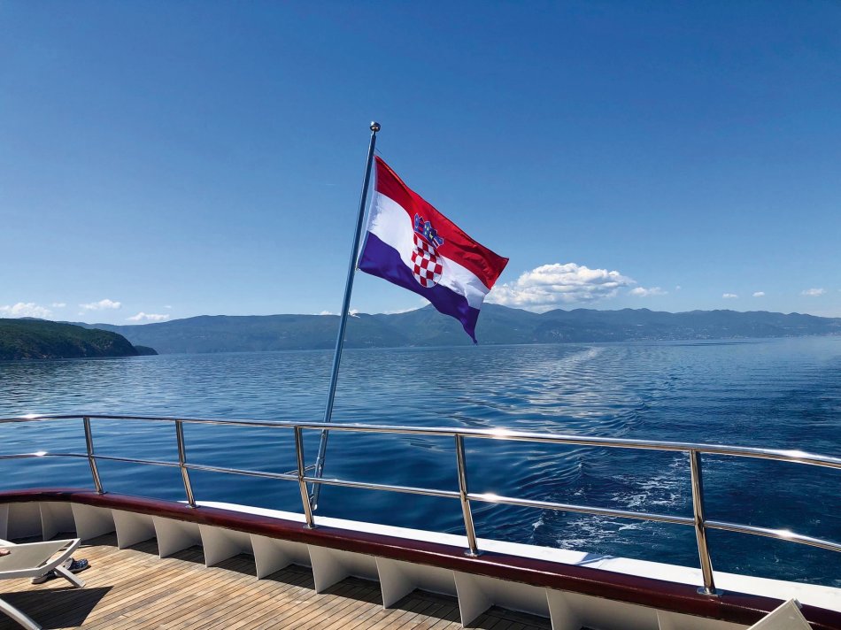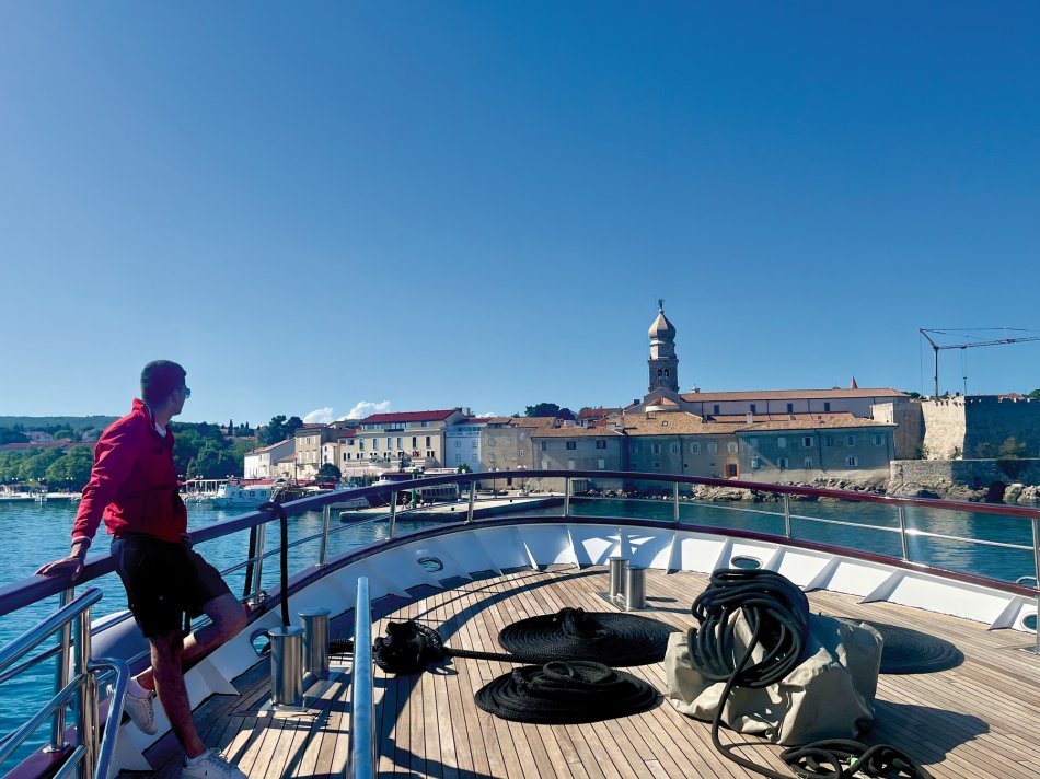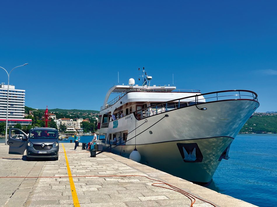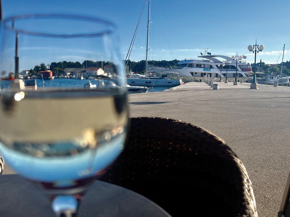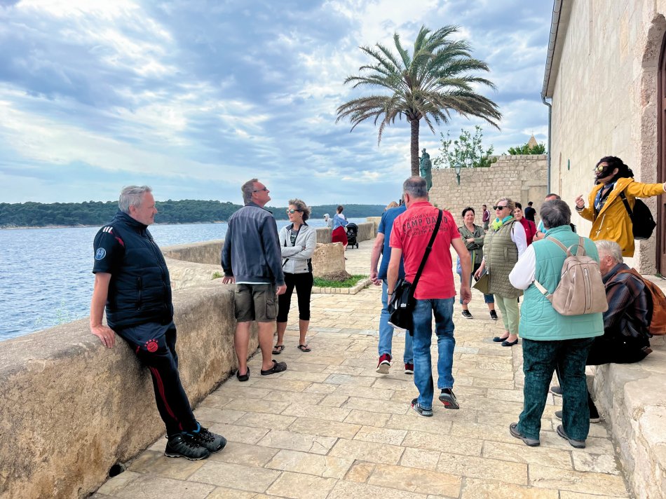 Wir haben das Hotel Mirjana & Rastoke nach einem erneut vorzüglichen Frühstück um 9:00 Uhr verlassen und die 170 km bis zum nach Opatija gemütlich zurück gelegt. Unser Bus parkte am Busbahnhof Slatina, das Gepäck wurde selbstverständlich zum Schiff transferiert und wir sind mit den Gästen entlang des Lungomare, durch den Stadtpark bis zum Hafen spaziert. Herrliches Wetter und der Blick auf die in der Sonne glitzernde Adria und dann lag sie auf einmal vor uns, MS Olmissum, unser komfortables Zuhause für die nächsten Tage. Ein tolles Schiff mit 35 m Länge, 17 Kabinen, einem lichtdurchfluteten Salon mit angrenzenden Loungebereich und einem großzügigem Sonnendeck mit bequemen Liegen und Sitzgruppen. Nach einer herzlichen Begrüßung und einem ersten Mittagessen nahmen wir direkt Kurs auf die Insel und gleichnamige Stadt Krk, die wir nach unserer Ankunft um 16:30 Uhr mit Reiseleiterin Slavica bei einem gemütlichen Spaziergang erkundet haben. Durch das mittelalterliche Stadttor gelangten wir ins 2.000 Jahre alte Stadtzentrum mit engen Gässchen, gespickt mit kleinen Boutiquen und Souvenirläden, der Kathedrale und der alten Festung. Unser Rundgang endete an der lebhaften Uferpromenade, wo sich unsere Wege trennten. Der Rest des Tages stand zur freien Verfügung. Nach einem erfrischenden Bevanda mit Blick auf unser Schiff, einer großen Portion Miesmuscheln Buzara und dem Besuch im Serect Garden Volsonis haben wir um Mitternacht sogar noch eine Bar mit kroatischer Live-Musik direkt am Hafen gefunden. Hier haben wir uns unter die Einheimischen gemischt und die herzliche Atmosphäre genossen. Um 01:30 Uhr hieß es dann "laku noc" - Gute Nacht.